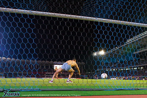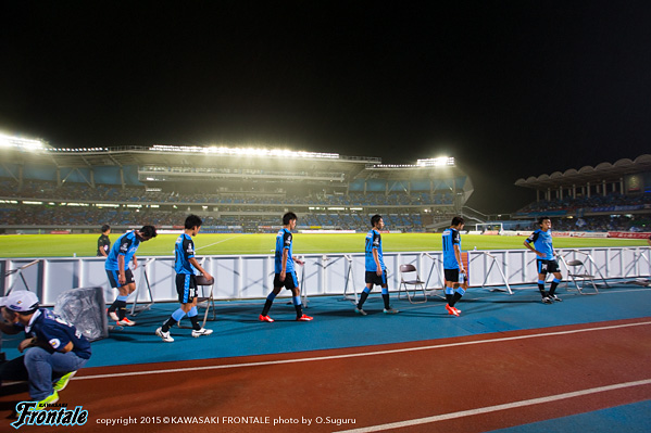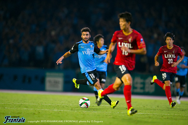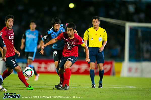 フロンターレのスターティングメンバーは、トップに大久保、その下に中村、中盤左に杉本、右にマイア、ボランチは山本と大島のコンビ、最終ラインは車屋-谷口-井川-エウシーニョ、GK新井。立ち上がり1分、フロンターレの攻撃。左サイドから崩しをかけてパスをつなぎエリア内に入るが、中村のラストパスはブロックされる。4分、鹿島の攻撃。右サイド裏のスペースを狙われるが、金崎には谷口がしぶとく対応。6分、フロンターレの攻撃。セカンドボールを拾って押し込むが、ラストパスにつながらず。7分、鹿島の攻撃。中盤でボールを奪われるが、エウシーニョが戻り奪い返し対応。8分、フロンターレの攻撃。中盤でボールカット。カウンターを狙うがラストパスにつながらず。9分、鹿島の攻撃。左サイド裏のスペースを狙われカイオに折り返されるが、井川が対応。11分、フロンターレの攻撃。パスを細かくつなぎ右サイド裏のスペースに抜け出した中村が決定的な折り返しを送るが、惜しくもゴール前に合わず。12分、鹿島の攻撃。パスをつながれ右サイドからクロスを入れられるが、谷口がクリア。13分、フロンターレの攻撃。大島がドリブルをしかけてペナルティエリア内に入るが、DFに止められる。16分、中盤左からのフリーキックの場面。マイアのボールはGKにキャッチされる。17分、鹿島の攻勢をしのぎ、中村が中盤から右サイド裏のスペースへボールを入れるがエウシーニョはオフサイドの判定。19分、フロンターレの攻撃。中盤でカットしたマイアを起点にカウンターをしかけ、中村の縦パスを受けた杉本が左サイドから切れ込みながらシュートに持ち込むがDFにブロックされる。21分、中盤でルーズボールを拾い、マイアが右サイドをドリブル突破。折り返しに走り込んだ大久保が合わせるが、シュートは大きく外れる。23分、鹿島の攻撃。中盤右からのフリーキックの場面。遠藤のボールは杉本がクリア。セカンドボールを拾われるが守備陣がしのぐ。24分、フロンターレの攻撃。鹿島の攻勢をしのぎカウンターへ。マイアがスルーパスを入れるが杉本には合わず。24分、鹿島の攻撃。直後に逆襲を受け、左サイドの山本脩に折り返しを狙われるが、エウシーニョがブロック。25分、さらにボールを奪い返され柴崎にミドルシュートを打たれるが、ゴール左に外れる。