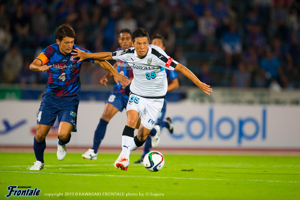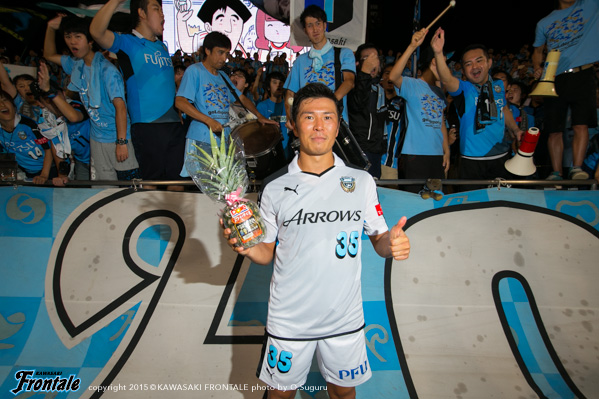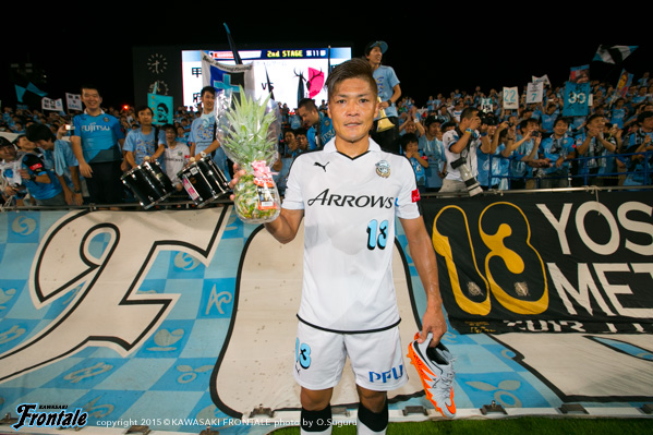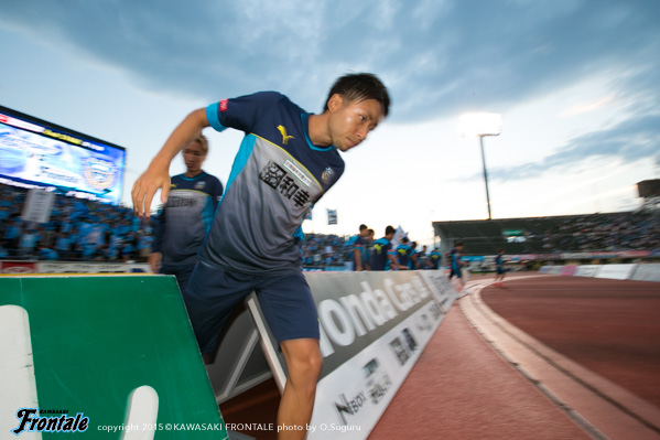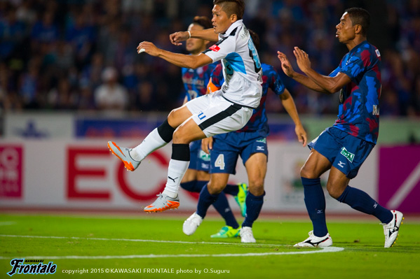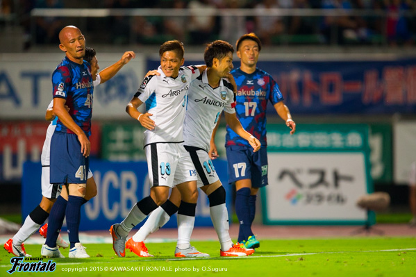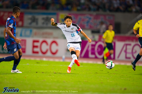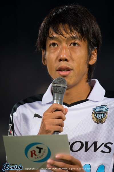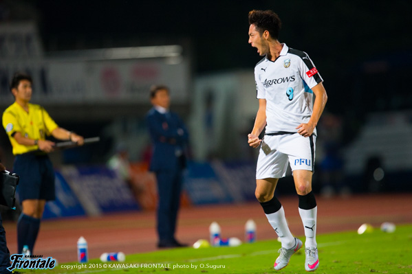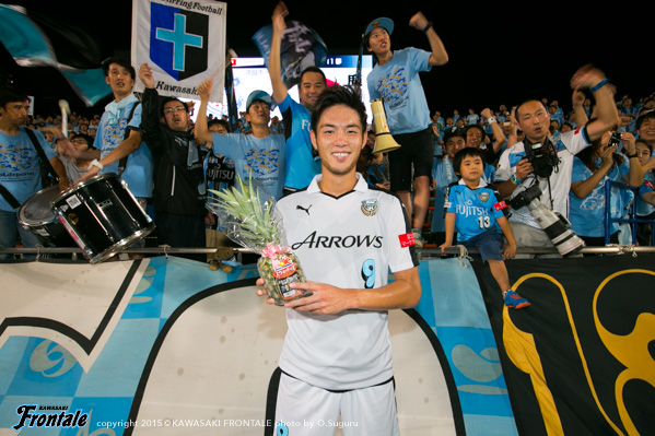 - ケガは打撲。たぶん大丈夫。今日は楽しかった。ヨシトさん(大久保嘉人)、ケンゴさん(中村憲剛)、タッピー(田坂祐介)、リョウタ(大島僚太)と足下がうまい選手がいて、自分としてはすごくやりやすかった。まず裏のスペースを狙うという自分の特徴を出せたと思う。最後は守る時間が多くなって体力的にきつかったが、みんなで声を掛け合って守りきることができた。1点目はケンゴさん(中村憲剛)に落とそうと思っていたが、自分で行けそうだったし、相手の股が見えたのでそこを通してという形でアシストが出来た。2点目は角度的にも厳しかったので、マイナスに落としたという感じ。チームとしてもいい勝ち方ができたと思うし、これから乗っていけるような雰囲気になった。ラストパスが合えばもっと点が取れそうな感じがあるので、みんなとコミュニケーションを取りながらやっていきたい。