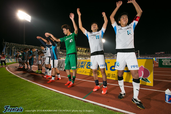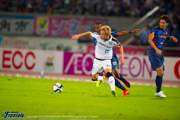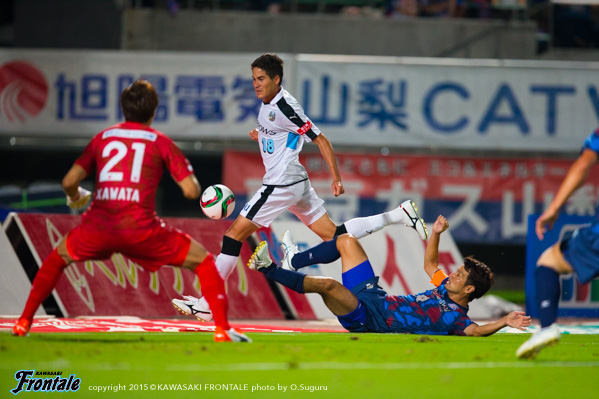 後半もフロンターレがボールを握り、甲府がロングボールやカウンターを狙う展開が続くが、セットプレーの流れから田坂のゴールで勝ち越し。その後は甲府に反撃をかけられるが、終盤小林の粘りから杉本がダメ押しとなる3点目を決め、アウェイで連敗をストップさせた。
