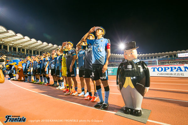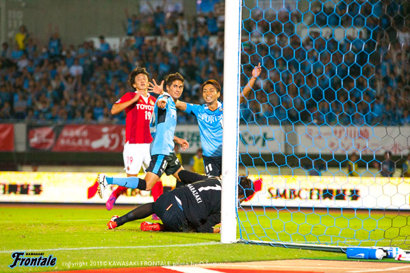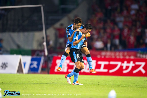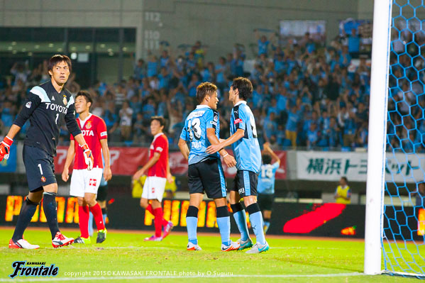 後半もフロンターレが攻勢をかけてエウシーニョのゴールで追加点を奪い、さらに大久保がゴールを奪い5点目。怪我で10人となった名古屋に1点を返されるが、アディショナルタイムに大久保がハットトリックとなるゴールを決めて6-1の大勝。等々力で勝点3を手に入れた。