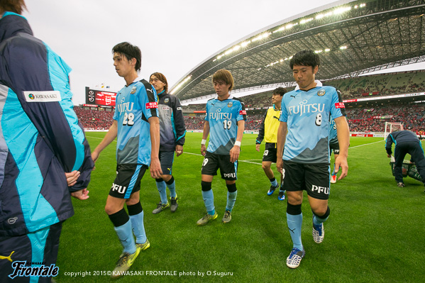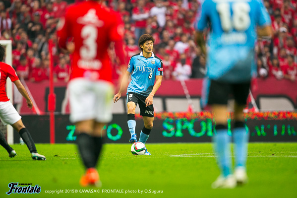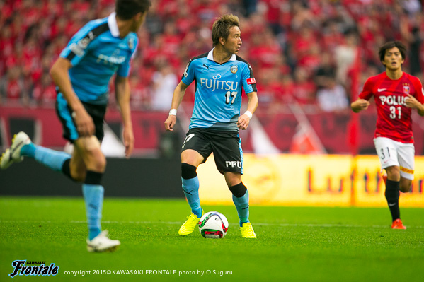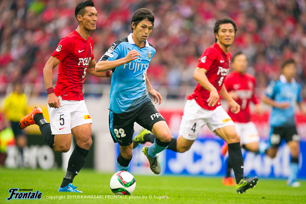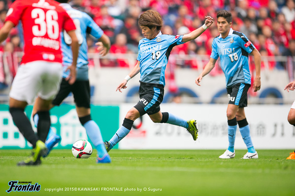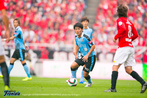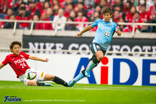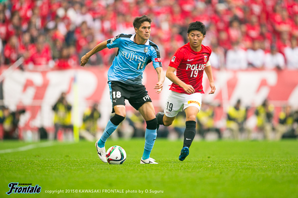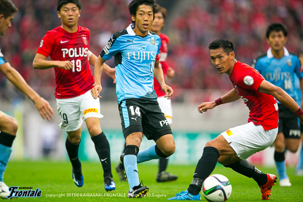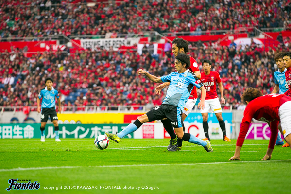 フロンターレのスターティングメンバーは、小林と船山の2トップ、その下に中村、中盤左に中野、右にエウシーニョ、ボランチは森谷と大島のコンビ、最終ラインは車屋-谷口-武岡、GK新井。3分、浦和の攻撃。左サイドから崩しをかけられペナルティエリア内にボールを入れられるが、GK新井が飛び出し対応。4分、柏木の左コーナーキックは森谷がクリア。5分、中盤左からのフリーキックの場面。柏木のボールは中野がクリア。6分、フロンターレの攻撃。中央でのこぼれ球に反応した森谷がミドルシュートを放つがDFにブロックされる。7分、浦和の攻撃。直後にカウンターを狙われるが、車屋が戻りながら対応。8分、フロンターレの攻撃。中村の斜めへのパスに反応した小林が右サイドでボールを受けるが、シュートに持ち込めず。9分、浦和の攻撃。ダイレクトパスをつながれ速攻を狙われるが、ズラタンには谷口が対応。10分、セカンドボールを拾われ右サイド関根に決定的なクロスが入れられるが、ボールはゴール前を通過。危ない場面だった。12分、右サイドから崩しをかけられるが大島と中野で対応。13分、裏のスペースを突かれ武藤に左サイドからシュートを打たれるがGK新井がセーブ。こぼれ球もクリア。ピンチをしのぐ。14分、フロンターレの攻撃。左サイドから崩しをかけ、中野のスルーパスに車屋が走り込むがGKにキャッチされる。15分、中村が左サイドから浮かし球を入れ、小林がヘッドで流すが船山には通らず。16分、エウシーニョを起点に中央で細かくパスをつなぎ、森谷が右サイドからシュートを放つが惜しくもブロックされる。17分、左ショートコーナーから中村がクロスを入れるが、GKにキャッチされる。18分、中盤でパスカット。カウンターから森谷がドリブルで持ち込むが、惜しくもスルーパスは通らず。19分、浦和の攻撃。自陣でボールカットされ、前線のズラタンにボールが入るが谷口が対応。19分、パスをつながれ押し込まれるが武岡がブロック。20分、左サイドから切れ込んだ槙野にミドルシュートを打たれるが、ゴール上に外れる。21分、フロンターレの攻撃。中村のスルーパスに抜け出した船山が左サイドから戻し、中野がシュートを放つがDFにブロックされる。22分、浦和の攻撃。自陣でルーズボールを拾われゴール前にボールが入るが、そのままラインを通過。23分、右サイドから崩しをかけられクロスが入るが森谷がクリア。