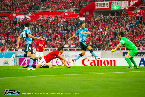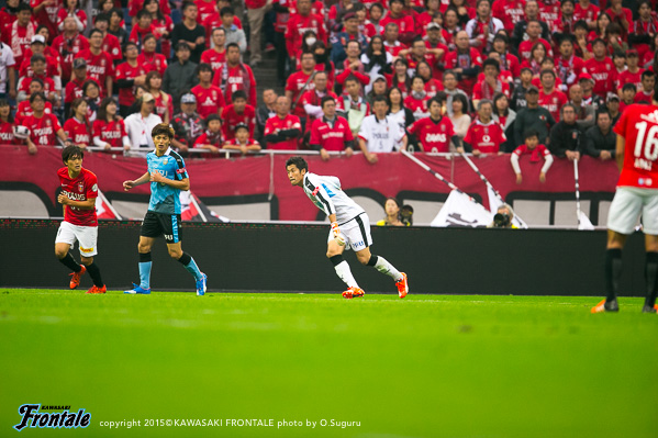 後半のスタートから船山に代えて田坂を投入。49分、フロンターレの攻撃。左サイドからのフリーキックの場面。森谷のボールはクリアされる。50分、浦和の攻撃。自陣でボールを奪われ宇賀神のクロスから混戦となり、さらに右サイド関根の折り返しをズラタンに合わせられるが、ボールはゴール右に外れる。危ない場面だった。51分、フロンターレの攻撃。田坂がドリブル突破。右サイドに回り込みながらクロスを入れ、ゴール前で混戦となるがDFにかき出される。53分、浦和の攻撃。柏木の縦パスからペナルティエリア前で混戦となるが、守備陣が対応。53分、フロンターレの攻撃。左サイドから崩しをかけ、小林が抜け出しを狙うがDFに止められる。54分、森谷の左コーナーキックはクリアされる。54分、浦和の攻撃。直後に決定的なカウンターを受け、DFをかわした武藤にシュートを打たれるがGK新井の好セーブでどうにかしのぐ。55分、フロンターレの攻撃。自陣からパスをつなぎ田坂が浮かし球を入れるが、小林には収まらずブロックされる。56分、浦和の攻撃。速攻をしかけられ一気にゴール近くに迫られるが、守備陣が対応。58分、関根にドリブル突破を狙われるが、大島が戻りながら対応。59分、中盤右サイドからのフリーキックの場面。柏木のボールはGK新井がパンチングでしのぐ。61分、フロンターレの攻撃。スローインの流れから小林が左サイドから折り返すがDFにクリアされる。62分、左サイドから崩しをかけ、抜け出した車屋が折り返すがクリアされる。63分、スルーパスに抜け出したエウシーニョが右サイドで粘り、中村の戻しを森谷がダイレクトで合わせるが惜しくも大きく外れる。65分、小林が負傷。急きょ小宮山がピッチに入り、最終ラインへ。67分、フロンターレの攻撃。相手GKのロングキックにエウシーニョが反応。中村がヘッドで流すが、ゴール前に入り込んだエウシーニョには届かず。68分、左サイドから崩しをかけ、田坂とのコンビネーションから中野が抜け出すが惜しくもオフサイドの判定。70分、浦和の攻撃。自陣でボールを奪い返され押し込まれるが、守備陣が対応。71分、左サイド槙野にドリブルをしかけられ折り返されるがGK新井がキャッチ。
