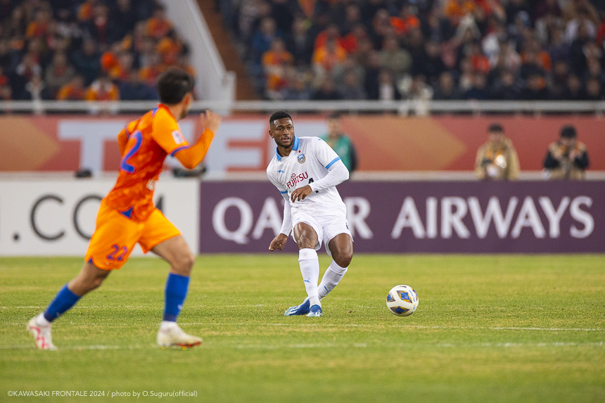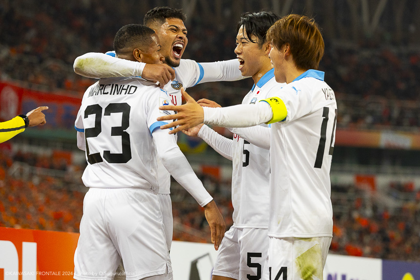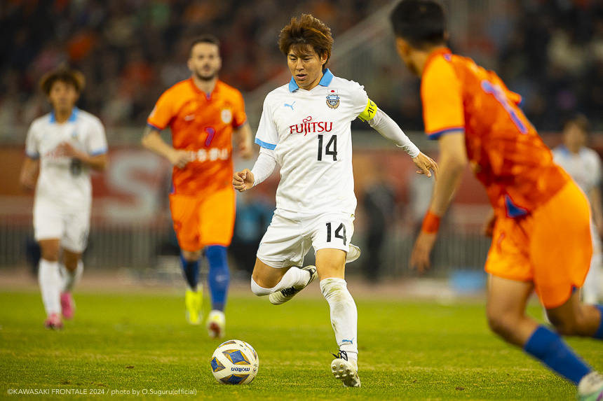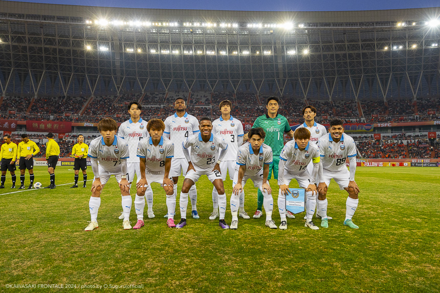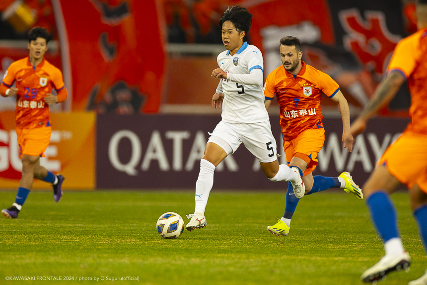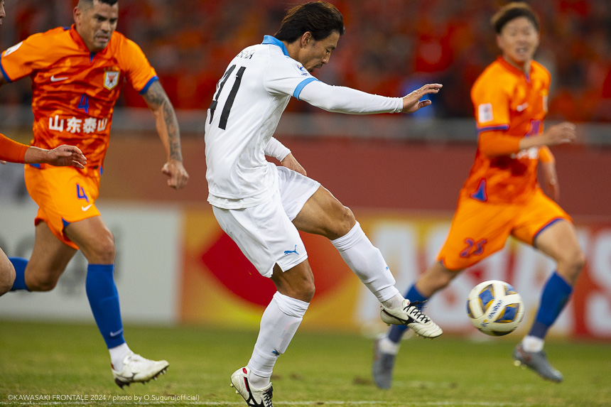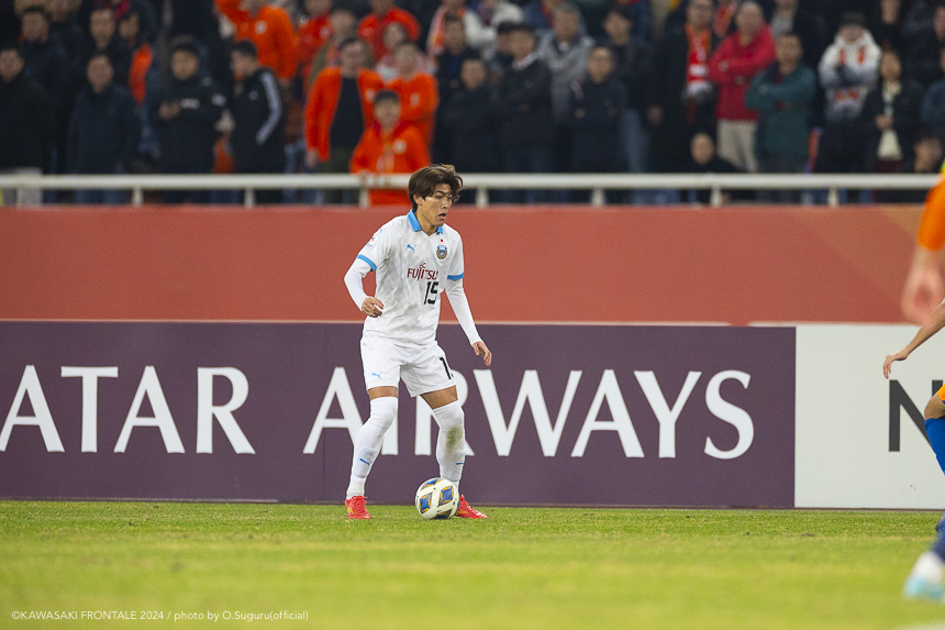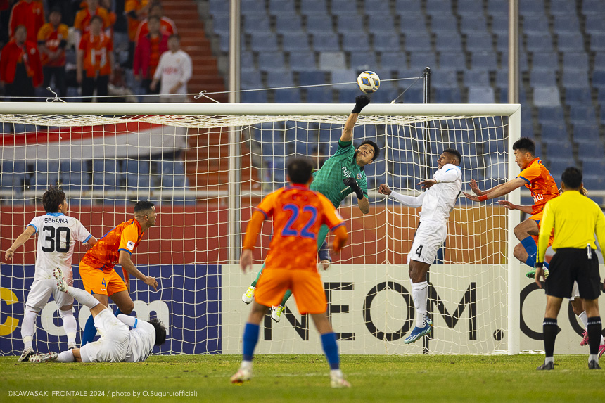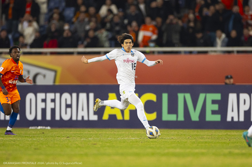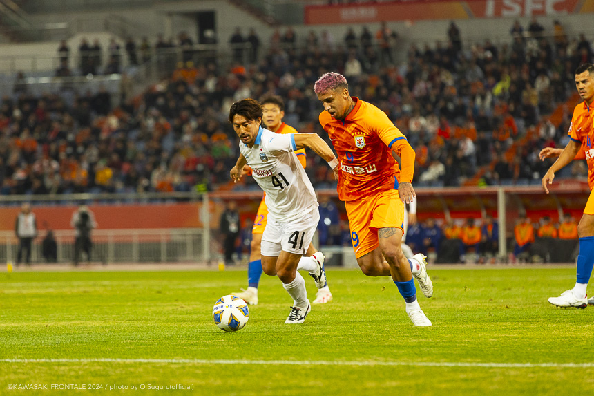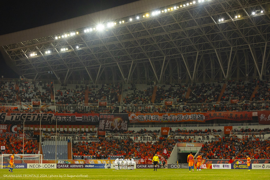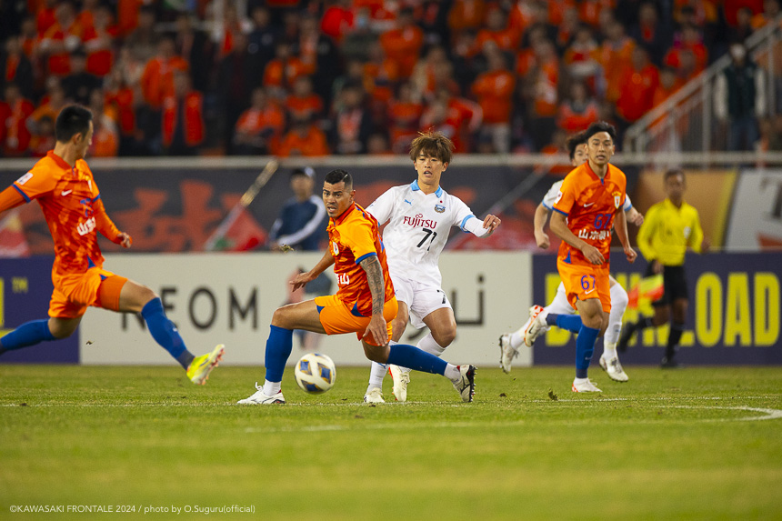 フロンターレのスターティングメンバーはトップにエリソン、左ワイドにマルシーニョ、右に家長、インサイドハーフに山本、脇坂、アンカーに橘田、最終ラインは瀬川-大南-ジェジエウ-佐々木、GKソンリョン。1分、山東の攻撃。前線にルーズボールが出るがGKソンリョンが飛び出しクリア。4分、中盤でカットされカウンターを狙われるが、瀬川が戻りながら対応。5分、自陣でボールを奪い返されてシュートに持ち込まれるが、GKソンリョンのセーブでしのぐ。6分、速攻から左サイドに展開され、リウ ヤンのボールがゴールに向かうが、ソンリョンが触りコーナーキックに逃れる。8分、早いリスタートからクリザンにミドルシュートを打たれるがGKソンリョンのセーブでしのぐ。8分、左コーナーキック。リー ユアンイーのボールはGKソンリョンが飛び出して触る。9分、フロンターレの攻撃。直後に速攻からマルシーニョがボールを運び、右サイド山本がシュートに持ち込むがゴール上に外れる。10分、山東の攻撃。ボールを奪い返され、右サイドからクロスが入るがボールはゴール前を通過。11分、左サイドからクロスが入り、ゴール前で混戦となるが守備陣が耐える。12分、中盤でインターセプトされてミドルシュートを打たれるがGKソンリョンのセーブでしのぐ。14分、フロンターレの攻撃。脇坂が右サイドに展開。家長からボールを受けた脇坂が深い位置から速いボールを入れるが止められる。14分、右コーナーキック。脇坂のボールが入るが、うまく合わせられず。16分、佐々木が中盤右サイドからドリブルで中央に入るがフィニッシュにつながらず。17分、山東の攻撃。中盤でインターセプトされ、背後のスペースを狙われるがGKソンリョンが飛び出しクリア。18分、フロンターレの攻撃。右サイドから崩しをかけて佐々木が折り返すがゴール前に合わず。19分、中央にボールが入り、エリソンが右足でシュートを放つがゴール上に外れる。20分、左コーナーキック。脇坂のボールにエリソンが飛び込むがGKにキャッチされる。