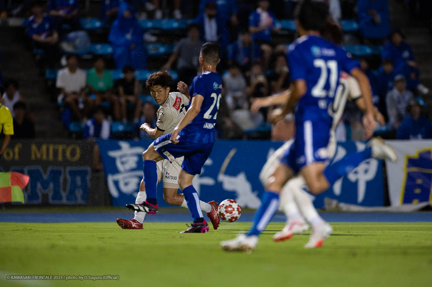 フロンターレのスターティングメンバーはトップに瀬川、左ウイングに名願、右に宮代、中盤はインサイドハーフに遠野と瀬古、アンカー橘田、最終ラインは佐々木-山村-大南-松長根、GK上福元。4分、フロンターレの攻撃。GK上福元のロングキックから一気に崩しを狙うが、水戸ディフェンスに止められる。7分、水戸の攻撃。自陣から左サイドに長いボールを入れられるが松長根が対応。8分、フロンターレの攻撃。山村が右サイドへサイドチェンジ。さらに左サイドに展開。佐々木が突破をしかけクロスを入れるがクリアされる。9分、名願が左サイドから切れ込み中央から崩しをかけるが、水戸ディフェンスにしのがれる。11分、瀬古が中盤右サイドからアーリークロスを入れるが前線に合わず。13分、佐々木が左サイド裏のスペースにボールを入れ遠野が追いつきワンタッチで浮かせ、中央瀬川がヘッドで合わせるがGKにキャッチされる。14分、セカンドボールを拾い宮代が中央に縦パスを入れるがクリアされる。16分、右サイドに展開。崩しをかけるがクリアされる。17分、GK上福元のロングキックのセカンドボールを拾い中央突破をしかけ、瀬古が落とし遠野が右に回りながらシュートを放つがブロックされる。18分、右コーナーキックの場面。瀬古のボールはクリアされる。18分、連続右コーナーキックの場面。瀬古のボールを大南がヘッドで合わせるがゴール上に外れる。20分、中盤左サイドから佐々木が鋭いパスを入れ、中央の瀬川が胸トラップからミドルシュートを放つが枠を外れる。23分、橘田の縦パスから中央の遠野と瀬川で崩しをかけるがクリアされる。迎えた25分、中盤で瀬古がインターセプト。ショートカウンターをしかけ、右サイド宮代の折り返しに走り込んだ瀬古が左足で合わせ先制点を奪う。(1-0)