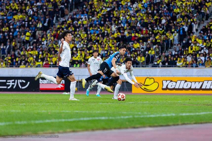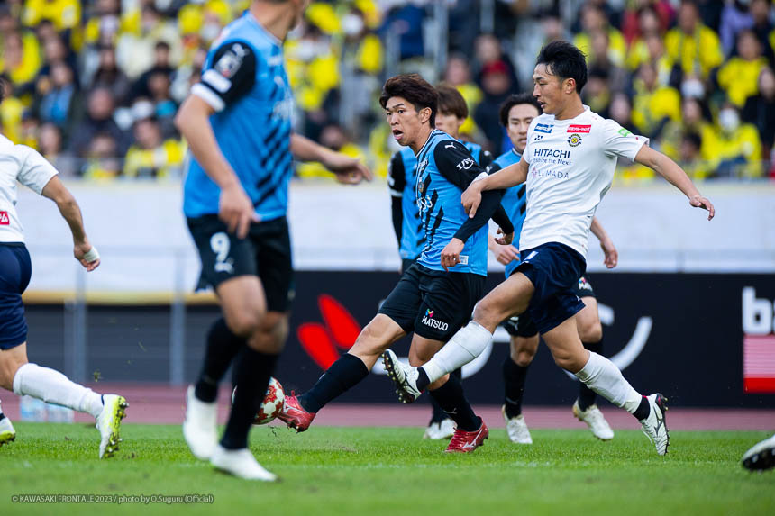47分、フロンターレの攻撃。中央やや左からのフリーキック。脇坂が直接シュートを狙うがゴール上に外れる。49分、柏の攻撃。中盤でボールカットされ、カウンターを狙われるが守備陣が戻り対応。49分、フロンターレの攻撃。前線へのルーズボールにダミアンが追いついて左サイドから宮代が折り返し。混戦となるがシュートに持ち込めず。52分、柏の攻撃。左サイドに展開され、アーリークロスが入るが守備陣がクリア。53分、中盤でルーズボールを拾われ押し込まれるが守備陣がしのぐ。53分、直後にカウンターを狙い、橘田がボールを運ぶがファウルで止められる。56分、左サイドからのフリーキック。マテウス サヴィオのボールはGKソンリョンがはじきしのぐ。56分、右サイドから崩しをかけられるが橘田が対応。57分、フロンターレの攻撃。左サイドで宮代が粘って切れ込み、エリア内で脇坂がボールに反応するがしのがれる。58分、左コーナーキック。脇坂のボールはクリアされる。右サイドから崩しを狙うがフィニッシュには届かず。60分、柏の攻撃。中盤でボールカットされ、ショートカウンターを狙われるが守備陣が戻りながら対応。62分、左サイド裏のスペースにボールを入れられるが山田康には大南が対応。63分、フロンターレの攻撃。左サイドから崩しをかけ、家長が粘るがラストパスにつながらず。64分、フロンターレのメンバーチェンジ。瀬古に代わって遠野、宮代に代わって瀬川がピッチへ。69分、左サイドから崩しをかけるがフィニッシュにつながらず。69分、柏の攻撃。直後にカウンターを浴び、細谷に前線に抜け出されるが大南が戻りGKソンリョンがキャッチ。危ない場面だった。71分、自陣から左サイドに展開され速攻を狙われるが守備陣がしのぐ。73分、セカンドボールを拾われ、マテウス サヴィオに左サイドから折り返されるが守備陣が対応。74分、左サイドチェンジからマテウス サヴィオにシュート性のボールを入れられるがGKソンリョンがキャッチ。