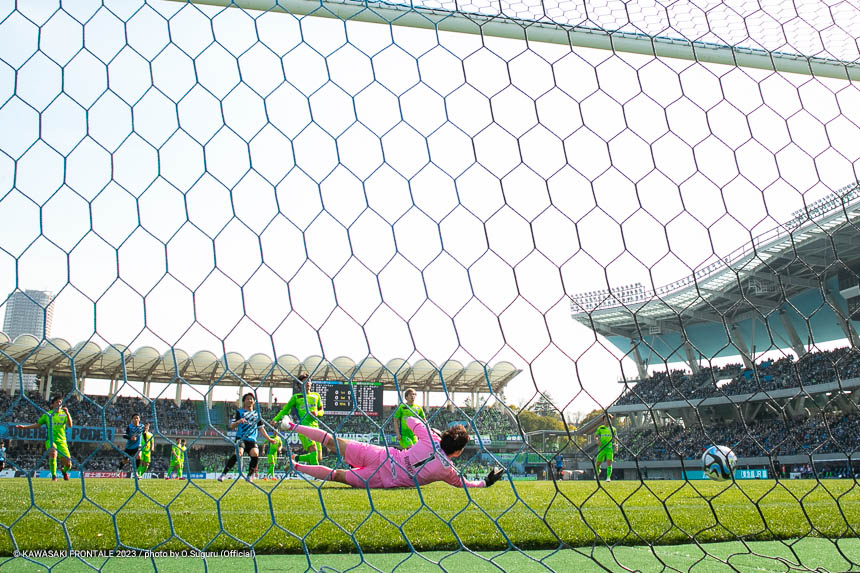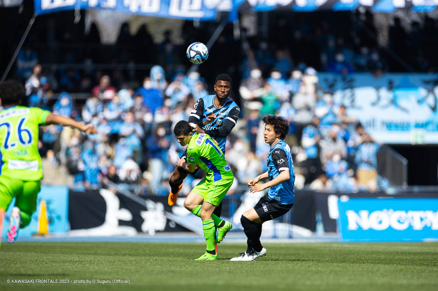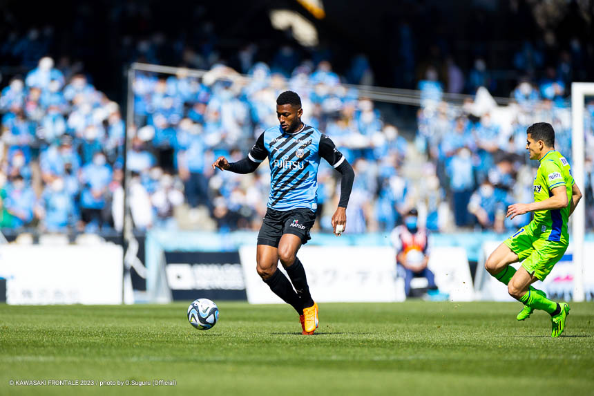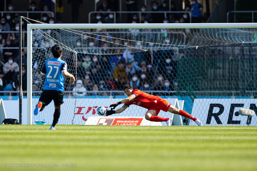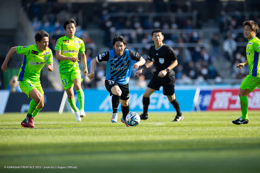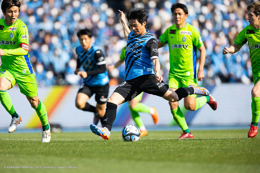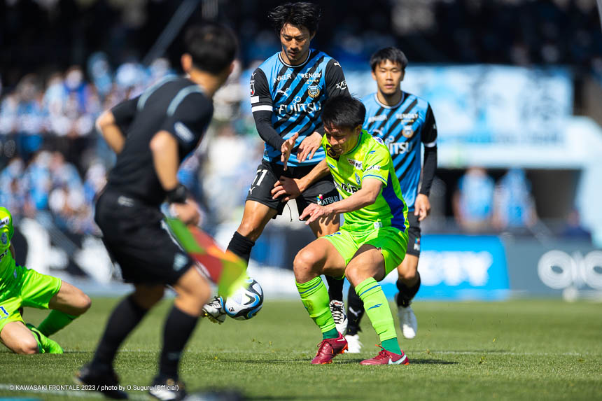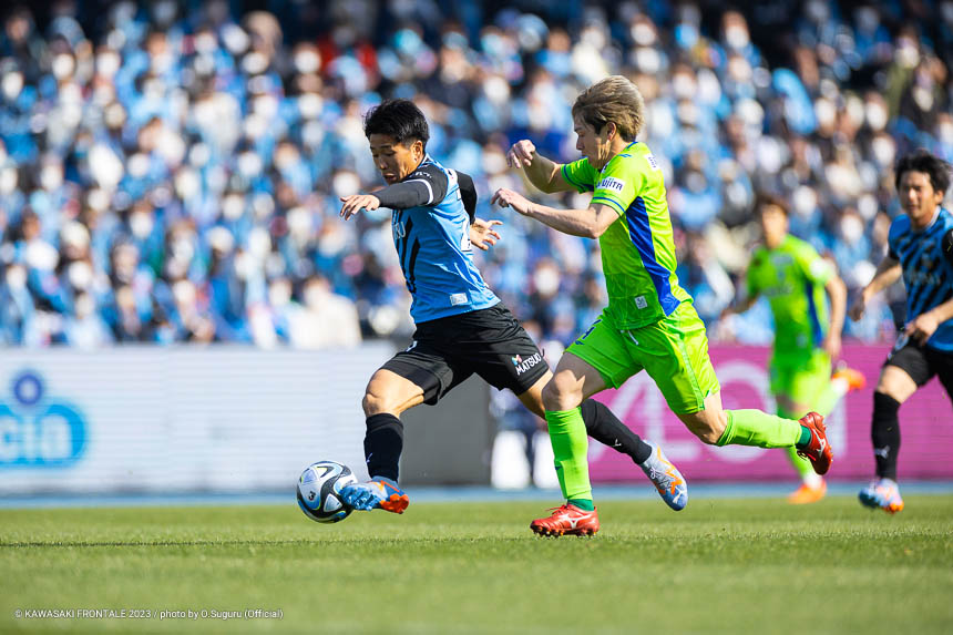 フロンターレのスターティングメンバーは、トップに宮代、左ウイングにマルシーニョ、右に家長、中盤はインサイドハーフに大島と脇坂、アンカーに橘田、最終ラインは佐々木-大南-ジェジエウ-山根、GKソンリョン。3分、湘南の攻撃。セカンドボールを拾われ、左サイドから崩しをかけられるが守備陣が対応。4分、左コーナーキック。永木のボールはゴール前を通過。6分、ゴール前でボールを奪われてシュートに持ち込まれるが、守備陣がブロック。危ない場面だった。7分、中盤やや左からのフリーキック。永木のボールを杉岡にヘッドで合わせられるが枠を外れる。11分、自陣でルーズボールを拾われ、左サイドから折り返しが入るが守備陣が対応。12分、自陣からボールを運ばれ、左サイドからクロスが入りセカンドボールを拾われるがチームディフェンスでしのぐ。13分、フロンターレの攻撃。自陣からボールを運んで右サイドに展開。家長がゴール前にボールを入れるが、惜しくも宮代に合わずGKにキャッチされる。15分、湘南の攻撃。自陣でボールを奪われるが、守備陣がしのぐ。16分、フロンターレの攻撃。背後のスペースに宮代が抜け出し右サイドからマイナスのボール。山根がラストパスを狙うがゴール前に合わず。18分、左サイド裏のスペースへのロングボールにマルシーニョが追いつくが攻撃がつながらず。20分、湘南の攻撃。セカンドボールを拾われ、左サイドを畑に突破されクロスが入るが大南がクリア。21分、フロンターレの攻撃。セカンドボールを拾って押し込むがフィニッシュにつながらず。22分、左サイドからマルシーニョがドリブルをしかけ、脇坂とのコンビネーションから大島がシュートを放つがブロックされる。24分、相手陣内でボールを奪い、パスワークから家長が右足でシュートに持ち込むがゴール上に外れる。26分、ピッチをワイドに使い崩しを狙うがフィニッシュに至らず。