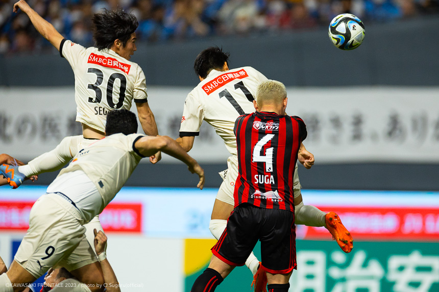 迎えた25分、フロンターレの攻撃。GKソンリョンのロングキックを前線で山田が競り合い、GKが弾いたこぼれ球に反応した宮代がヘッドで合わせてゴールに流し込む。(1-1)しかし27分、札幌の攻撃。直後に反撃をかけられ、左サイドの青木からのボールを浅野にヘッドで合わせられる。(1-2)31分、札幌の攻撃。右サイドからのフリーキックの場面。福森のボールを田中駿にヘッドで合わせられるが、GKソンリョンが体に当ててしのぐ。危ない場面だった。32分、自陣から早いテンポでボールを運ばれるが守備陣が戻り対応。33分、攻勢をしのがれカウンターを狙われるが、大南が戻りながら青木に対応。35分、左コーナーキックの場面。福森のボールは宮代がクリア。セカンドボールを拾われ押し込まれるが守備陣がしのぐ。37分、右サイドからのフリーキックの場面。福森からボールが入るが守備陣が対応。38分、フロンターレの攻撃。自陣左サイドから登里が裏のスペースにボールを入れるが、飛び出したGKにクリアされる。迎えた39分、フロンターレの攻撃。登里が中盤から左サイド裏のスペースにボールを入れ、追いついた山田が粘って折り返し。ゴール前に入り込んだ山根が合わせて再び同点に追いつく。(2-2)41分、フロンターレの攻撃。右サイドから崩しをかけ、抜け出した山根がクロスを入れるが宮代には合わず。42分、札幌の攻撃。直後に反撃をかけられ青木にミドルシュートを打たれるが大きく外れる。45分、フロンターレの攻撃。セカンドボールを拾って細かくパスをつないで崩しをかけるがクリアされる。アディショナルタイム3分。45+1分、札幌の攻撃。攻勢をしのがれカウンターを受け、一気にエリア内にボールを運ばれるが守備陣が戻り耐える。迎えた45+1分、フロンターレの攻撃。直後のプレーで前線からプレスをかけ、中盤でこぼれたボールに反応した家長がGKのポジションを見て中盤からループシュートを決める。(3-2)45+2分、札幌の攻撃。右サイドに展開され金子に切れ込まれるが橘田が対応。立ち上がりにセットプレーの流れから失点。その後、オープンな展開のなかで宮代のゴールで同点に追いつくが、直後に一瞬の隙を突かれ再びリードされる。しかし、徐々にリズムをつかみ山根のゴールで再び同点に追いつくと、アディショナルタイムに家長が遠めからループシュートを決めて勝ち越し。3-2で前半を折り返した。