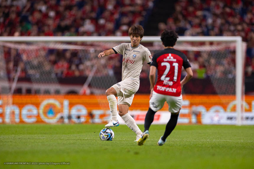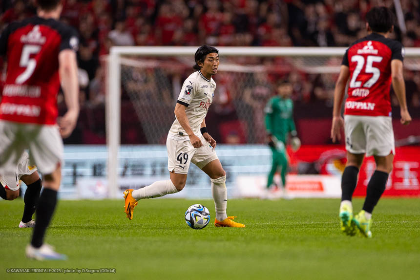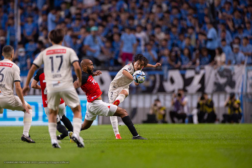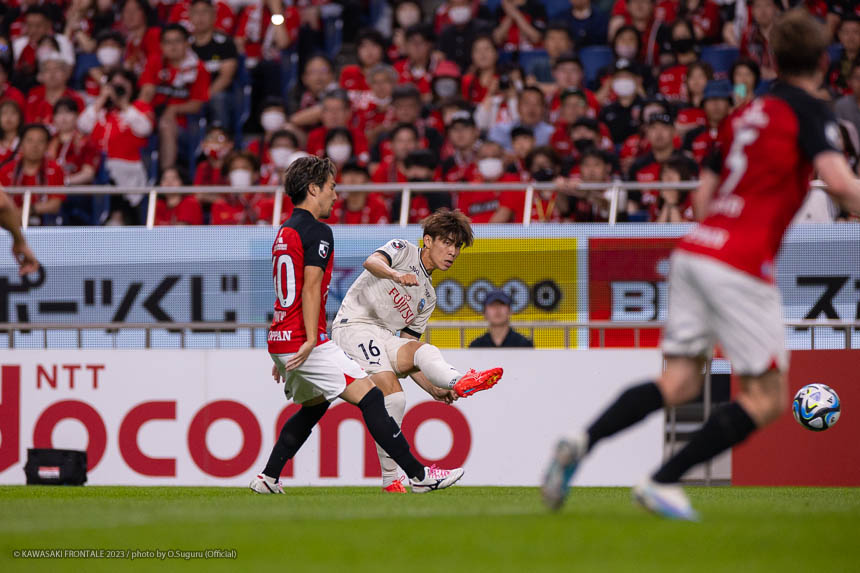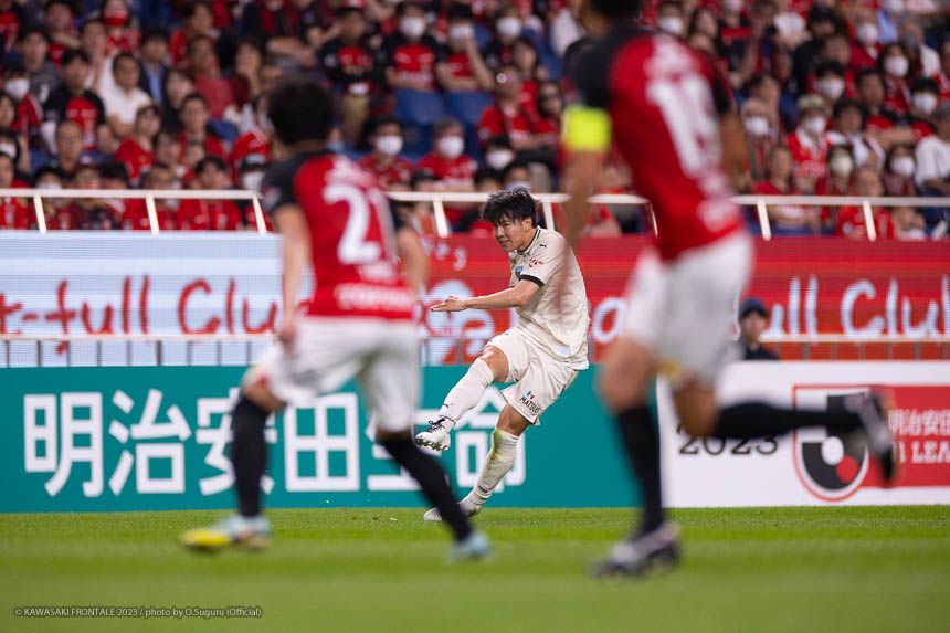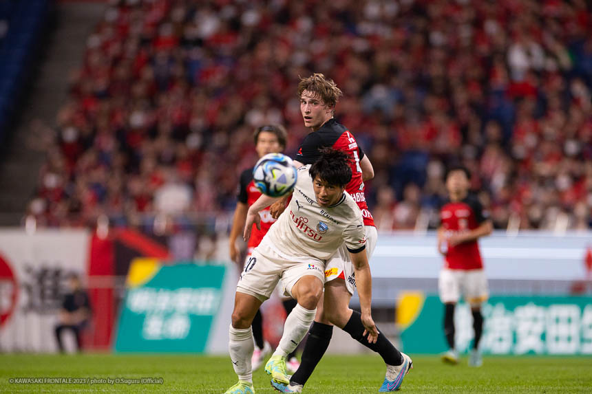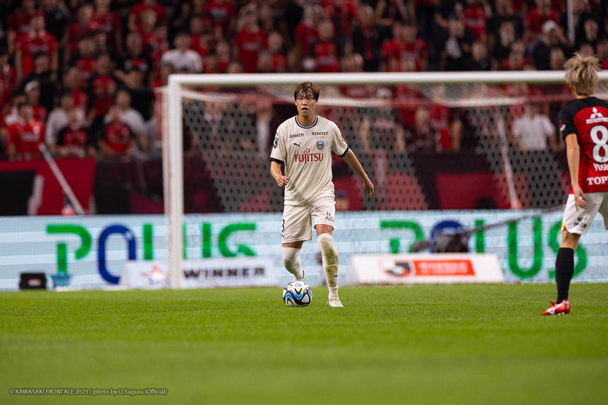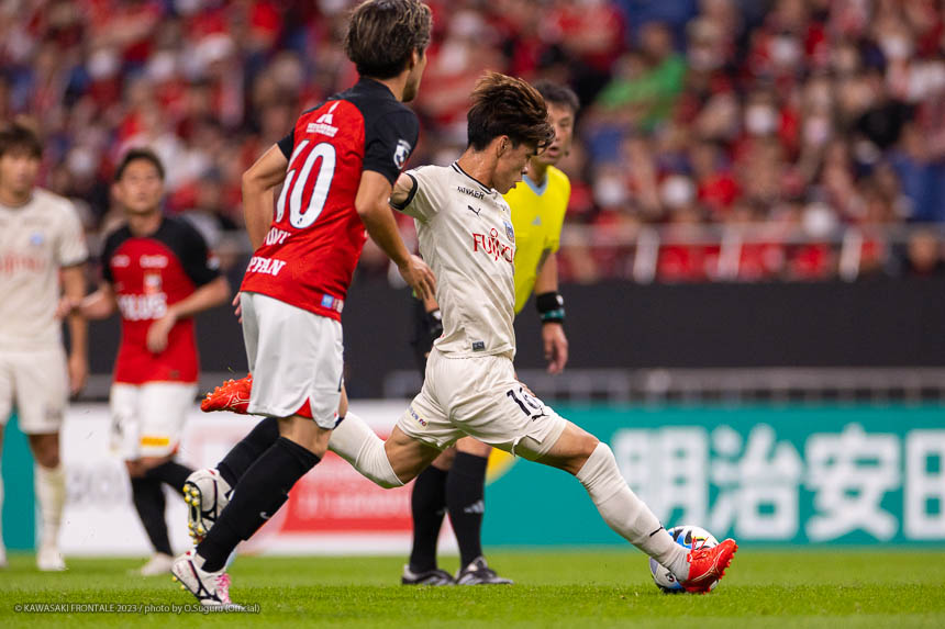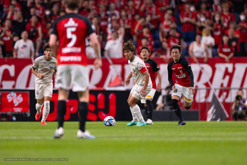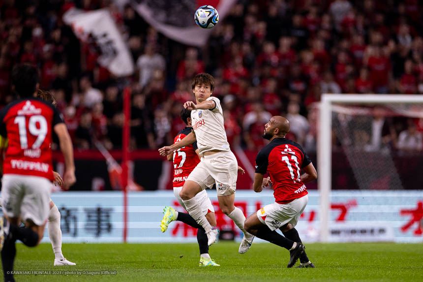 後半立ち上がりの浦和の攻勢をしのぐが、相手GKのロングキックから失点。しかし、前線からプレッシャーをかけて相手のミスを誘い、オウンゴールで同点に追いつく。その後はフロンターレが押し気味に試合を進めるが、決定機を得点につなげられず。終盤退場者を出し数的不利となるがしぶとく戦い抜き、試合はアウェイでドローという結果に終わった。