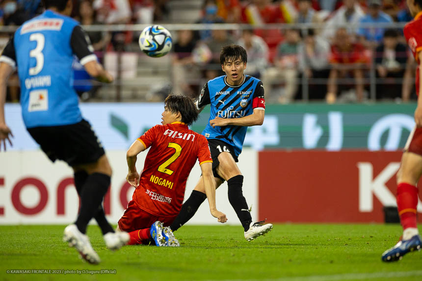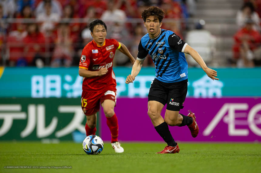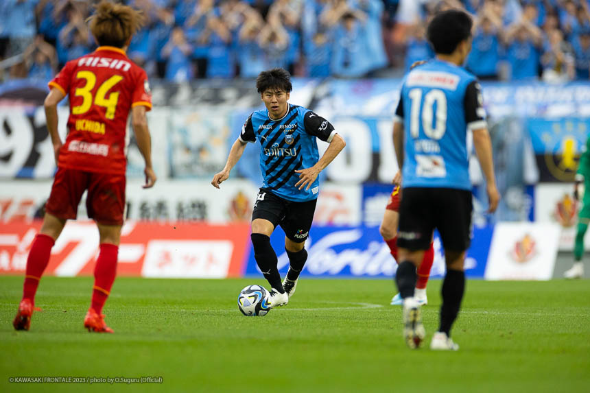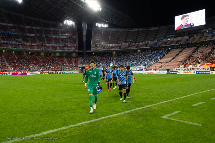 フロンターレのスターティングメンバーは、トップに宮代、その下に脇坂、左ワイドに遠野、右に家長、中盤は大島とシミッチ、最終ラインは登里-車屋-高井-山根、GK上福元。1分、名古屋の攻撃。右サイドから崩しをかけられペナルティエリア内にボールが入るが、車屋が対応。GK上福元が飛び出しキャッチ。3分、フロンターレの攻撃。右サイドに展開。家長が遠めからシュートを放つが枠を外れる。7分、相手陣内でボールを動かし、登里の左スローインから遠野がダイレクトでシュートを放つがゴール上に外れる。7分、名古屋の攻撃。中盤からのパスが右サイド裏のスペースに流れユンカーに抜け出されるが、GK上福元が足に当ててシュートブロック。ピンチをしのぐ。8分、右コーナーキックの流れからマテウスにペナルティエリア内に入り込まれるが、守備陣がブロック。9分、右コーナーキックの場面。和泉のボールは家長がクリア。10分、フロンターレの攻撃。左サイドからカットインした宮代がミドルシュートを放つが、GKに止められる。11分、名古屋の攻撃。マテウスに右サイドの深い位置に入り込まれるが登里が対応。12分、右コーナーキックの場面。和泉のボールはゴール前を通過。14分、フロンターレの攻撃。右サイド裏のスペースへのボールを家長が収め、セカンドボールを拾って押し込むがファウルで止められる。15分、名古屋の攻撃。左右に振られ最後は稲垣にミドルシュートを打たれるがGK上福元がキャッチ。16分、フロンターレの攻撃。右サイドに展開。山根のアーリークロスに宮代が飛び込むが触れず。21分、大島を起点に右サイドから中央へ。遠野が流しシミッチがシュートを放つが、ボールはゴール右に外れる。22分、セカンドボールを拾って押し込むがフィニッシュにつながらず。24分、相手陣内で遠野がボールを拾い、中央脇坂がシュートを放つがGKにセーブされる。惜しい場面だった。