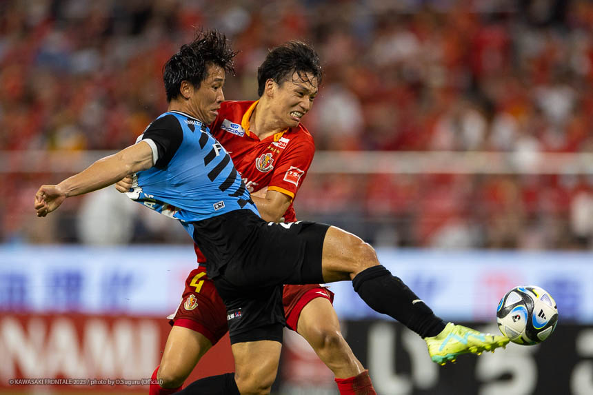 25分、名古屋の攻撃。自陣でボールカットされるが守備陣が対応。27分、中盤右サイドからのフリーキックの場面。早いリスタートから右サイド和泉にクロスを入れられるが、ボールはゴール前を通過。セカンドボールを拾われゴール前にボールが入るが守備陣がしのぐ。28分、フロンターレの攻撃。中盤でボールを奪い、右サイド山根がアーリークロス。こぼれ球を大島がミドルシュートを放つがブロックされる。29分、名古屋の攻撃。左サイドから崩しをかけられるが守備陣が対応。31分、フロンターレの攻撃。セカンドボールを拾って押し込むがフィニッシュにつながらず。33分、名古屋の攻撃。自陣からボールを運ばれ、ユンカーに左サイドから抜け出されるが高井が対応。35分、左サイド裏のスペースにボールを入れられ抜け出したマテウスに折り返され、ユンカーがゴール前に飛び込んでくるが車屋と登里で戻りながら対応。ピンチをしのぐ。37分、右コーナーキックの場面。和泉のボールはシミッチがクリア。マテウスに遠めからシュートを打たれるがGK上福元がキャッチ。40分、自陣から長いボールを入れられサイドを変えられるが、守備陣が戻りながら対応。迎えた41分、名古屋の攻撃。フリーキックの流れ。左サイドからマテウスにアーリークロスを入れられ、GK上福元がファンブルしたボールをユンカーに流し込まれる。(0-1)42分、フロンターレの攻撃。左サイドから崩しをかけるがフィニッシュにつながらず。44分、中盤シミッチからの縦パスを受けた宮代が反転。左足でシュートを放つがゴール上に外れる。45分、名古屋の攻撃。GKのロングボールからユンカーに抜け出されるが、車屋が対応。アディショナルタイム2分。45+1分、フロンターレの攻撃。右サイドから崩しをかけ、深い位置に入り込んだ脇坂が折り返し。最後は家長がシュートを放つがブロックされる。45+3分、名古屋の攻撃。中盤やや右サイドからのフリーキックの場面。マテウスに直接シュートを打たれるが枠を外れる。立ち上がりからフロンターレがボールを動かしながらチャンスを伺うが、得点につなげることができず。お互いのスタイルをぶつけ合う展開が続くが、前半終盤にリスタートの流れから一瞬の隙を突かれ失点。1点ビハインドで前半を折り返した。