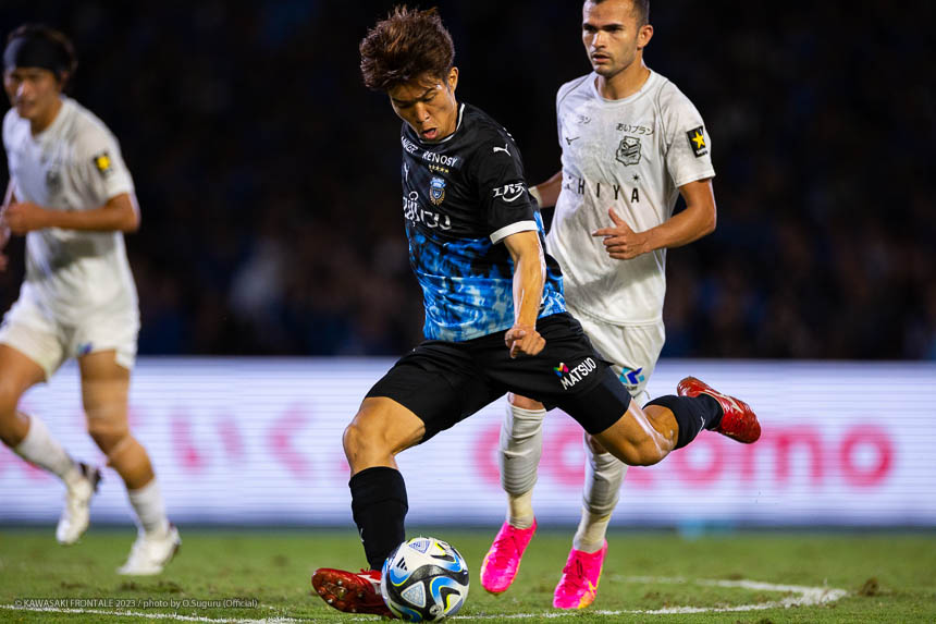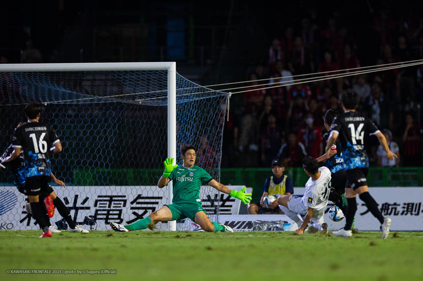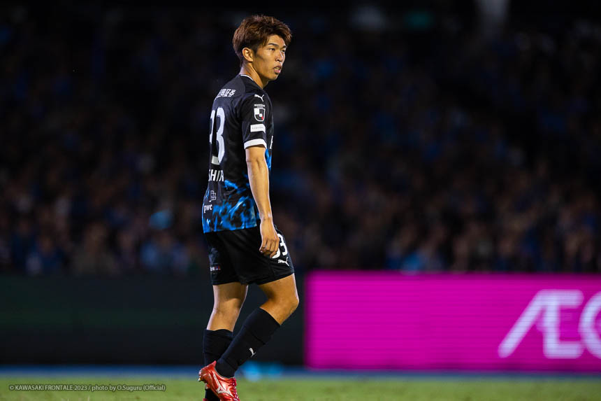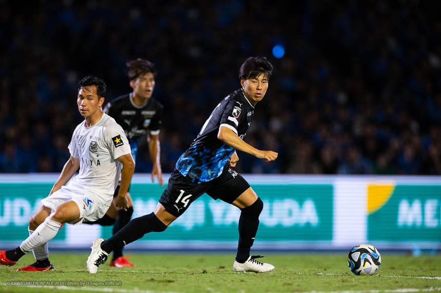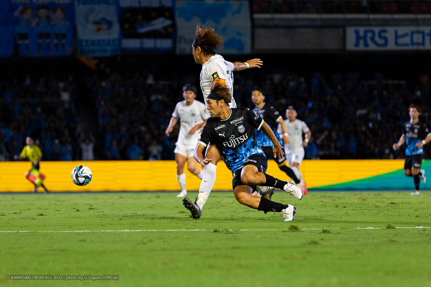 - まず優先的に背後を狙うというところで、 相手がそのスペースを先に消してきていた部分があった。あとは自分たちの横の揺さぶりが少なかったと感じている。アサヒ(佐々木旭)が中に入ったりしていたが、前の3人がもっと真ん中に集結してもよかったかなと。一人ひとりの距離感がよくなかった。攻撃に目を向けたいが、まず守備の距離感が悪かったと思う。選手のマークに行く距離感が悪くて、ユウさん(小林悠)が二度追いするにしても距離が長くて守るスペースが広すぎた。なかなか狭いスペースに追いやることができなかったと思う。今日に関しては守備で後手を踏んでいる感じがあって、距離感が悪いのでボールを奪った後もユウさんが1人で収めなければいけない場面が多かった。