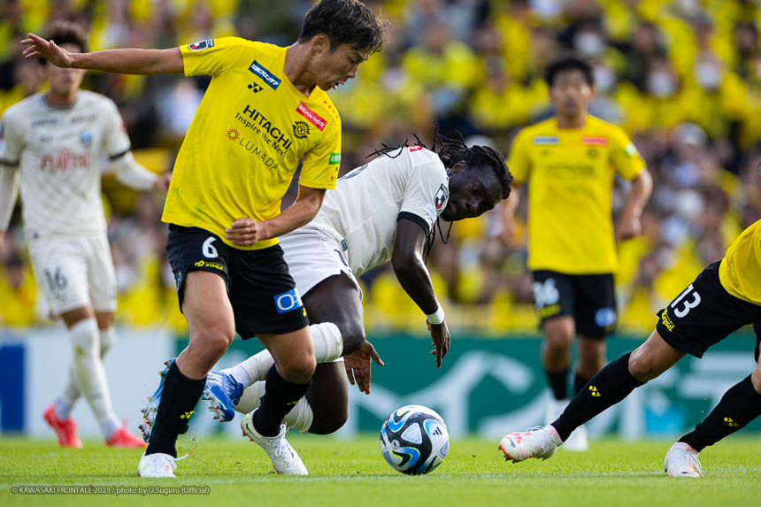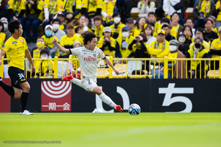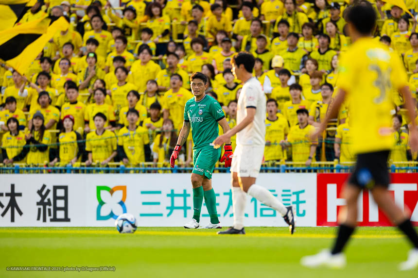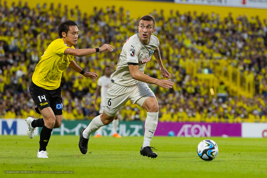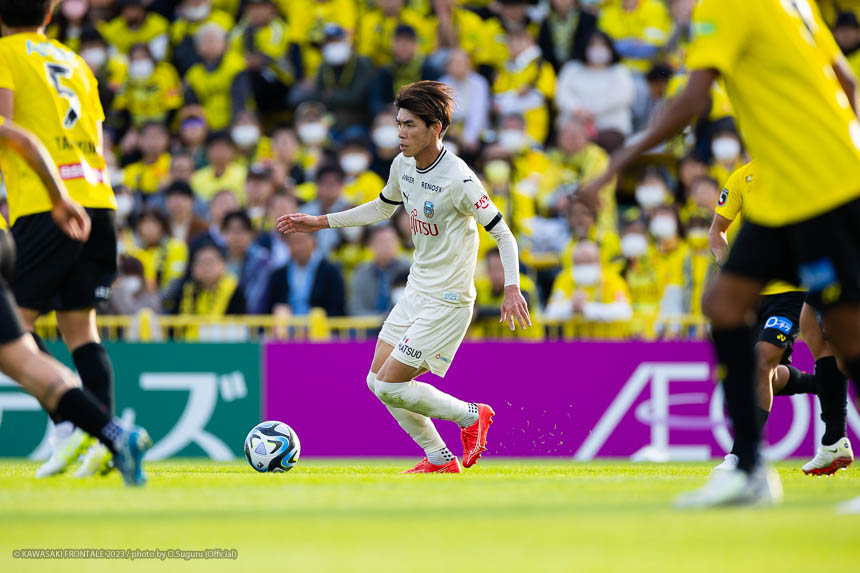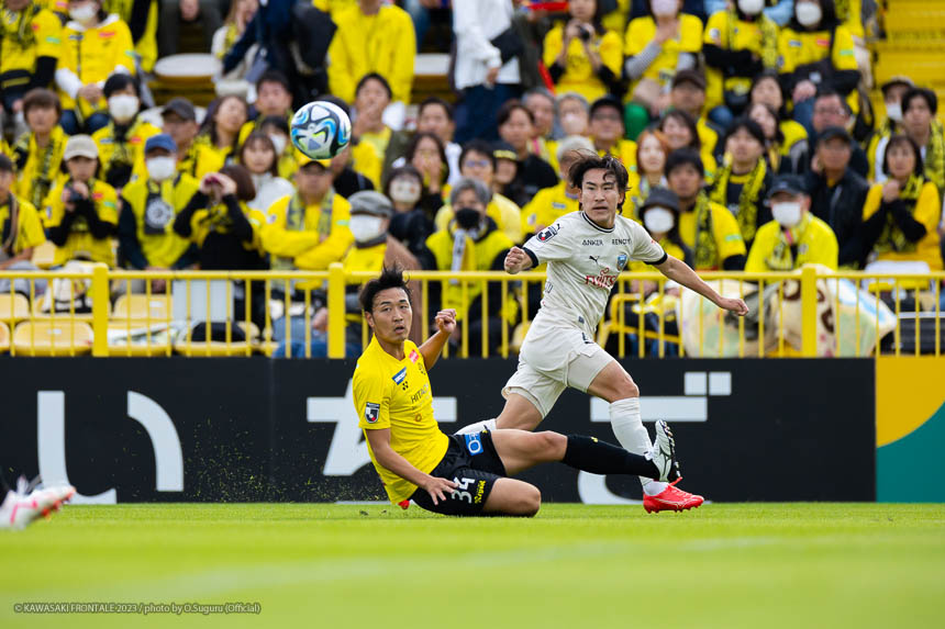 24分、フロンターレの攻撃。右サイドから左に展開。登里がクロスを狙うがブロックされる。さらに混戦からマルシーニョがクロスを入れるがゴール前のゴミスに合わず。25分、柏の攻撃。中盤でパスカットされカウンターを受け、山田康に左サイドから折り返されるが守備陣がブロック。27分、中盤左サイドからのフリーキックの場面。マテウス サビオのボールはジェジエウがクリア。こぼれ球をジエゴに狙われるが、ミドルシュートは守備陣がブロック。28分、さらに攻勢をかけられ左サイド裏のスペースを突かれ、ジエゴに抜け出され折り返しを細谷に合わせられるがオフサイドの判定。30分、フロンターレの攻撃。中盤右サイドからのフリーキックの場面。脇坂のボールが直接ゴールに向かうがGKにキャッチされる。30分、柏の攻撃。直後に反撃をかけられ右サイドからアーリークロスが入るがジェジエウがクリア。31分、右スローインの流れから山田康にペナルティエリア内に入り込まれ細谷にシュートを打たれるがゴール右に外れる。危ない場面だった。33分、フロンターレの攻撃。パスをつなぎ瀬古が左サイドに展開。マルシーニョがコースを狙ったミドルシュートを放つがゴール上に外れる。35分、ボールを奪い返し右サイドから崩しをかけるがフィニッシュにつながらず。36分、ジェジエウが中盤から背後のスペースにボールを入れるが、走り込んだ家長はオフサイドの判定。38分、柏の攻撃。中盤でインターセプトされカウンターを狙われるが、守備陣が戻りながら対応。39分、フロンターレの攻撃。パスをつないで押し込むがフィニッシュにつながらず。迎えた40分、柏の攻撃。中央に入れたボールをカットされカウンターを受け、マテウス サビオに右サイドに展開されると、抜け出した山田雄にシュートを決められ先制点を奪われる。(0-1) 42分、フロンターレの攻撃。細かくパスをつないで押し込み、山根のラストパスをゴミスがダイレクトで合わせてゴールネットを揺らすがオフサイドの判定。VARチェックが入るが判定は変わらず。44分、柏の攻撃。自陣でボールを奪い返され右サイドから崩しを狙われるが守備陣が戻りながら対応。45分、フロンターレの攻撃。ロングボールのセカンドボールを拾って橘田がミドルシュートを放つがゴール上に外れる。アディショナルタイム2分。フロンターレがボールを動かしながらチャンスを伺うが、危険なエリアにボールを入れることができず。柏のカウンターを警戒しながら我慢強く試合を運ぶが一瞬の隙を突かれて失点。1点ビハインドで前半を折り返した。