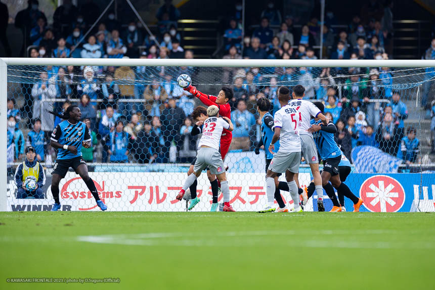 フロンターレのスターティングメンバーはトップにゴミス、左ウイングに宮代、右に小林、中盤はインサイドハーフに橘田-脇坂、アンカーにシミッチ、最終ラインは瀬川-高井-ジェジエウ-山根、GKソンリョン。1分、京都の攻撃。自陣でインターセプトされ、ショートカウンターを狙われるが守備陣が対応。5分、自陣でボールを奪い返されてショートカウンター。右サイドからクロスが入るが守備陣がクリア。5分、フロンターレの攻撃。直後に反撃をかけて右サイドに展開。小林がクロスを入れるがクリアされる。7分、京都の攻撃。自陣からスピーディーにボールを運ばれて、右サイドから切れ込んだ福田にミドルシュートを決められる(0-1)。9分、フロンターレの攻撃。相手陣内でインターセプト。脇坂が右サイドからクロスを入れるがクリアされる。10分、相手陣内でボールを奪い返して右サイドから山根が深い位置に入り込み折り返し。ゴミスが左足で合わせるがゴール右に外れる。惜しい場面だった。12分、左サイドに展開。瀬川がクロスを入れるがゴミスにはうまく合わず。13分、中盤やや左からのフリーキック。脇坂のボールはGKにキャッチされる。14分、京都の攻撃。中盤左からのフリーキック。武田のボールを折り返されてゴール前で混戦となるがGKソンリョンがキャッチ。16分、自陣からボールを運ばれ左サイドから山﨑にクロスを狙われるがシミッチが戻りながらブロック。17分、左コーナーキック。豊川のボールは小林がクリア。セカンドボールを拾われてミドルシュートを打たれるがGKソンリョンがキャッチ。19分、フロンターレの攻撃。GKソンリョンのロングキックをゴミスがヘッドですらしてエリア前にこぼれたボールを宮代が左足で決める(1-1)。21分、京都の攻撃。右ロングスローからゴール前で混戦となるが守備陣がしのぐ。22分、フロンターレの攻撃。右コーナーキック。ショートコーナーから武田に折り返されるがゴミスがクリア。