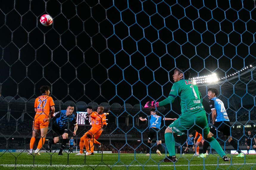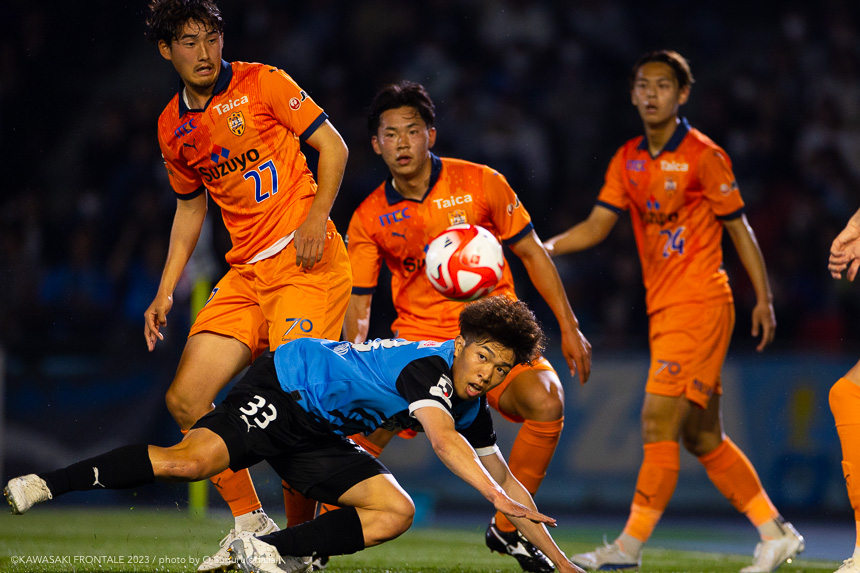 20分、フロンターレの攻撃。佐々木が左サイドから突破をしかけて深い位置に入り込んで折り返し。混戦から宮代がヘッドで合わせるが惜しくもGKにセーブされる。22分、清水の攻撃。パスをつながれ左サイド裏のスペースを突かれコロリ、西澤にシュートを打たれるがGK上福元が連続セーブ。ピンチをしのぐ。23分、左コーナーキック。西澤のボールは高井がクリア。25分、フロンターレの攻撃。山根が右サイド裏のスペースにボールを入れ、抜け出した山田が折り返すがブロックされる。27分、佐々木が中盤左サイドからドリブルをしかけてクロス。山田が体に当てて合わせるが惜しくもポストに当たり外れる。28分、右コーナーキック。瀬古のボールはクリアされる。29分、パスをつなぎ瀬古がゴール前にボールを入れるがフィニッシュにつながらず。31分、フロンターレのメンバーチェンジ。チャナティップに代わって脇坂がピッチへ。33分、パスをつないで押し込み右サイドに展開。抜け出した山田が折り返すがそのままラインを割る。35分、清水の攻撃。中盤でボールを奪い攻勢をかけ、ゴール前にボールが入るがクリアされる。36分、直後に反撃を受け、左サイドから崩しをかけられるが守備陣が戻って対応。37分、左コーナーキック。西澤のボールは宮代がクリア。41分、フロンターレの攻撃。パスをつないで押し込み、最後は中央の瀬古がミドルシュートを放つがGKにキャッチされる。42分、相手陣内でボールを奪い返し、圧力をかけるがフィニッシュにつながらず。43分、清水の攻撃。直後に反撃を受けて左サイドから中央にボールが入るが車屋がカバーリング。43分、左コーナーキック。西澤のボールをヘナト アウグストにヘッドで合わせられるが枠を外れる。45+1分、フロンターレの攻撃。リスタートの流れから脇坂が抜け出し、左サイドの深い位置から折り返し。宮代が合わせるがシュートは惜しくもブロックされる。早い時間帯に遠野が豪快な2ゴールで先行し、相手を圧倒して前半を折り返した。
