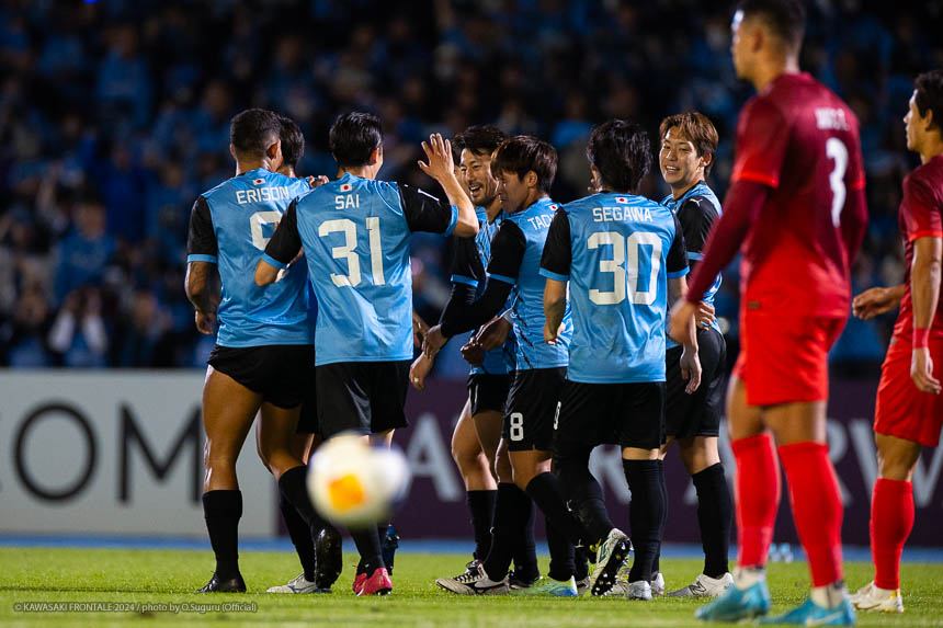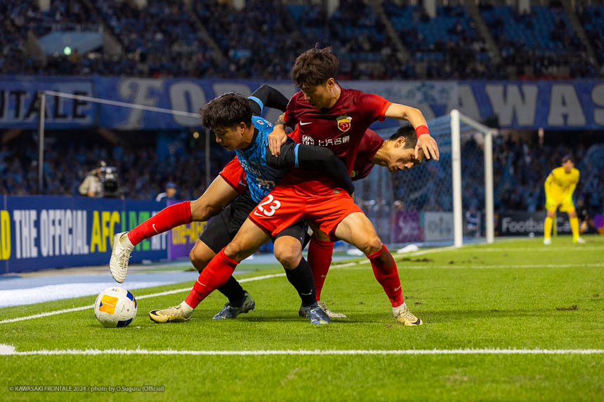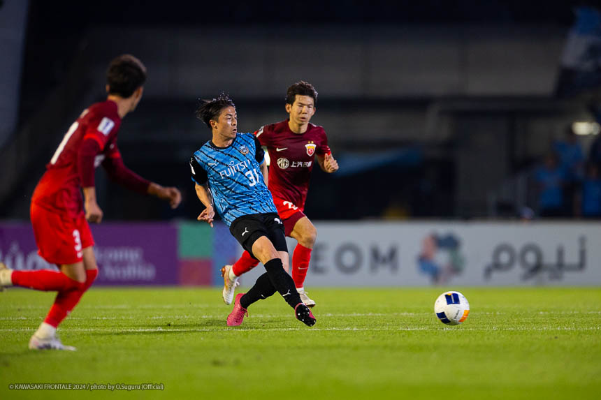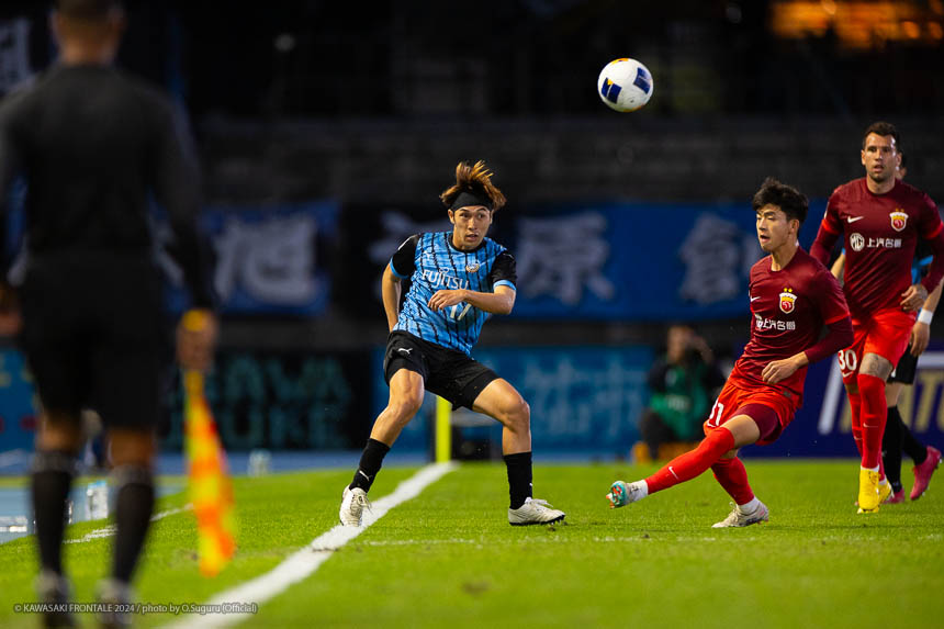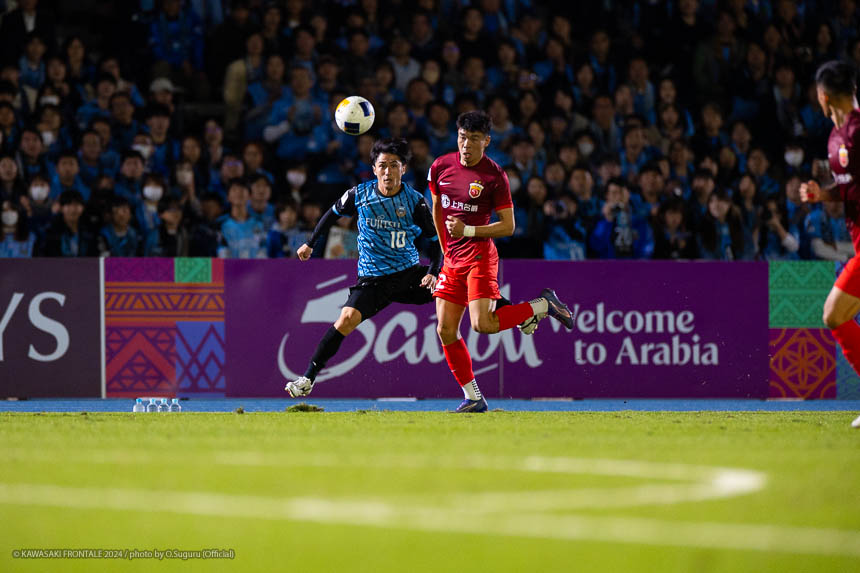 フロンターレのスターティングメンバーはトップにエリソン、1.5列目に瀬川、左ワイドに家長、右に遠野、ボランチは山本-橘田のコンビ、最終ラインは三浦-丸山-佐々木-際、GKソンリョン。2分、フロンターレの攻撃。相手陣内でボールを奪い返し、山本が左サイドからクロス。逆サイドから遠野が折り返すがGKにキャッチされる。3分、佐々木が自陣から長いボールを入れて瀬川が抜け出すがファウルで止められる。5分、エリア左前からのフリーキック。山本が直接シュートを狙うが壁に当たりGKにキャッチされる。6分、上海海港の攻撃。自陣でボールを奪い返され左サイドからクロスが入るがボールはゴール前を通過。さらに自陣でボールを奪われグスタボに左サイドからシュートを打たれるがGKソンリョンがキャッチ。7分、セカンドボールを拾われ圧力をかけられるが守備陣がしのぐ。8分、攻勢をしのがれカウンターを受けるが家長が戻り対応。9分、フロンターレの攻撃。中盤でボールを奪ってショートカウンターからエリソン、橘田と連続してミドルシュートを狙うが止められる。11分、相手陣内でボールを奪いショートカウンターから山本が縦パスを入れるが瀬川はシュートに持ち込めず。12分、左サイドに展開。三浦が中盤からドリブルをしかけて深い位置に入り込み折り返し。クリアボールに反応した家長がダイレクトで合わせる(1-0)。13分、自陣からボールを運んでセカンドボールを拾った山本が縦パスを入れ瀬川がボールを出しエリソンがシュート。GKが弾いたボールを瀬川が合わせる(2-0)。16分、上海海港の攻撃。パスをつながれ押し込まれるが守備陣がしのぐ。17分、右スローインの流れからクロスが入るが守備陣が対応。19分、カウンターをカウンターで返され前線にロングボールを入れられるがGKソンリョンが飛び出してクリア。20分、左スローインからの流れ。左サイドからのクロスをヘッドで合わせられるがGKソンリョンがキャッチ。21分、左サイド裏のスペースに浮き球を入れられるが際が戻りながらクリア。22分、左サイドからのクロスを逆サイドから戻されてゴール前グスタボに合わせられるがGKソンリョンがキャッチ。