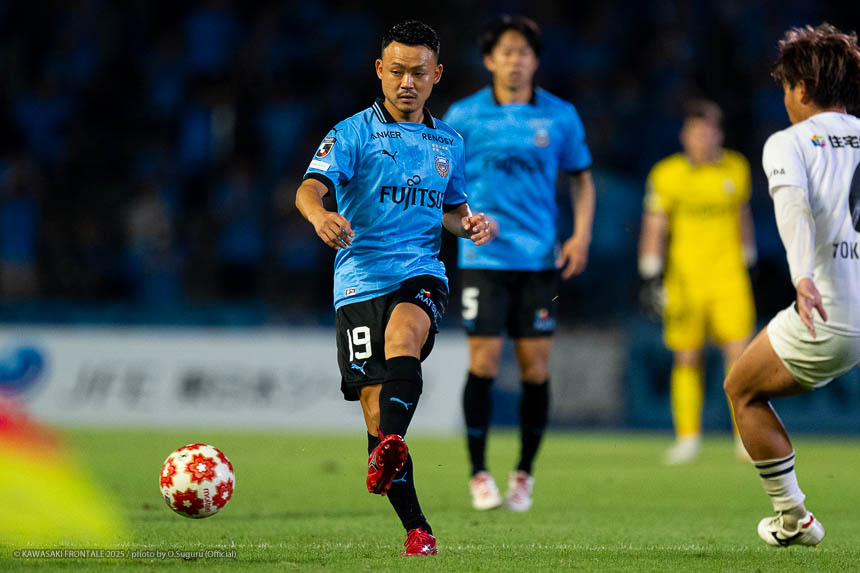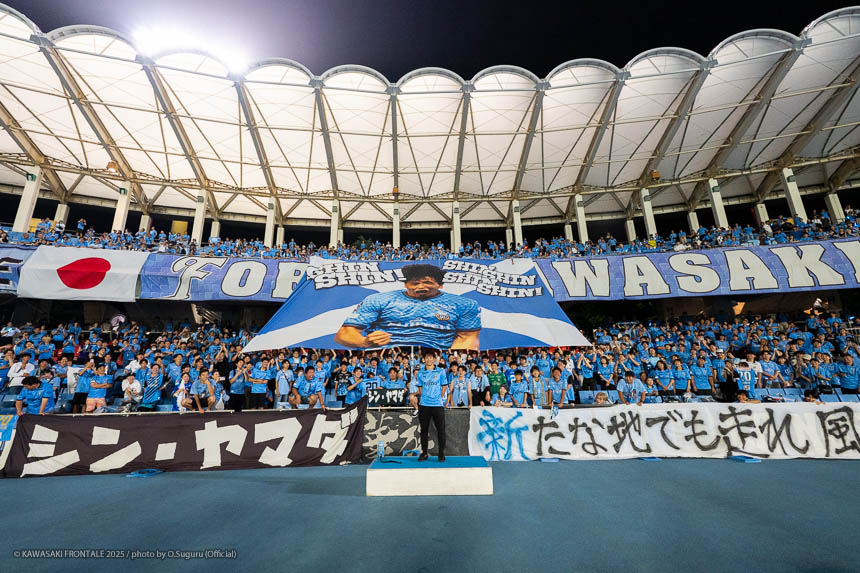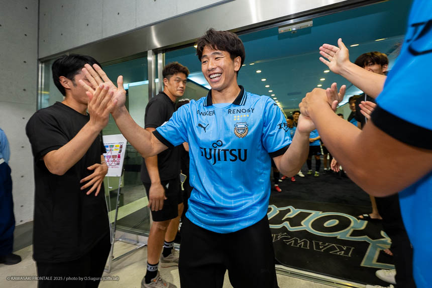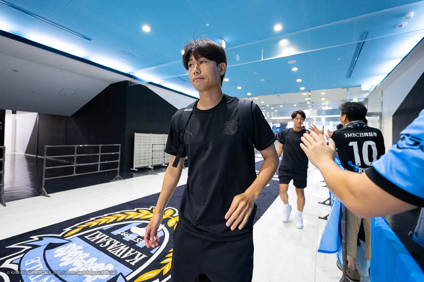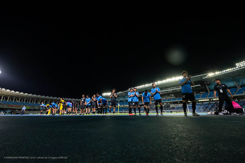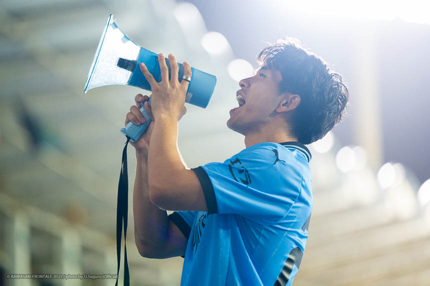 - 応援にはもちろんいつも感謝しています。我々が勝ったとき、ファミリアと呼ばれる歌を一緒に歌います。ファミリアは家族という意味だと思いますが、今日は大切な家族と勝利の喜びを分かち合えて、本当に最高でした。リーグ戦ではなかなか彼らの期待に応えられていなくて、苦しい悔しい思いもたくさんさせていると思いますが、今日のように苦しい時にどれだけ結束できるかが家族だと思うので、今日みたいな喜びをまた分かち合うために、また一緒に次の苦しいリーグ戦も戦ってほしいと思います。こんな大きなスタジアムで、こんなにフロンターレサポのほうが多くても、やっぱりその合間合間で我々のチャントもきちんと耳には入りますし、選手にも届いていると思います。今日の勝利はみんなの力がうまく組み合わさって勝った勝利だと思いますし、先週の悔しい敗北はみんなの力が足りなくて勝てなかった敗北だと思います。サガミスタも帰りが遅くなって大変だと思いますし、中3日で試合は続くので、明日はしっかり仕事を休んでいただいて(笑)、力を蓄えて、のど飴をなめて、週末は栃木まで来ていただいて、みんなでまた勝利を目指しましょう。