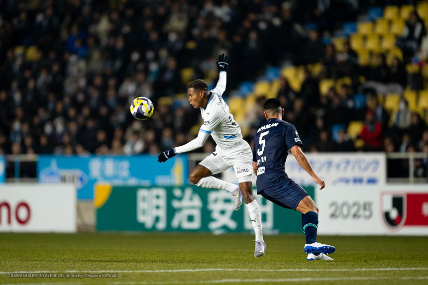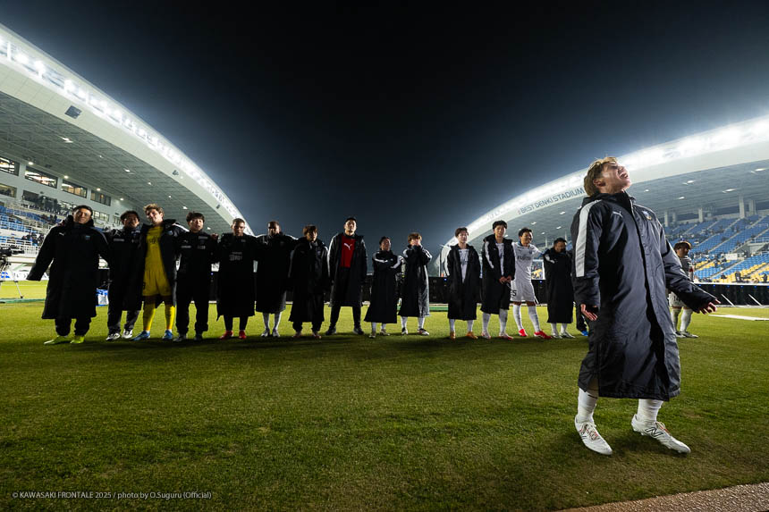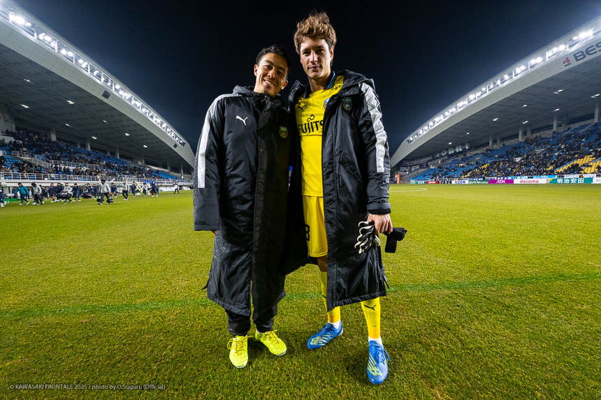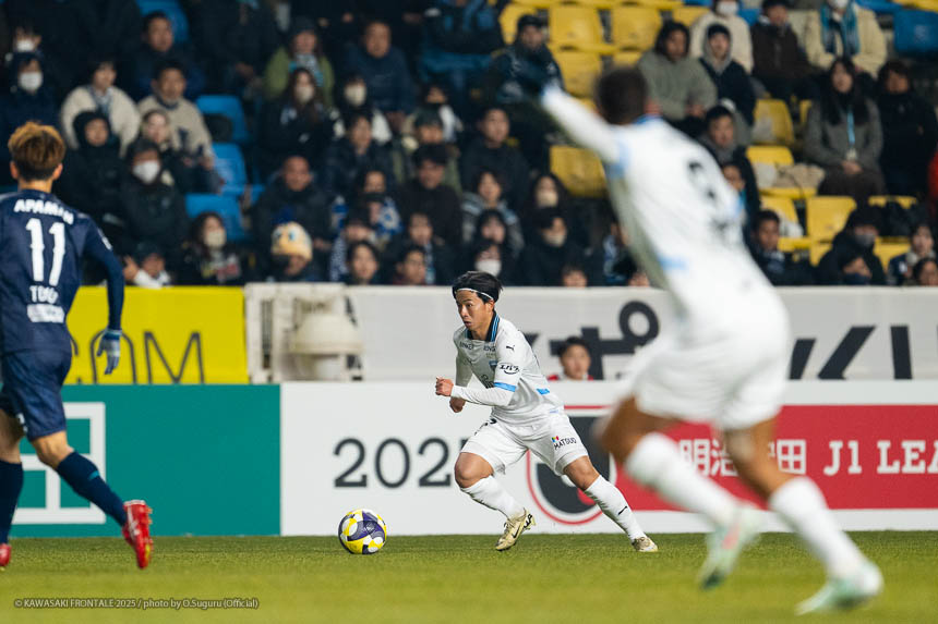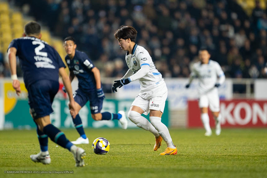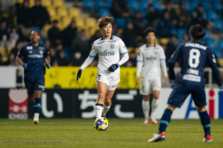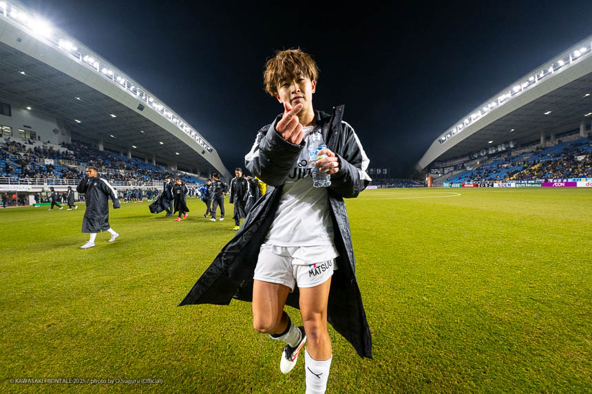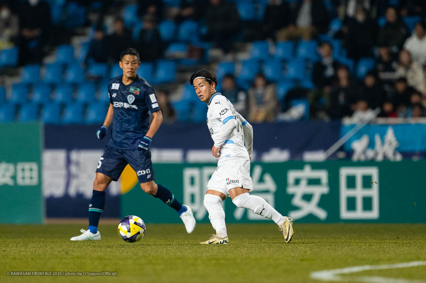 - この勝点3はとても大きい。自分たちがペースを握っていたところで失点をしたが、前半の終盤にセットプレーで追いつけたことも大きかった。逆転のゴールシーンに関しては左センターバックの選手が自分をマークして、ウイングバックがアサヒ(佐々木旭)を見ていた状況だった。そこで自分が低い位置に行けばついて来られないと思っていた。問題はアサヒについているマークが来るかどうか。相手の中盤は間に合っていたが迷わせるポジショニングができたと思う。あとはボールを受けてゴール前にエリソンがいるのはわかっていたので、クロスを上げてエリソンが決めてくれた。オグリさん(大黒将志コーチ)が、ゴール前に入る枚数が相手より少なくても関係ないときがあると言っていた。要はクロスを上げる選手と合わせる選手で2対1を作れているということ。ゴールシーンもエリソンが相手の後ろをとったところにボールを送れれば2対1を作れると思っていた。それがうまくいった。連戦が続くと総力戦になる。今日は僕とエリソンが途中から出たが、自分たちはスタートから出ても仕事ができるぐらい能力を持った選手だと思っている。他にもテン(宮城天)やヒナタ(山内日向汰)といったいい選手がいる。連戦になればなるほど総力戦になるのでチーム全員で戦っていきたい。