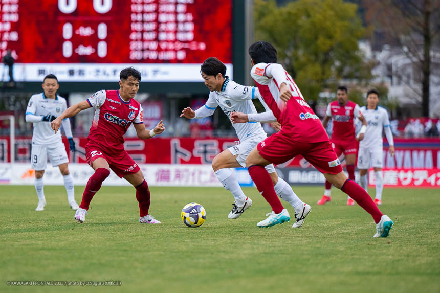 後半立ち上がりにフロンターレが攻勢をかけるが岡山にしのがれ、その後は岡山にチャンスを作られる時間が続くが守備陣が粘り強く対応。終盤メンバーチェンジで得点を奪いにいくが、決定機をものにできず。試合はお互いに決めきれないまま、スコアレスドローに終わった。