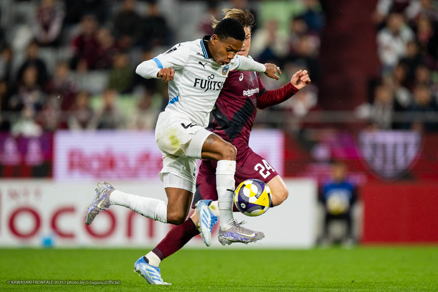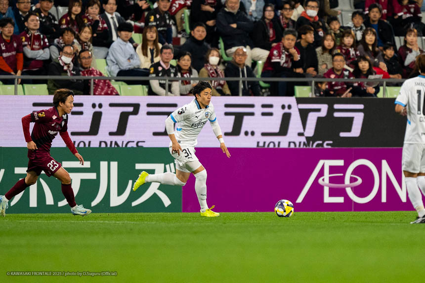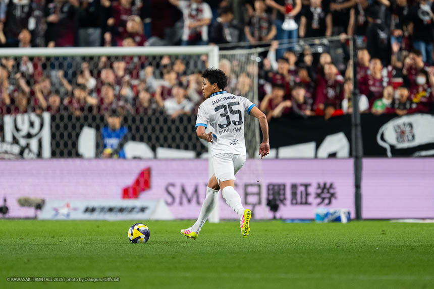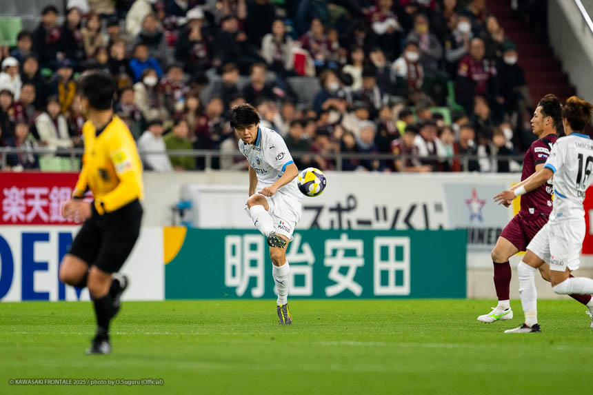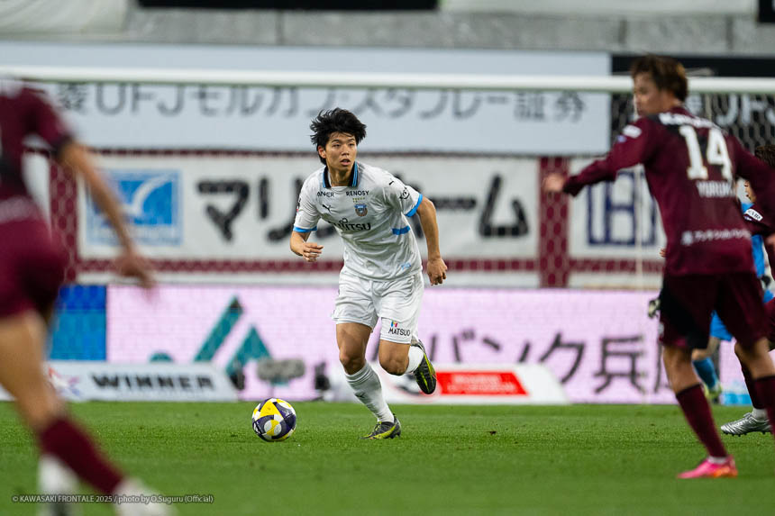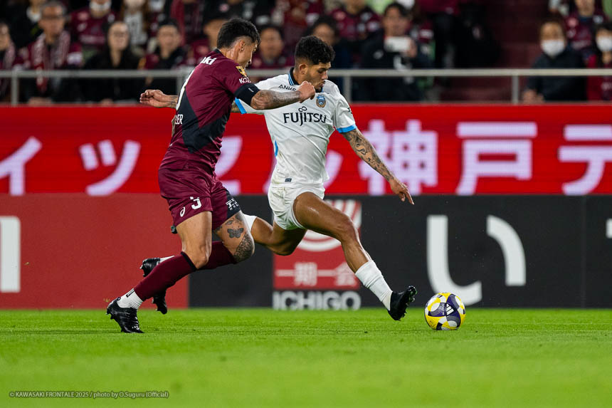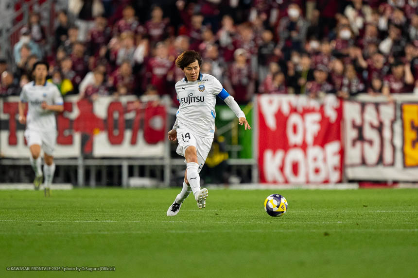 26分、フロンターレの攻撃。神戸の攻勢をしのぎ山本が自陣から左サイド裏のスペースにボールを入れマルシーニョが走るが、飛び出したGKにクリアされる。27分、リスタートの流れ。左サイドで脇坂が粘り山本がシュートを狙うが枠を外れる。28分、神戸の攻撃。左サイドに展開され崩しをかけられるが佐々木と伊藤で対応。30分、本多の左ロングスローは守備陣が対応。30分、自陣でのバックパスにプレッシャーをかけられ、こぼれ球を佐々木大に狙われるがシュートはゴール左に外れる。危ない場面だった。迎えた31分、神戸の攻撃。右サイドへ大きなサイドチェンジから崩しをかけられ佐々木大にミドルシュートを打たれ、DFに当たったボールがゴールに吸い込まれ先制点を奪われる。(0-1)33分、フロンターレの攻撃。左サイドから崩しをかけ、抜け出したマルシーニョが折り返すがエリソンには通らず。35分、神戸の攻撃。中盤でボールを奪われ左サイドから崩しをかけられるがチームディフェンスでしのぐ。37分、中盤でボールをカットされショートカウンターを浴び汰木にシュートを狙われるが佐々木が戻りながら対応。40分、フロンターレの攻撃。中盤でボールをカットされカウンターを狙われるが守備陣が対応。43分、中盤でボールを奪われショートカウンターを狙われ連続して右サイドからクロスを狙われるが守備陣が耐える。迎えた45分、神戸の攻撃。右コーナーキックの場面。汰木のボールからゴール前で混戦となり、こぼれ球をマテウス トゥーレルにヘッドで押し込まれる。(0-2)アディショナルタイム4分。前半45+1分、フロンターレの攻撃。神戸の攻勢をしのぎ高井が大きく左べサイドチェンジ。マルシーニョが収めてラストパスにエリソンが走り込むがクリアされる。迎えた前半45+2分、フロンターレの攻撃。神戸の圧力をしのぎ河原が中盤から前線に速いパスを入れ、抜け出したマルシーニョが粘ってシュートを決めて1点を返す。(1-2)序盤からホーム神戸にプレッシャーをかけられボールを前に運ぶことができず我慢の展開が続き、どうにかしのいでいたものの先制点を奪われ、前半終盤にもセットプレーの流れから失点。しかしアディショナルタイムに河原の縦パスからマルシーニョが抜け出し、ワンチャンスを仕留め1-2で前半を折り返した。