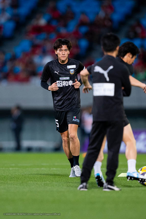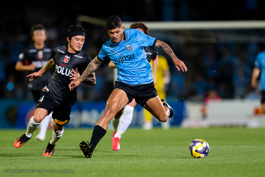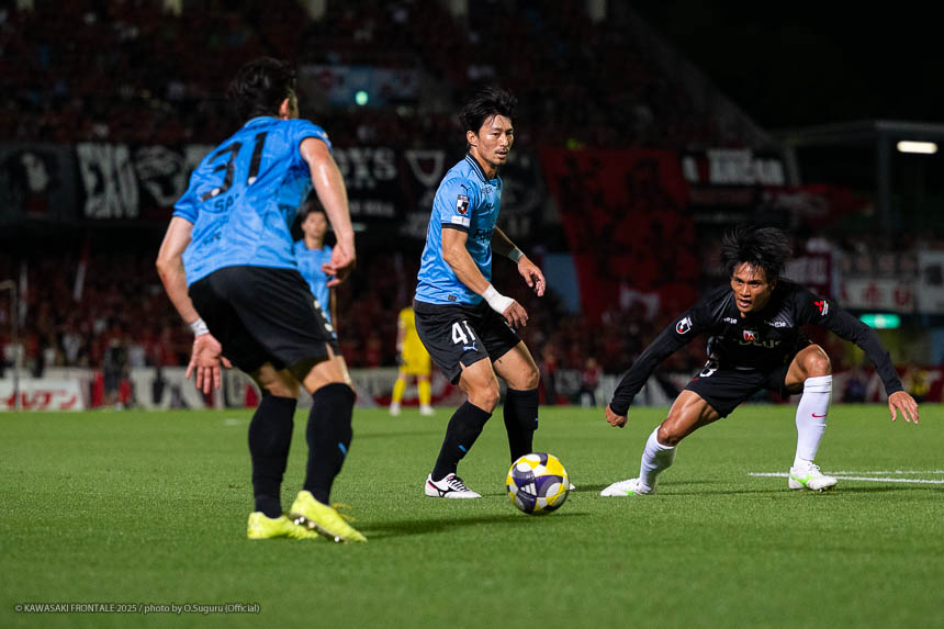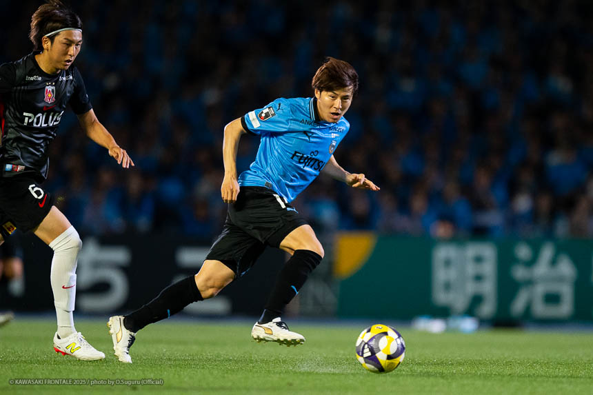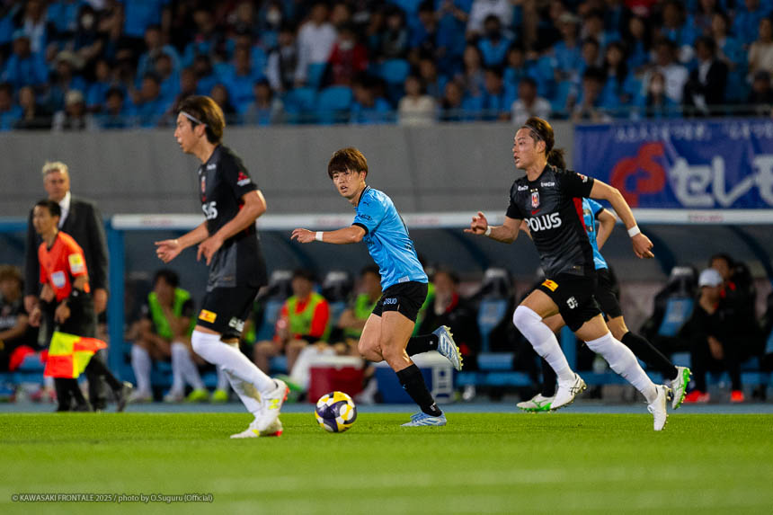 フロンターレのスターティングメンバーはトップにエリソン、その下に脇坂、左ワイドにマルシーニョ、右に伊藤、ボランチは橘田と河原のコンビ、最終ラインは佐々木-丸山-高井-際、GK山口。1分、フロンターレの攻撃。中盤で河原がルーズボールを拾いマルシーニョが左サイドから切れ込むが止められる。4分、佐々木が左サイド裏のスペースにボールを入れマルシーニョが競り合うがボールを収められず。6分、相手陣内でボールを奪い右サイドから崩しをかけ脇坂が深い位置に入り込むがクリアされる。9分、丸山が左サイドに展開。相手陣内でボールを動かす。9分、河原がゴール前に浮き球を入れエリソンが競り合うがGKに触られる。12分、浦和の攻撃。右スローインから崩しを狙われるがチームディンフェスで対応。13分、フロンターレの攻撃。右サイドから崩しをかけ伊藤が切れ込みゴール前にボールを入れるがエリソンにうまく収まらず。15分、浦和の攻撃。自陣でカットされ右サイドからクロスが入り、こぼれ球を拾われ連続してゴール前にボールを入れられるが守備陣が対応。17分、左サイドに振られ長沼に突破をしかけられるが際が対応。19分、フロンターレの攻撃。相手陣内でパスをつなぎ押し込む。21分、浦和の攻撃。右サイドから突破をしかけられるが守備陣が対応。22分、セカンドボールを拾われ右サイドからクロスが入るが守備陣がクリア。24分、ロングボールを入れられ右サイドから崩しをかけられるが河原が戻りながら対応。25分、右コーナーキック。金子のボールが入るが守備陣が対応。30分、右サイドに展開され金子にクロスを入れられるが丸山がクリア。