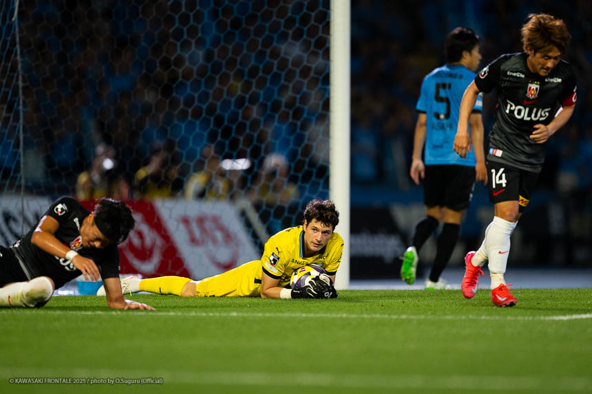 46分、フロンターレのメンバーチェンジ。伊藤に代わって瀬川がピッチへ。47分、フロンターレの攻撃。中盤右から際が浮き球を入れ瀬川がヘッドで流すが山田に合わず。48分、丸山が左サイド裏のスペースにロングボールを入れマルシーニョが粘って折り返すがうまく合わず。50分、浦和の攻撃。右コーナーキック。金子のボールはGKパンチング。セカンドボールを拾われ関根に遠めからシュートを打たれるが枠を外れる。53分、フロンターレの攻撃。中盤でボールを奪い左サイドに展開。佐々木が逆サイドに入れパスをつなぎ橘田がシュートに持ち込むがブロックされる。さらに攻勢をかけるがフィニッシュにつながらず。55分、浦和の攻撃。攻勢をかけたところでカウンターを浴びセカンドボールを拾われ圧力をかけられるが守備陣が戻りしのぐ。56分、右サイドでパスをつながれフリーで金子に抜け出され、折り返しを関根に合わせられるがポストに当たったボールはGK山口がキャッチ。危ない場面だった。58分、細かくパスをつなぎ左サイドから崩しをかけ佐々木がクロスを狙うがブロックされる。58分、左コーナーキック。脇坂のボールが入るがフロンターレのファウルの判定。62分、パスをつなぎ左サイドに展開。佐々木が突破をしかけ折り返すがGKにキャッチされる。64分、浦和の攻撃。左コーナーキック。マテウス サヴィオのボールはマルシーニョがクリア。65分、自陣からボールを運ばれ左サイド松尾に突破を許し深い位置に入りこまれるが折り返しは丸山がクリア。70分、右サイドに振られセカンドボールを拾われ押し込まれるがチームディフェンスで耐える。70分、フロンターレのメンバーチェンジ。河原に代わって山本、マルシーニョに代わって家長がピッチへ。71分、フロンターレの攻撃。左サイドでパスをつなぎ佐々木がタメを作りシュートを放つがGKにセーブされる。さらに攻勢をかけ左サイドから山本がボールを入れるがGKにキャッチされる。