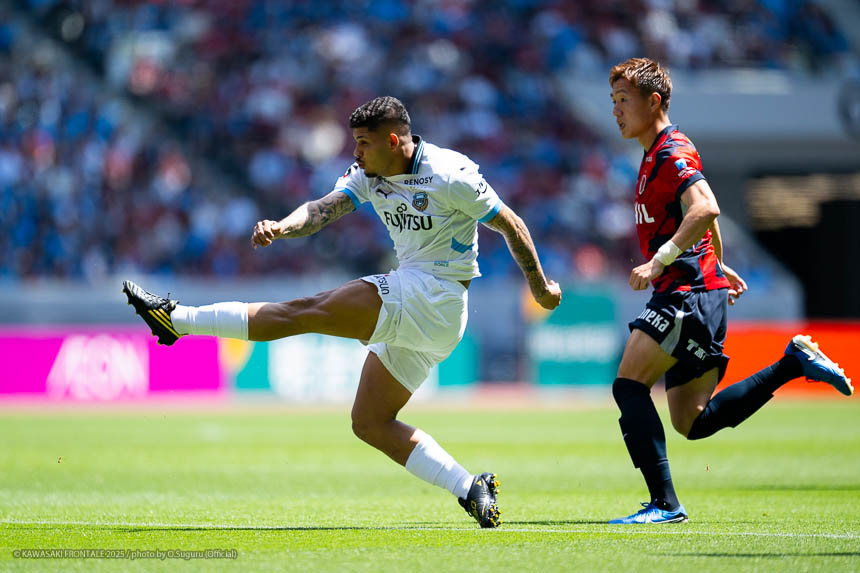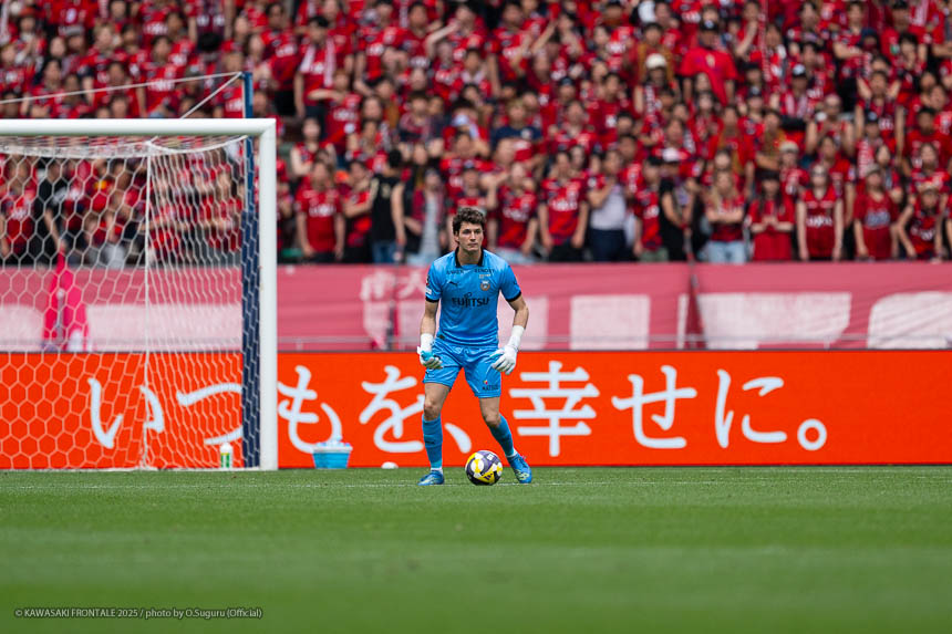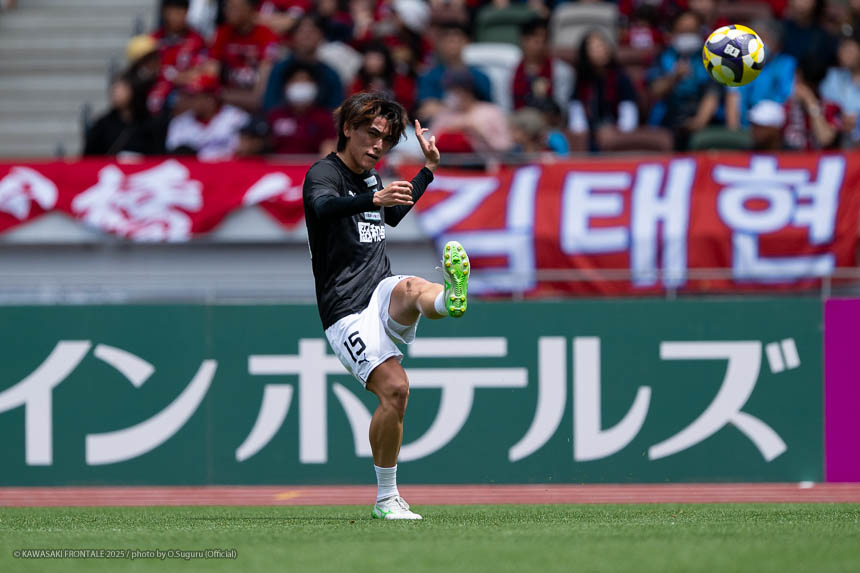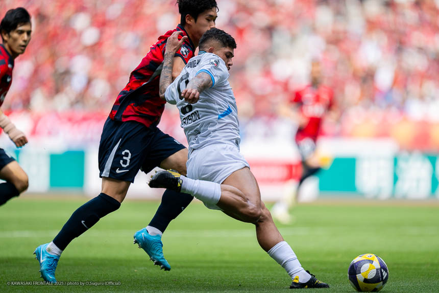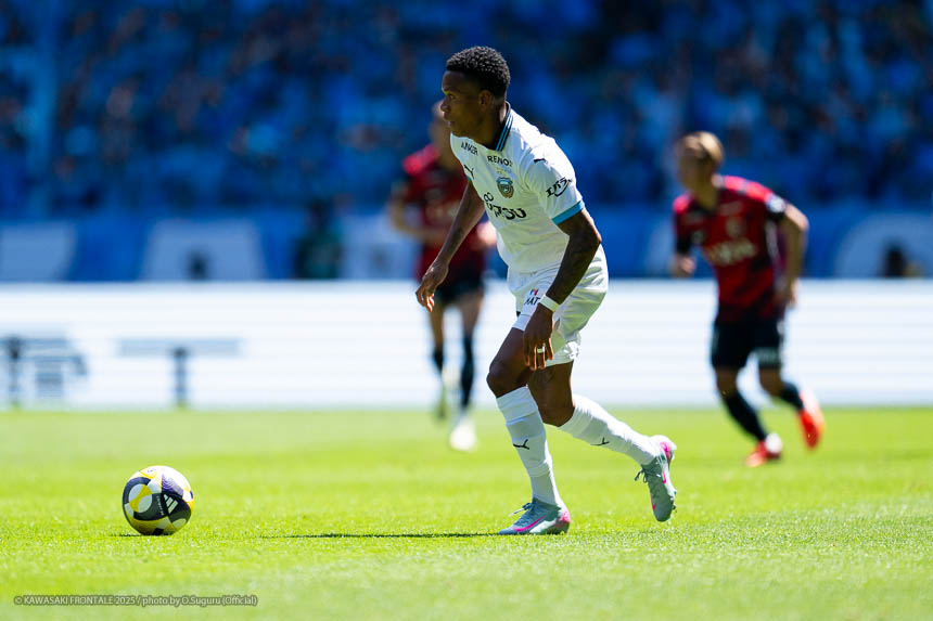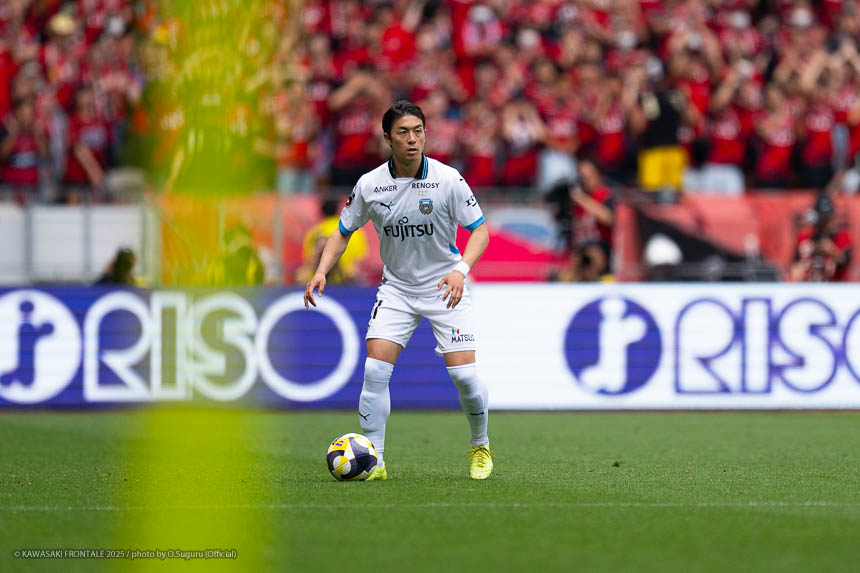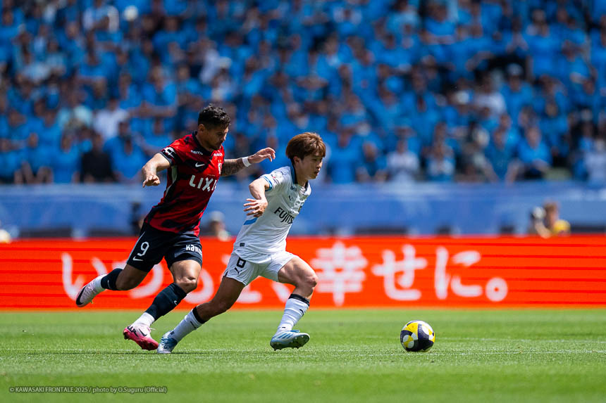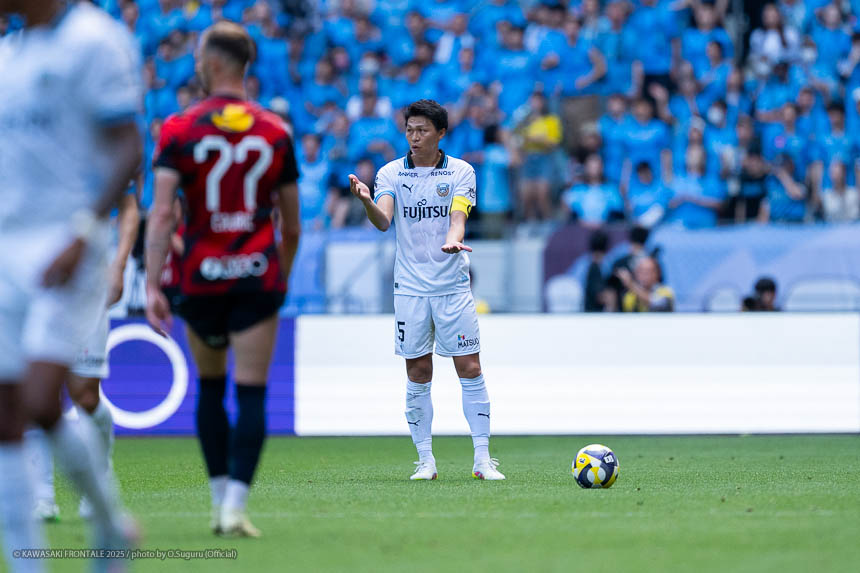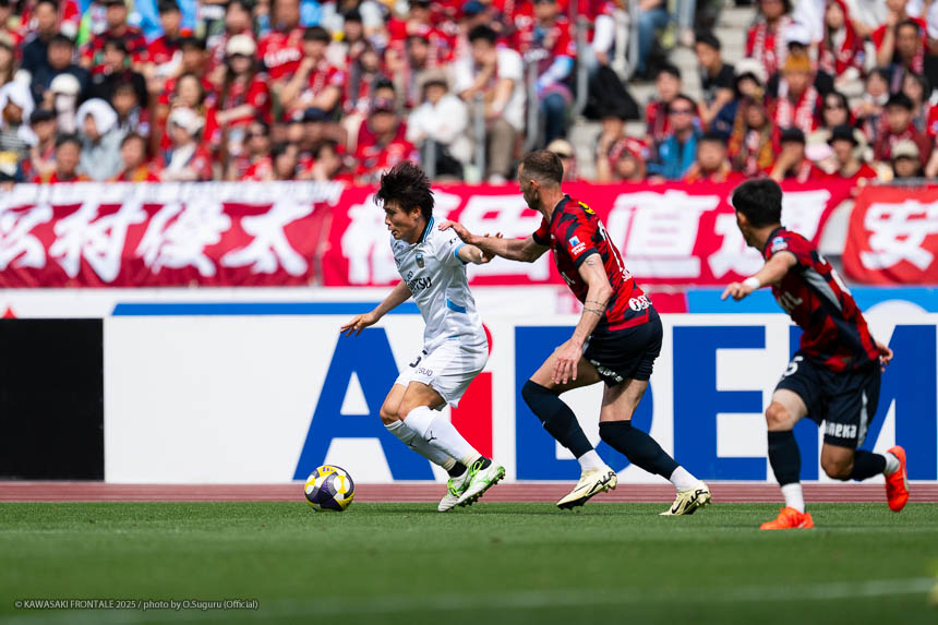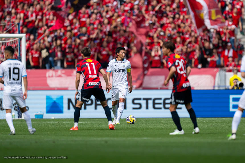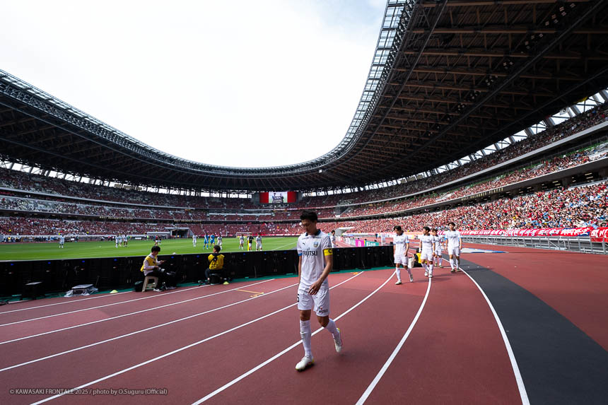 - 国立の舞台、ACLEで負けたあとのゲーム、オニさん(鬼木達監督)との再戦。本当に勝たなければいけない要因が多かった。そこで結果が出なかったことが残念。前半はチームとして狙っていた守備がうまくいかなかったシーンが多々あったが、攻撃ではいいところが多かった。先制点も取れたしチャンスも多く作れていたので、そこは一つ収穫かなと。ただ勝てていない。前半は大関(大関友翔)がすごくいいところでボールを引き出してプレーの速さをコントロールしてくれていたので、自分が前に出ていきやすくてボールを預けてうまくやれていたと思う。ただ大関がいなくなったときに少し手詰まった感じがあった。その流れで失点したので、そのあとにどうパワーを出してしていくかでチームの狙いもそうだし、途中から入ったシン(山田新)とソウマ(神田奏真)にもっとボールを入れてもよかったのかなと。そういったことも含めて、もっと得点を取りにいくプレー選択ができたと思っている。今後は得点を取れるチャンスで決めることや、守備で前から行って外されたとしても簡単に失点するような場面があってはいけないと思うので、しっかり耐えないといけない。勝っているときは耐えられていたので集中力を洗練しなければいけないと思う。複数失点が続いているが、上位に行くためには失点を減らさなければいけない。そこは明確な課題の一つだと思っている。ACLEの舞台を経験しての基準を忘れてはいけない。もう一回そこに戻りたい決意がある以上はレベルを落としてはいけない。より高いレベルやっていかなければいけないと思っている。