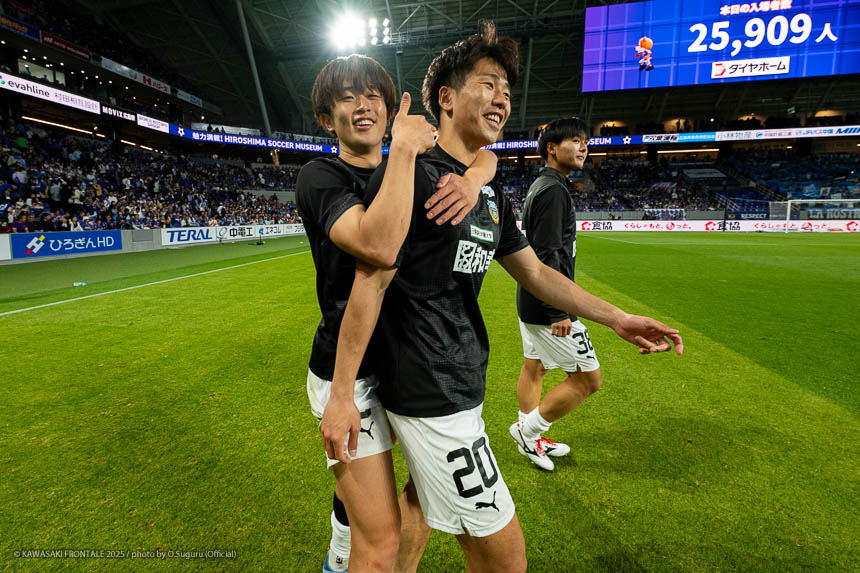 後半立ち上がりにフロンターレが先制点を奪い、その後もショートカウンターからチャンスを作るが追加点を奪うまでには至らず。するとメンバーチェンジで攻撃のパワーを強めてきた広島に終盤追いつかれる。しかしアディショナルタイムにコーナーキックの流れから佐々木がシュートを決め土壇場で勝ち越し、アウェイで大きな勝点3を手にした。