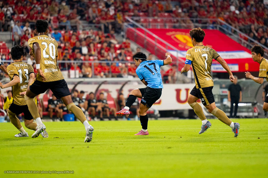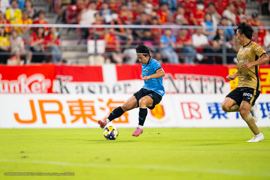 3分、フロンターレの攻撃。左サイドから崩しをかけるがフィニッシュにつながらず。5分、名古屋の攻撃。中盤でルーズボールを拾われ右サイドからクロスを入れられるがそのままラインを割る。迎えた7分、フロンターレの攻撃。左サイドから崩しをかけ、大関から折り返しを受けたエリソンがタメを作り横パス。中央の伊藤がDFの股を抜くシュートを決めて先制点を奪う。(1-0)9分、フロンターレの攻撃。前線でパスをつながれユンカーに遠めからシュートを打たれるが枠を外れる。10分、丸山が負傷。時計が止まる。12分、丸山に代わり神橋がピッチへ。14分、フロンターレの攻撃。パスをつないで相手陣内に押し込むがラストパスにつながらず。15分、大関と伊藤で前線からプレッシャーをかけて、ペナルティエリア内で相手のミスを誘うがシュートにつながらず。16分、右コーナーキックの場面。山本のボールはクリアされる。こぼれ球を拾い三浦が左サイドからボールを入れるがクリアされる。迎えた18分、フロンターレの攻撃。中盤で佐々木がボールをカット。山本がスルーパスを入れ、抜け出したエリソンが右足でシュートを決めて追加点を奪う。(2-0)20分、名古屋の攻撃。セカンドボールを拾われパスをつながれるがチームディフェンスで対応。21分、フロンターレの攻撃。中盤でボールを奪い速攻につなげ、伊藤がドリブルで右サイドから切れ込みシュートを放つがブロックされる。22分、名古屋の攻撃。サイドに振られゴール前にクロスが入り、ゴール前の混戦から連続してシュートを打たれるがGK山口、山本がブロック。決定的なシーンをしのぐ。24分、セットプレーの流れからセカンドボールを拾われるが守備陣が対応。25分、フロンターレの攻撃。名古屋の攻勢をしのぎカウンターにつなげ、左サイドから橘田がクロスを入れるがクリアされる。26分、佐々木が中盤からペナルティエリア前にボールを入れ、エリソンが粘ってシュートに持ち込むがブロックされる。27分、飲水タイム。