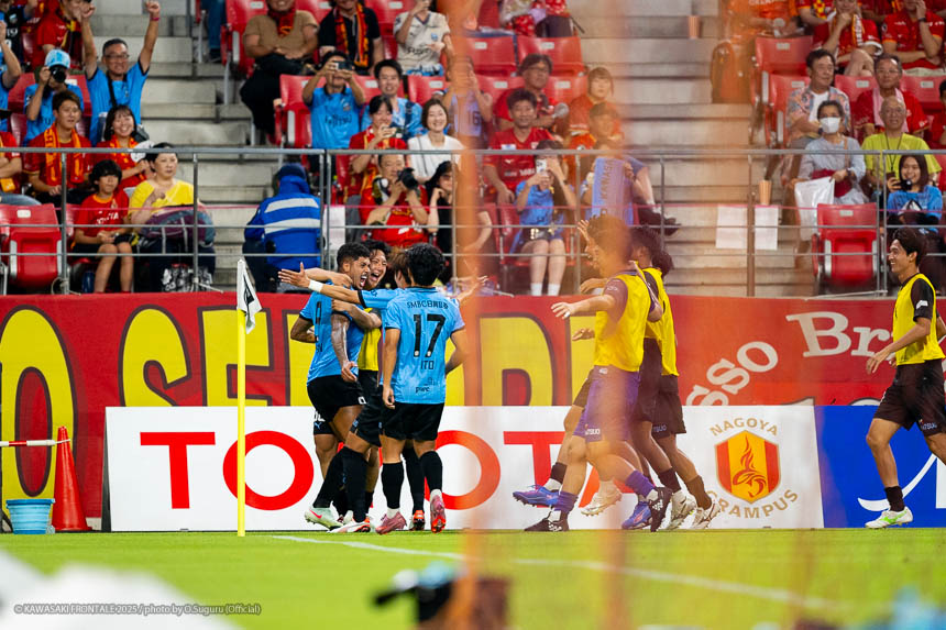 72分、名古屋の攻撃。相手陣内でボールカットされカウンターを狙われるが木村には佐々木が対応。73分、フロンターレの攻撃。セカンドボールを拾って圧力をかけ伊藤がシュートを放つがブロックされる。74分、左コーナーキックの場面。山本がボールを入れるがフロンターレのファウルの判定。76分、相手陣内でボールを動かし際が右サイドからミドルシュートを放つが枠を外れる。77分、セカンドボールを拾って相手陣内に押し込み、大関からの横パスを受けた際がシュートを放つがゴール右に外れる。77分、大関に代わり神田がピッチへ。78分、名古屋の攻撃。ロングボールのセカンドボールを拾われ速攻を受け、永井のシュートのこぼれ球を徳元に決められるがオフサイドの判定。VARチェックが入るがオフサイド判定のまま。危ない場面だった。迎えた80分、フロンターレの攻撃。VARの直後のプレー。神橋が自陣から大きく右サイドへサイドチェンジ。エリソンが切れ込みGKの股を抜くシュートを決める。(3-2)しかし迎えた81分、名古屋の攻撃。GKのロングボールから速攻を受け、永井の左サイドからの横パスをフリーの和泉に押し込まれる。(3-3)83分、名古屋の攻撃。左サイドからアーリークロスが入るがGK山口がキャッチ。84分、フロンターレの攻撃。三浦が左サイドからアーリークロス。クリアボールを拾ったエリソンが右サイドからシュートを放つがゴール左に外れる。85分、自陣からボールを運び三浦がオーバーラップ、左サイドから折り返すが神田に合わず。88分、パスをつないで押し込み際が右サイドから浮き球を入れるがクリアされる。90分、右サイドから崩しをかけエリソンがクロス。山本がダイレクトで合わせるがうまくミートせず。アディショナルタイム9分。90+1分、名古屋の攻撃。ロングボールのこぼれ球を拾われ右サイドからクロスが入り、山岸にヘッドで合わせられるが枠を外れる。90+2分、フロンターレの攻撃。カウンターをカウンターで返し伊藤が左サイドから切れ込みシュートに持ち込むがブロックされる。90+3分、さらに攻勢をかけ右サイドから際がクロス。流れたボールを拾った伊藤が切れ込みシュートに持ち込むがゴール左に外れる、90+3分、橘田に代わり持山がピッチへ。90+4分、フロンターレの攻撃。パスをつないで押し込み神田のポストプレーからエリソンがシュートに持ち込むが、DFに当たりゴール上に外れる。迎えた90+5分、フロンターレの攻撃。右コーナーキックの場面。山本のボールのこぼれ球を拾い、再び山本がクロス。逆サイドでこぼれ球を拾った伊藤がドリブルでゴール前に侵入。シュートを決める。(4-3)90+7分、名古屋の攻撃。GKのロングボールから右サイドの森にクロスを狙われるが持山が戻りブロック。90+8分、右コーナーキックの場面。徳元のボールは神田がクリア。90+8分、フロンターレの攻撃。名古屋の攻勢をしのぎ伊藤が中盤でこぼれ球を拾いカウンターにつなげ左サイドからラストパスを入れるがゴール前に合わず。90+9分、名古屋の攻撃。中盤からアーリークロスを入れられるがGK山口がキャッチ。90+10分、右サイドからのフリーキックの場面。徳元のボールは神田がクリア。クリアボールを稲垣に狙われるがミドルシュートはゴール上に外れる。試合は4-3でタイムアップ。
