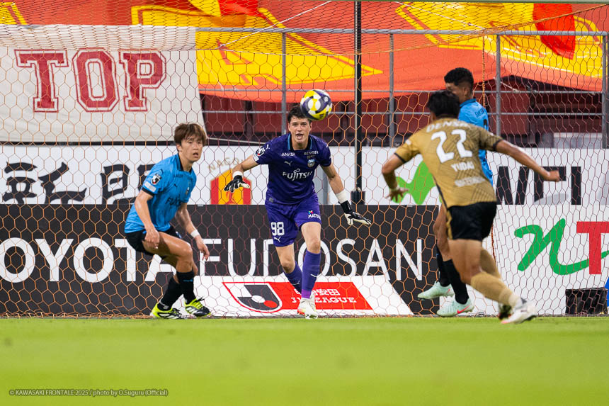29分、名古屋の攻撃。中盤でボールを奪われ左サイドから長いクロスが入るが三浦が対応。30分、サイドに振られセカンドボールを拾われ圧力をかけられるが守備陣がしのぐ。迎えた32分、名古屋の攻撃。左サイドから崩しをかけられ、稲垣のクロスを森にヘッドで合わせられる。(2-1)34分、名古屋の攻撃。さらに攻勢をかけられ右サイドからクロスが入るが守備陣が対応。35分、中盤でボールを奪い返されショートカウンターを狙われるが守備陣が対応。36分、右サイドから崩しを狙われるが稲垣には神橋が対応。37分、自陣からボールを運ばれアタッキングサードに持ち込まれるが橘田が戻り対応。40分、自陣からボールを運ばれパスを回されるが守備陣が対応。44分、中盤センターからのフリーキックの場面。森島のボールをヘディングで折り返されるが守備陣が対応。45分、フロンターレの攻撃。中盤でパスをつなぎ右サイドに展開。伊藤がクロスを入れるがゴール前に合わず。アディショナルタイム6分。迎えた45+3分、名古屋の攻撃。右サイドに振られ森のワンタッチの落としに走り込んだ原に切り返されシュートを決められる。(2-2)45+6分、フロンターレの攻撃、相手陣内深い位置で橘田がボールをカット。パスをつないで伊藤がシュートを放つが枠を外れる。45+7分、名古屋の攻撃。左サイドから崩しをかけられるが中山には伊藤が対応。立ち上がりに前線からプレッシャーをかけて伊藤、エリソンがシュートを決めて序盤で2点リード。しかし徐々に名古屋に圧力をかけられ1点を奪われ、さらに前半終了間際に失点を喫し2-2で折り返した。