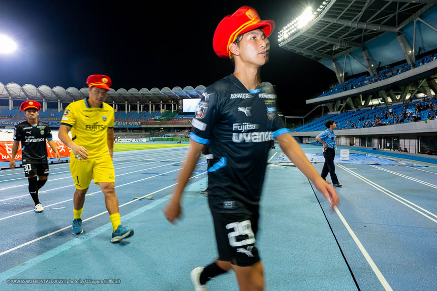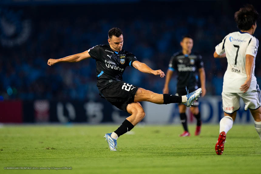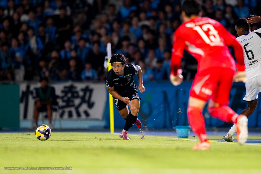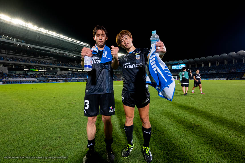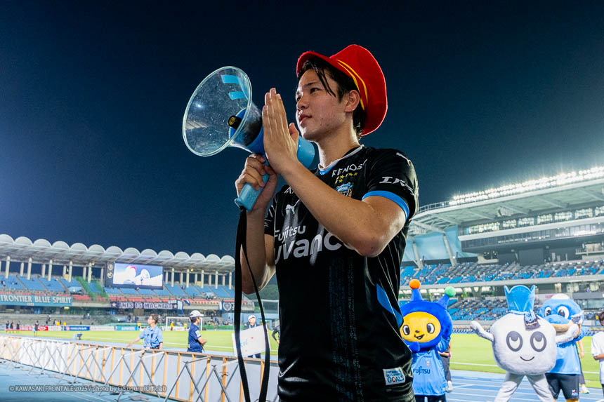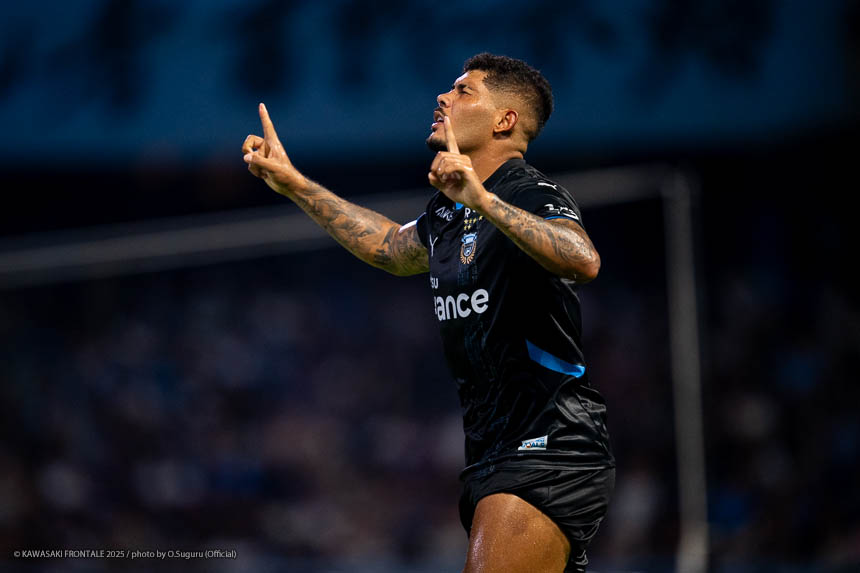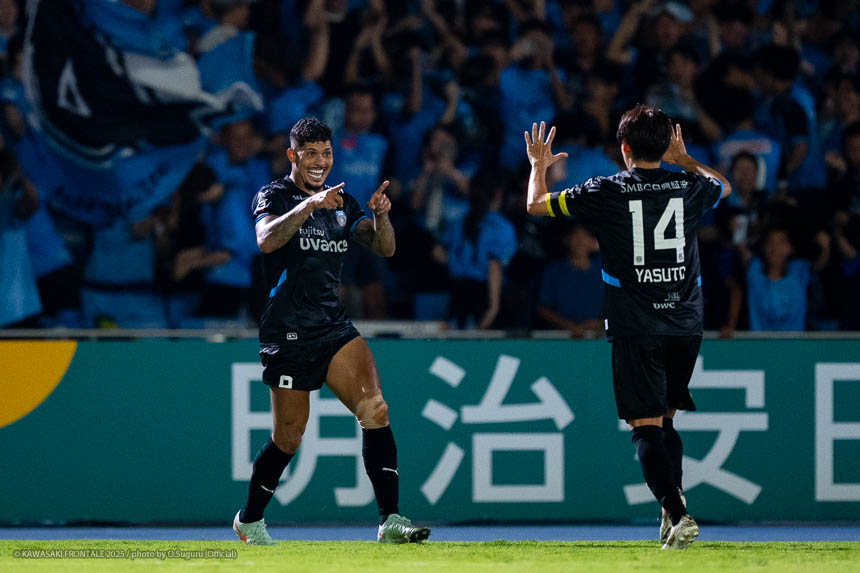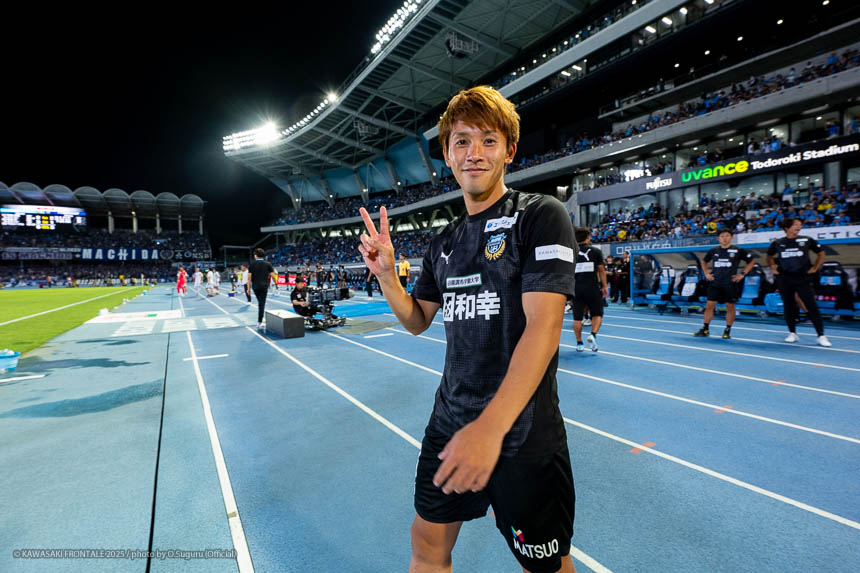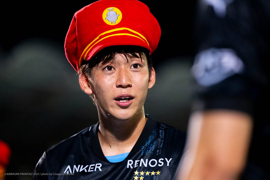 - 難しいゲームになったが、やはり勝てたことが一番大きいと思う。(自身の1点目は)練習でたくさん繰り返していたとおりのプレーになった。ユウキ(山本悠樹)からすばらしいボールが来た。ユウキは非常に能力の高い選手で、彼がボールを持てば自分の動きを見て毎回出してくれる。ボールを出してくれないと彼に怒ることもあるが、本当にいい選手だと思う。感謝している。(自身の2点目は)個人のプレーで自分のスピードとパワーを生かすことができたかなと思う。オフサイドだけは気をつけてゴール前に入っていこうと考えていて、ヤス(脇坂泰斗)からのボールをうまく足元に止めることができた。