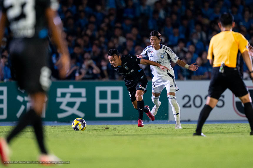 26分、町田の攻撃。自陣からボールを運ばれてカウンター。相馬にクロスを狙われるが際がブロック。26分、左コーナーキック。相馬のボールはエリソンがクリア。28分、フロンターレが右サイド裏のスペースへのボールを供給。オフサイドフラッグは上がったが、そのままプレーが続いてカウンター。左サイドからの相馬のクロスをナ サンホにヘッドで合わせられる(1-1)。31分、フロンターレの攻撃。右サイドに展開。伊藤が突破をしかけミドルシュートを狙うがブロックされる。33分、町田の攻撃。右サイドでルーズボールを拾われ、ゴール前にボールが入るがGK山口が飛び出しキャッチ。34分、中盤でボールを奪われカウンターを受けシュートに持ち込まれるが河原がブロック。36分、エリア右前からのフリーキック。下田に直接フリーキックを決められる(1-2)。39分、フロンターレの攻撃。パスをつないで押し込みウレモヴィッチが遠めからシュートを放つが枠を外れる。42分、町田の攻撃。左サイド裏のスペースを使われ相馬の折り返しを藤尾に合わせられるがボールは流れる。さらに攻勢をかけられ相馬に左サイドからシュートを打たれるがGK山口がキャッチ。危ない場面だった。43分、フロンターレの攻撃。伊藤のドリブルをしかけ左サイドの深い位置に入り込むが折り返しはブロックされる。44分、左コーナーキック。脇坂のボールからゴール前にボールがこぼれ混戦から橘田がシュートに持ち込むがゴール上に外れる。45+1分、町田の攻撃。セカンドボールを拾われゴール前にボールを入れられるが守備陣がクリア。45+2分、サイドに振られ崩しを狙われるが守備陣が対応。45+4分、フロンターレの攻撃。相手陣内でボールを奪い返し、山本がゴール前に浮き球を入れ、抜け出したエリソンがヘッドで合わせる(2-2)。45+5分、町田の攻撃。右サイドに長いボールを入れられ、望月にクロスを入れられるが藤尾にはウレモヴィッチが対応。なかなか町田の陣形を崩し切れない時間もあったが伊藤の個人技で先制。その後、逆転を許してしまうも山本とエリソンのホットラインで同点に追いついて前半を折り返した。