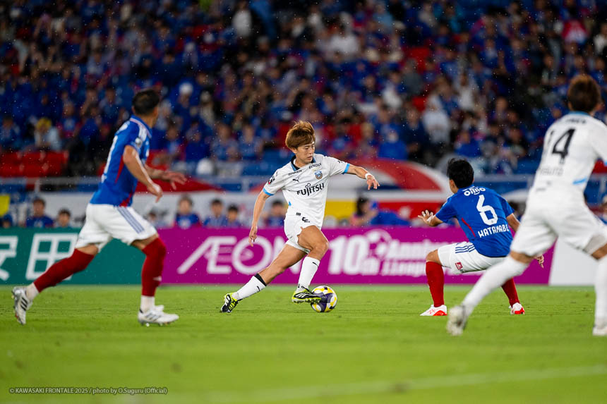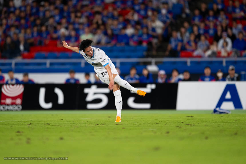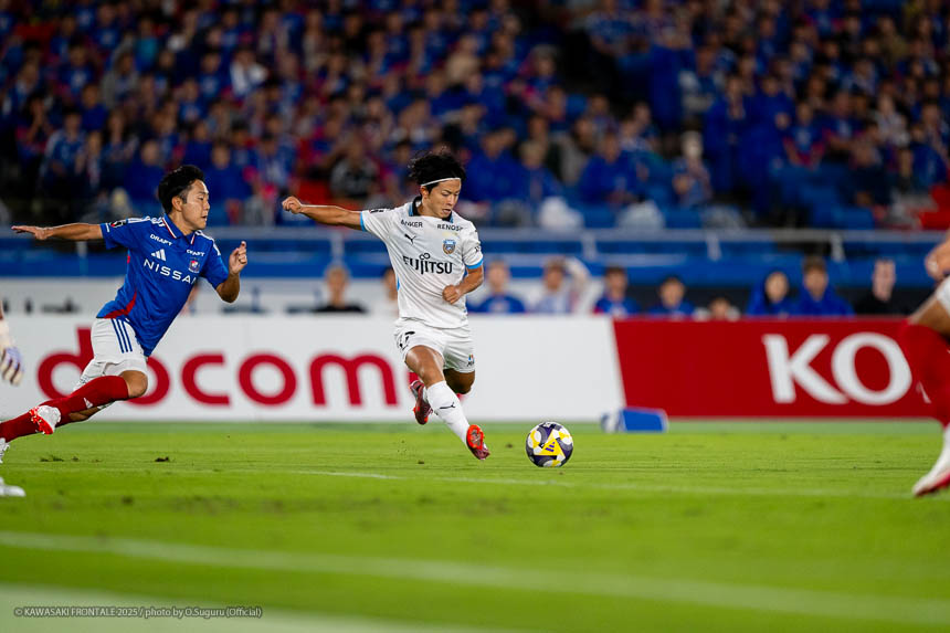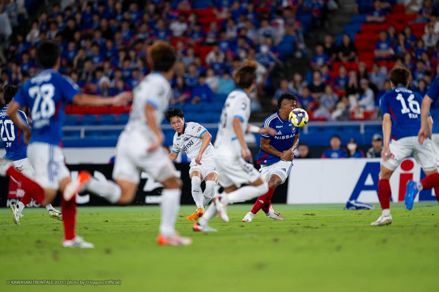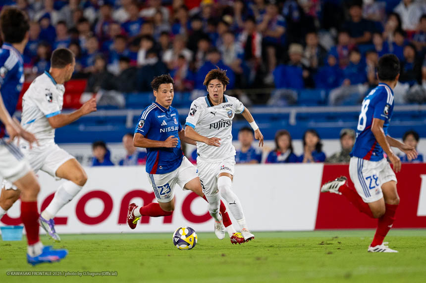 フロンターレのスターティングメンバーはトップにエリソン、その下に脇坂、左ワイドにマルシーニョ、右に伊藤、ボランチは山本と橘田のコンビ、最終ラインは三浦-佐々木-ウレモヴィッチ-際、GK山口。立ち上がり4分、フロンターレの攻撃。横浜FMのビルドアップを際が中盤右でインターセプト。右サイド裏に出たボールに走り込んだ伊藤が切れ込み左足でシュートを決めて先制点を奪う。(1-0)5分、横浜FMの攻撃。自陣から右サイドにロングボールを入れられるが植中には佐々木が対応。7分、相手GKからのロングボールがこぼれペナルティエリア内に入るがウレモヴィッチが対応。9分、右サイドから崩しをかけられペナルティエリア内にボールが入るが守備陣が対応。10分、左サイドからのフリーキックの場面。クイックリスタートから左サイド裏のスペースを突かれるがクロスはそのままゴールラインを割る。11分、フロンターレの攻撃。中盤でボールをカット。脇坂が左サイドに展開しカウンターにつなげ、マルシーニョが突破をしかけるがブロックされる。13分、左コーナーキックの場面。脇坂のボールはクリアされる。クリアボールに反応した際がダイレクトで合わせるがミドルシュートは枠を外れる。15分、三浦が左サイド裏のスペースにボールを入れ、エリソンが収めて深い位置から折り返すが走り込んだ山本に合わず。16分、さらに攻勢をかけてマルシーニョが左サイドからシュートに持ち込むがブロックされる。17分、山本が中盤からスルーパスを入れ、抜け出した脇坂が右サイドから折り返し。マルシーニョがダイレクトで合わせるがGKの攻守に阻まれる。惜しい場面だった。19分、自陣でのインターセプトからカウンターにつなげ、右サイドの伊藤からボールを受けたエリソンが右足でシュートを放つがGKにキャッチされる。21分、横浜FMの攻撃。パスをつながれ左サイドから切れ込んだ井上にシュートを打たれるが守備陣がブロック。さらに攻勢をかけられるが守備陣が対応。23分、右サイドから崩しを狙われクルークスにクロスを入れられるが佐々木がクリア。