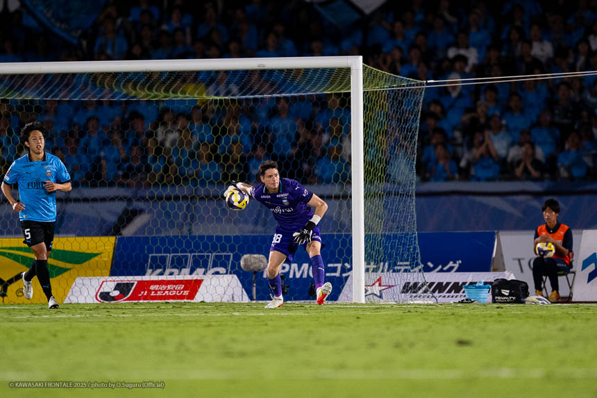 - けっこう勇気のいることでした。ただ、コウタ(真田幸太選手)とは2年一緒にやっていて、日頃一緒に関わるなかで波がない。不器用ですけどシュートを止める能力はたぶん一番高いと思いますし、サイズもありますし、そういう圧を出したかったというところ。それとフロンターレさんに対して、それでも(相手に)攻められるし、クロスも多くなるというところで、そこはいまポープ(ポープ ウィリアム選手)やシュン(吉田舜選手)、タツ(永井建成選手)に比べたら長けていると思うので、そういうところから入ってというところです。あとはキックで裏返せるというパワーもあるので、そういうところをフロンターレさんの背後、サイドバックの裏というところは一つの狙い目だと思って(起用しました)。彼がいい準備をしてくれたからこそだと思いますし、GK陣には話しましたけど自分のチョイスなので、タイプがいろいろあるなかでのチョイスの戦い方なので、全員でそれを表現できたのが今日のコウタだったと思います。コウタだけではなくて引き続きいい準備のなかからやってもらえればいいなと思いますし、そういうなかからしっかり選んできたいと思います。