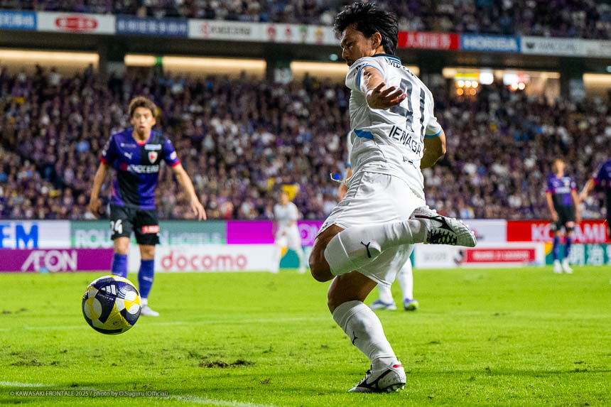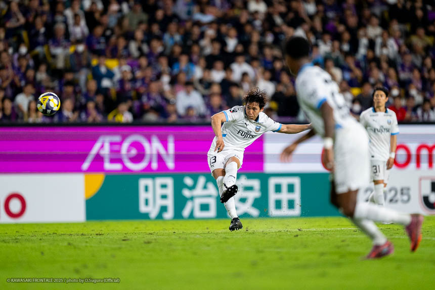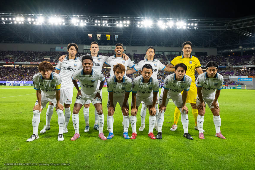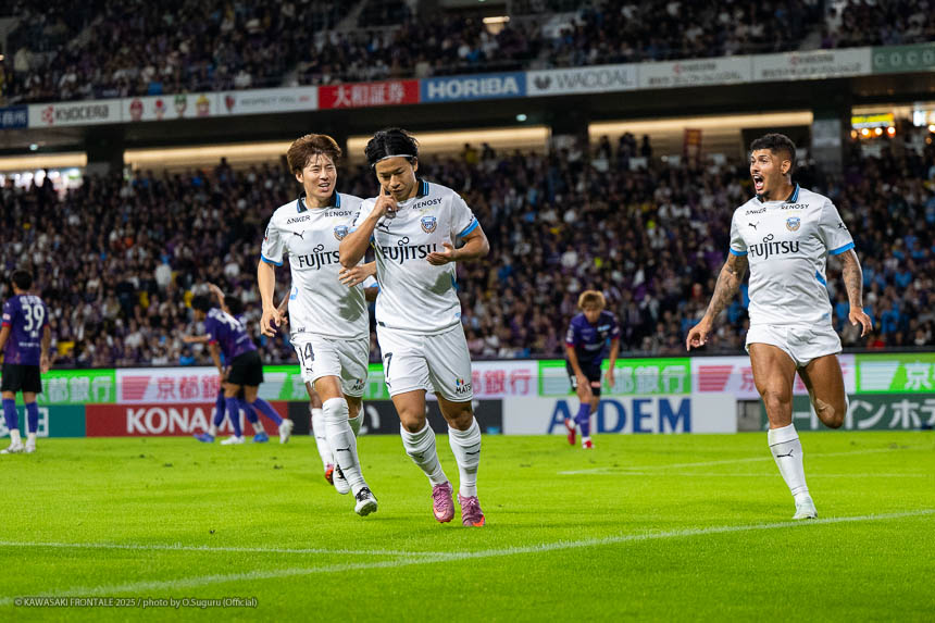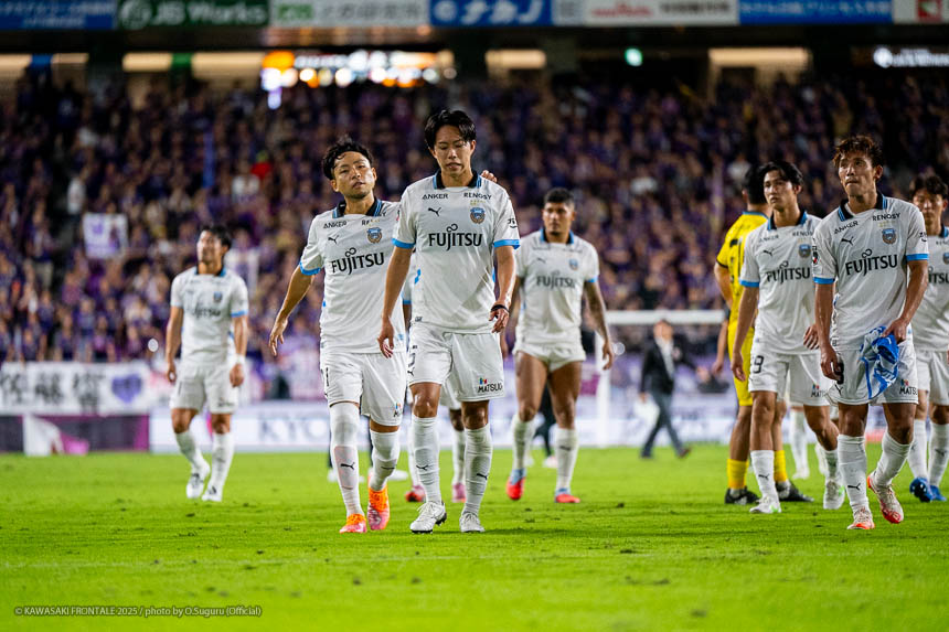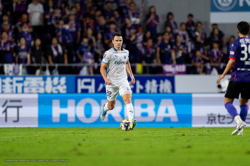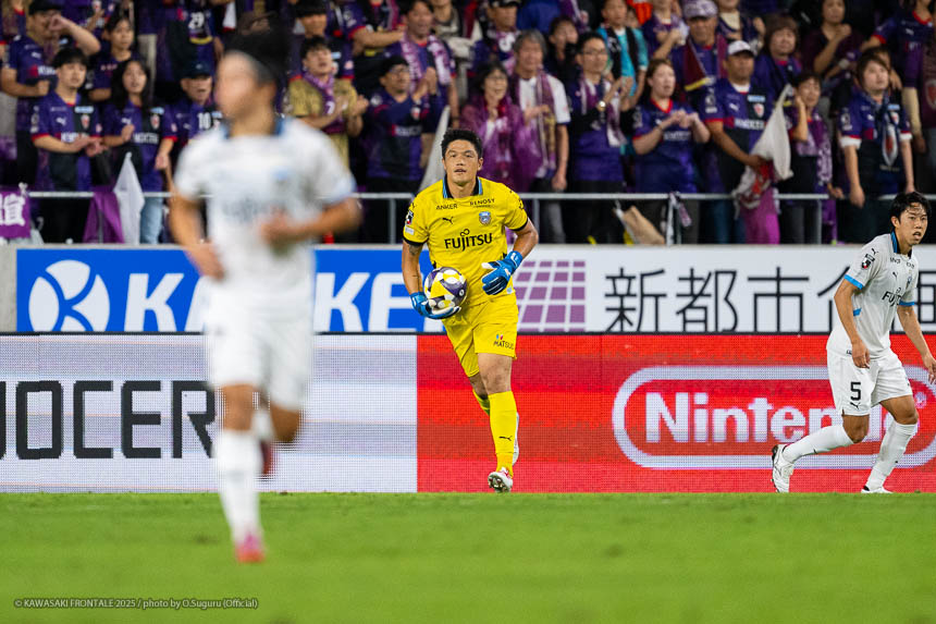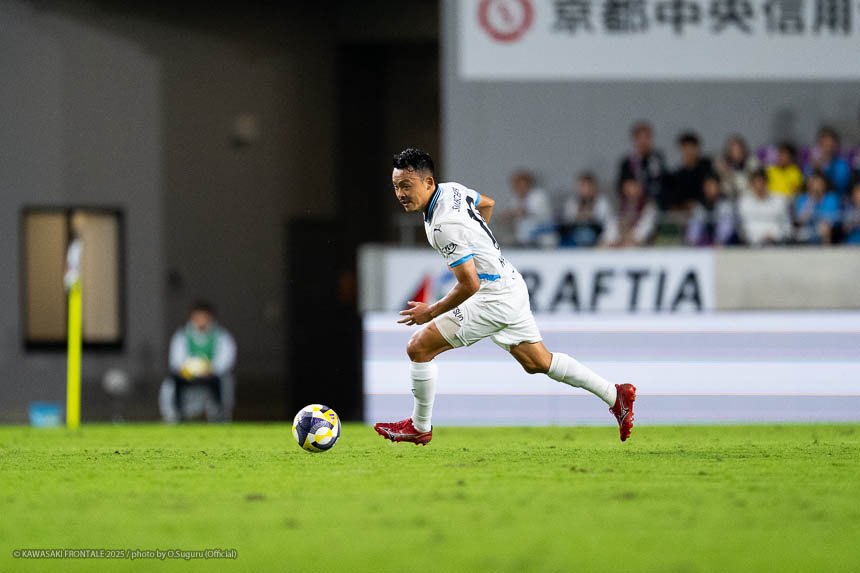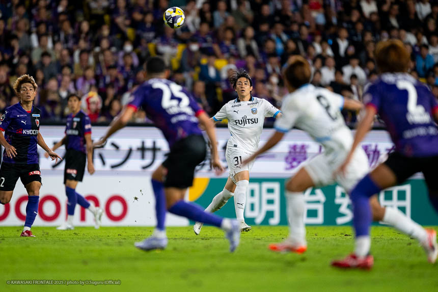 25分、京都の攻撃。パスをつながれ右サイドから崩しをかけられるが守備陣がしのぐ。さらにパスをつながれ押し込まれるがチームディフェンスで対応。26分、中盤でボールをカットされショートカウンターを浴び、ペナルティエリア前の奥川にボールが渡るが守備陣が対応。26分、フロンターレの攻撃。直後にカウンターをしかけ、左サイドの伊藤が粘って速いボールを入れゴール前に飛び込んだ河原が足を伸ばすがゴール上に外れる。惜しい場面だった。27分、京都の攻撃。左サイドから崩しをかけられるが守備陣が対応。28分、フロンターレの攻撃。直後に反撃をかけ伊藤が時間を作り右サイドからシュートを放つがGKにセーブされる。さらにウレモヴィッチが背後のスペースにボールを入れ、前線でエリソンが競り合うがフィニッシュにつながらず。29分、パスをつないで左サイドから崩しをかけ、脇坂とのパス交換から伊藤が左サイドからシュートを放つがゴール右に外れる。惜しい場面だった。31分、京都の攻撃。ロングボールのこぼれ球を拾われゴール前に圧力をかけられるが守備陣がしのぐ。32分、セカンドボールを拾って相手陣内でボールを動かす。33分、京都の攻撃。逆にカウンターを狙われるが橘田が戻り対応。36分、京都の攻撃。中盤でボールを回され押し込まれるがチームディフェンスで対応。36分、フロンターレの攻撃。自陣からボールを運びゴール前に圧力をかけ、最後は際が深い位置から折り返すがGKにキャッチされる。迎えた38分、京都の攻撃。右サイドから崩しをかけられセカンドボールを拾われ、ペナルティエリア右の深い位置をとられると、折り返しに合わせた松田のシュートを須貝に押し込まれる。(1-1)40分、フロンターレの攻撃。左コーナーキックの場面。脇坂のボールはクリアされる。こぼれ球を三浦が合わせるがシュートは枠を外れる。43分、京都の攻撃。中盤から長いボールを入れられるがGKソンリョンがキャッチ。44分、フロンターレの攻撃。中盤でボールを奪い返し伊藤が右サイドからアーリークロスを入れるがGKにキャッチされる。44分、京都の攻撃。自陣でボールを奪われるが守備陣が対応。45分、フロンターレの攻撃。直後にマルシーニョのドリブルからカウンターにつなげ脇坂、橘田とシュートに持ち込むが京都ディフェンスにしのがれる。アディショナルタイム3分。45+2分、京都の攻撃。自陣でボールを奪い返され右サイドからのクロスをファーサイドで松田にヘッドで合わせられるがGKソンリョンがキャッチ。45+3分、中盤でボールを回され右サイド裏のスペースを狙われるが守備陣が対応。立ち上がりにカウンターから伊藤がシュートを決めて幸先よく先制。その後も押し気味に試合を進めるがチャンスをものにできず。すると京都の反撃を浴びワンチャンスを決められ失点。1-1で前半を折り返した。
