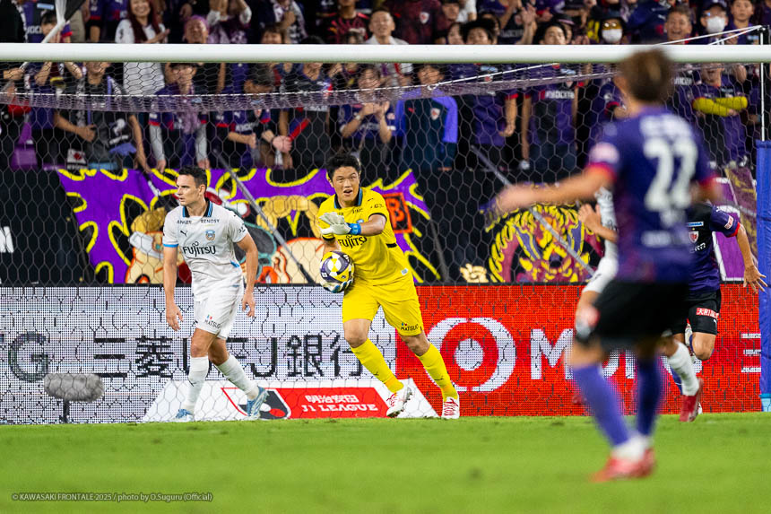 47分、フロンターレの攻撃。マルシーニョが左サイドから突破をしかけて折り返し。エリソンがダイレクトで合わせるが、シュートはゴール左に外れる。49分、京都の攻撃。リスタートの流れ。右サイドから折り返されるが佐々木がクリア。さらに攻勢をかけられるが原には佐々木が対応。52分、中盤でボールを奪い返され右サイドからアーリークロスが入るが守備陣がクリア。53分、右コーナーキックの場面。平戸のボールは守備陣が対応。53分、フロンターレの攻撃。直後にマルシーニョを起点にカウンターをしかけるがエリソンはシュートに持ち込めず。54分、京都の攻撃。背後のスペースにボールを入れられるが原にはウレモヴィッチが対応。55分、福田の右ロングスローをつながれゴール前に飛び込んだ松田にダイビングヘッドで触られるがゴール左に外れる。危ない場面だった。56分、中盤でルーズボールを拾われ速攻を狙われるが際が戻りながら対応。59分、フロンターレの攻撃。左コーナーキックの場面。脇坂のボールはクリアされる。こぼれ球を三浦が狙うがファウルで止められる。61分、ペナルティエリア右前からのフリーキックの場面。三浦が直接シュートを放つがGKの好セーブに阻まれる。63分、右コーナーキックの場面。脇坂のボールが入るが京都ディフェンスにしのがれる。67分、京都の攻撃。右サイド深い位置に浮き球を入れられるが、走り込んだレオゴメスには佐々木が対応。67分、フロンターレの攻撃。自陣からボールを運び右サイドから切れ込んだ際が浮き球を入れるがゴール前に合わず。67分、京都の攻撃。直後にカウンターを狙われるがウレモヴィッチが対応。68分、セカンドボールを拾われ圧力をかけられるが守備陣がしのぐ。70分、左サイドから崩しをかけられ須貝にクロスを入れられるがウレモヴィッチがクリア。71分、左コーナーキックの場面。平戸のボールがファーサイドに流れ山田にシュートを打たれるが橘田がブロック。ピンチをしのぐ。71分、右コーナーキックの場面。平戸のボールが入るが京都のファウルの判定。