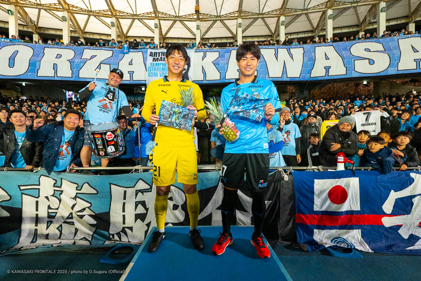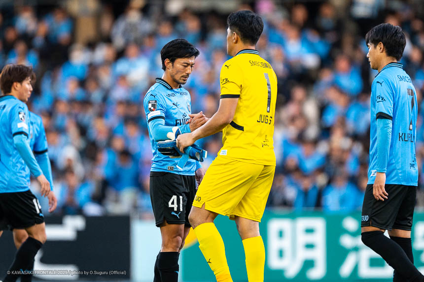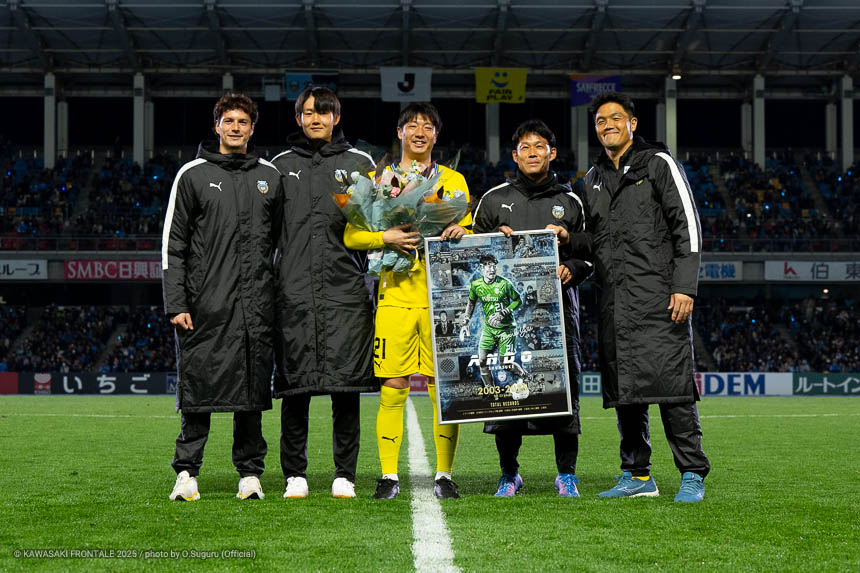 - GKが途中で入るのはケガ以外ではあまりないことだが、自分が呼ばれたときアンちゃん(安藤駿介)と一緒に出るという気持ちで試合に入った。最後にU等々力でファン、サポーターの方々と共に時間を過ごせてよかった。試合は負けてしまったが、試合前から退団する選手や引退する選手たちのために頑張ろう、走ろうという気持ちでいた。2016年にフロンターレに来てから最高のグラウンド、最高のサポーターのなかでプレーできた。なかなか優勝できなかったチームが、自分が入った次の年に優勝できたのもすごく印象に残っている。セレモニーでは手紙という形ではあるが、自分の言葉を聞いてほしかった。ちょっと足りなかったかもしれないが、自分の本当の気持ちが伝わっていたらうれしい。
