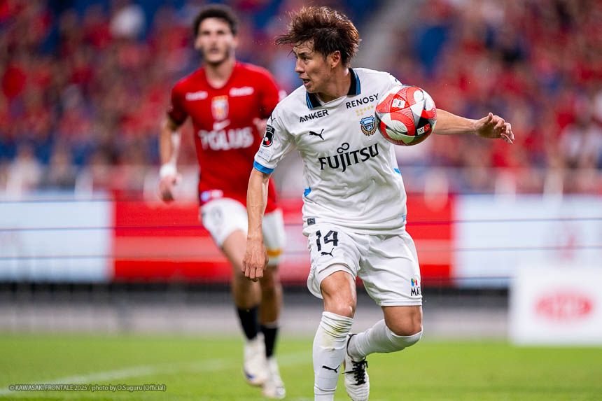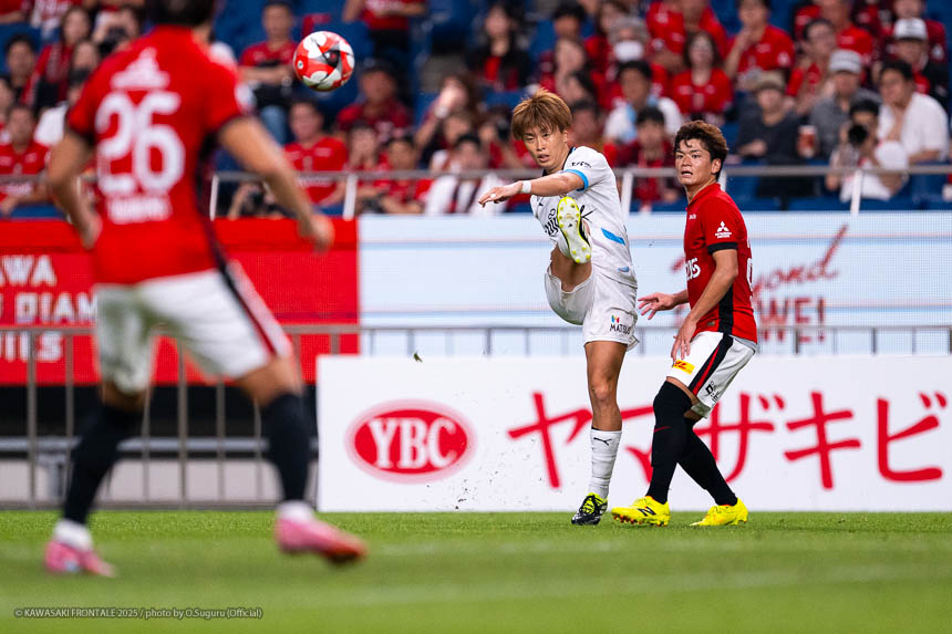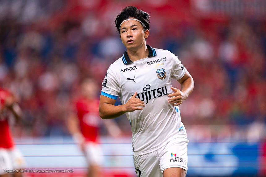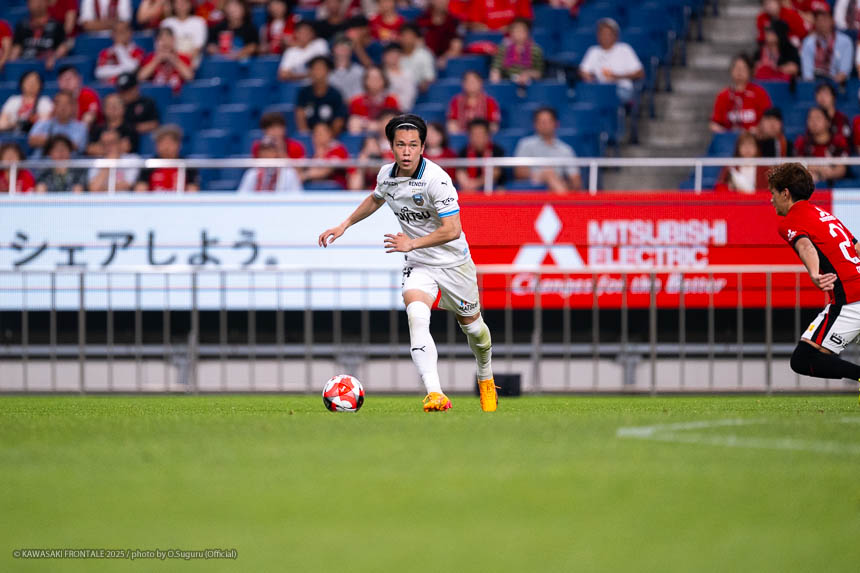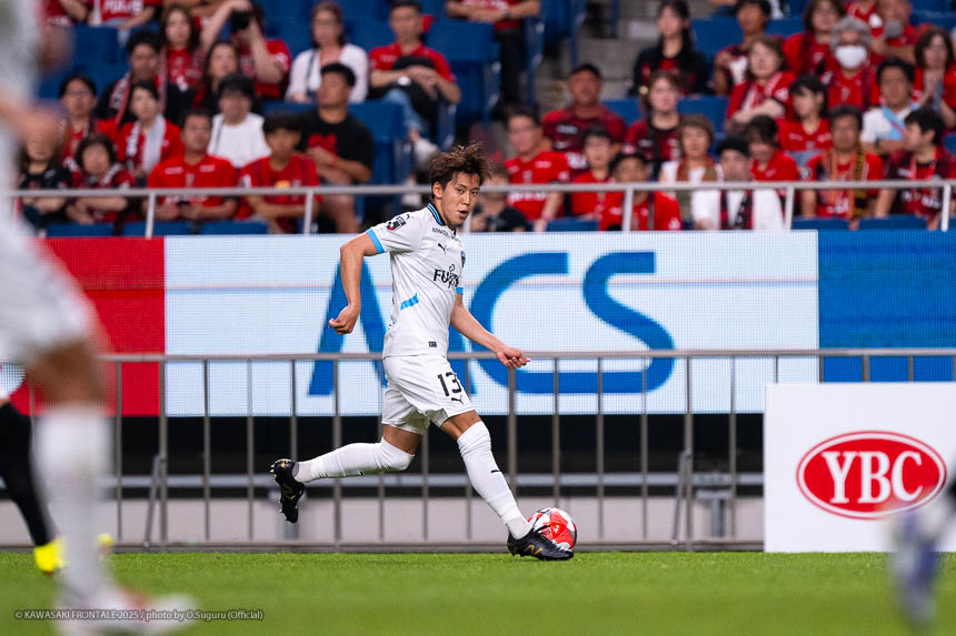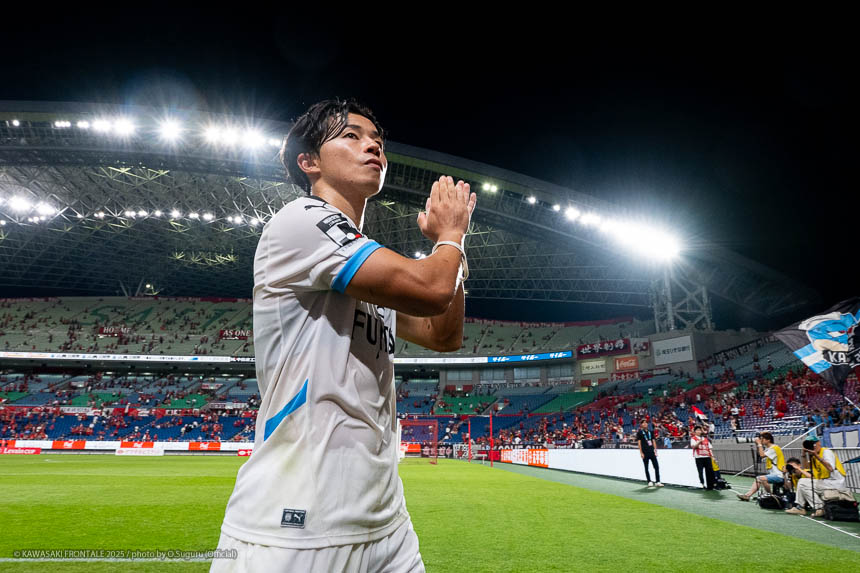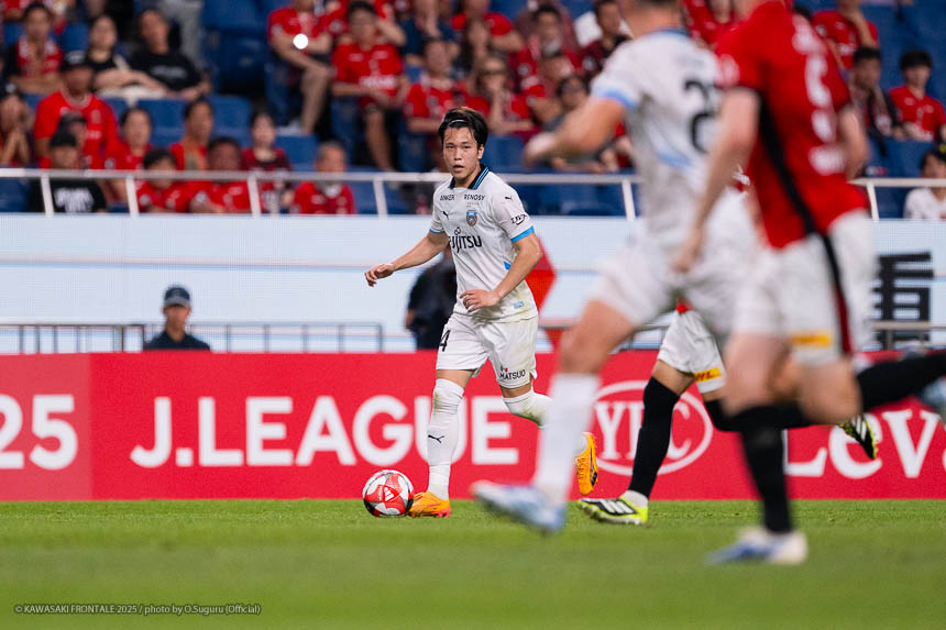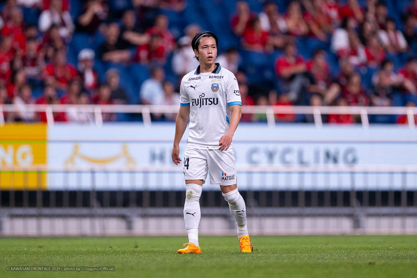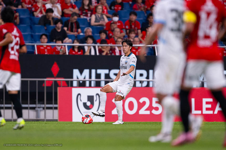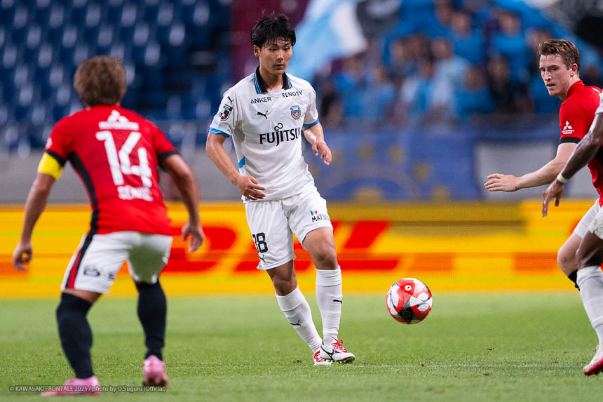 - 前半は根本(健太)選手のところで中途半端に行って簡単に裏を使われることが多かったので、後半からタツヤくん(伊藤達哉)となるべくサイドバックを使わせないような守備をしようと話していた。相手のセンターバックがけっこう距離をとってビルドアップしていて、ヤスくん(脇坂泰斗)とソウマ(神田奏真)の2人だけでは追いきれないので、サイドハーフがヘルプをしながらやらなければいけなかった。そこは自分たちで修正しながら第1戦を終えることができたのかなと思う。ただ自分たちから流れを悪くしてしまい、簡単に失点して嫌な流れになってしまった。ミーティングでもあったが浦和さんは後半に落ちてくると言われていたので、焦れずに戦って追いつくことができた。そういったところは第2戦も続けていきたい。