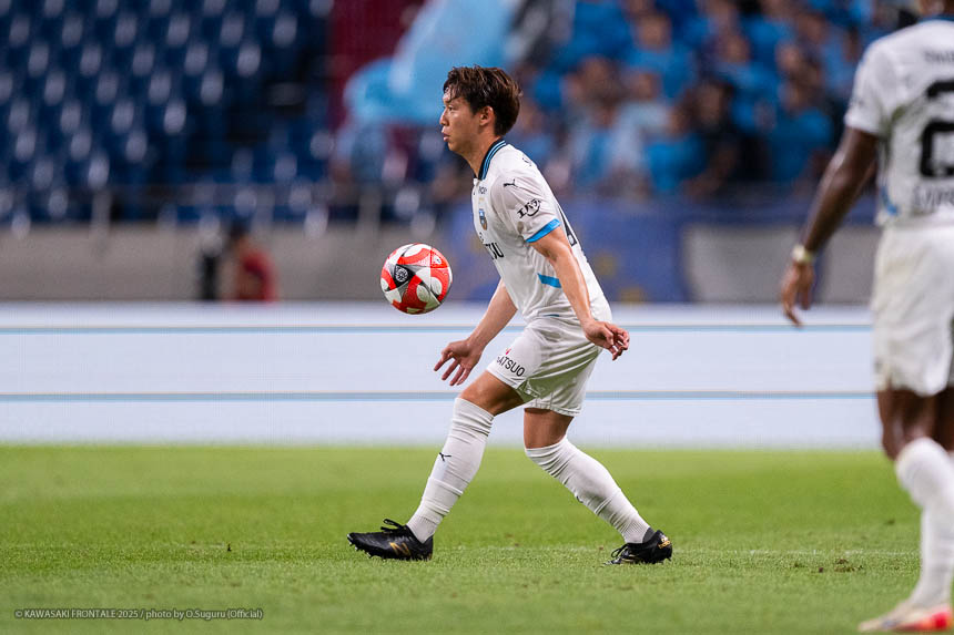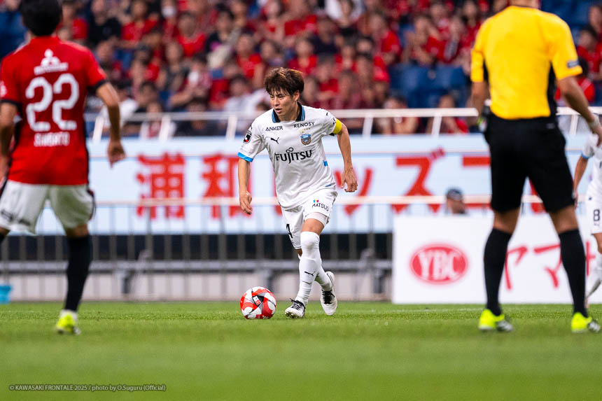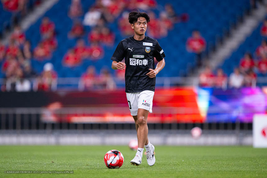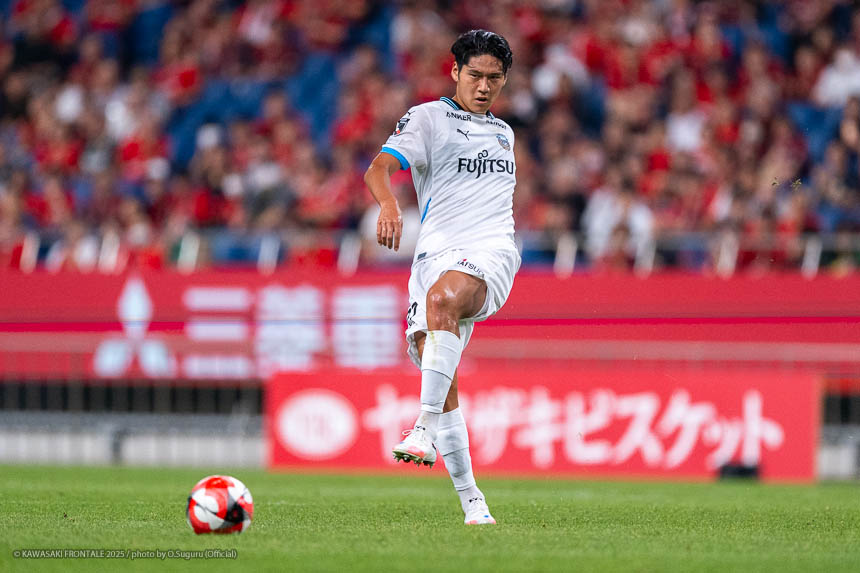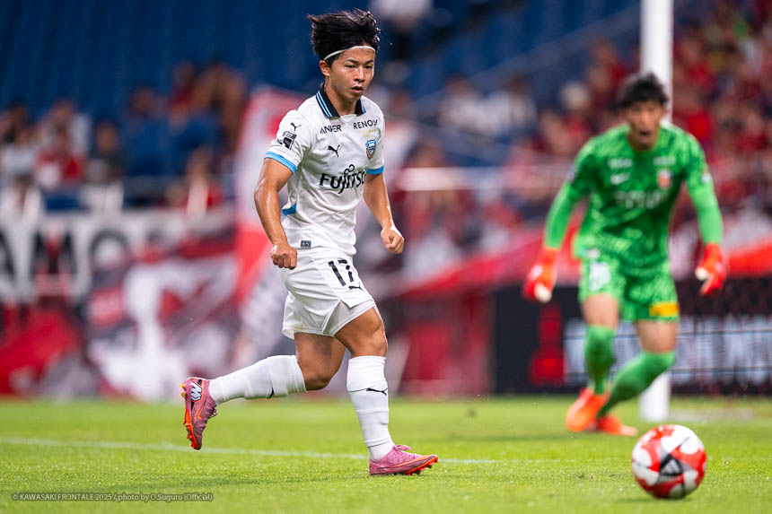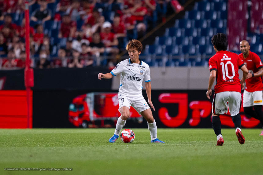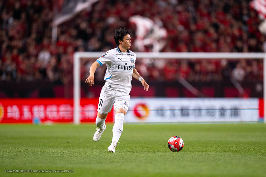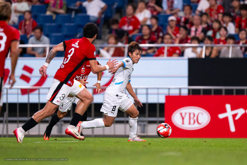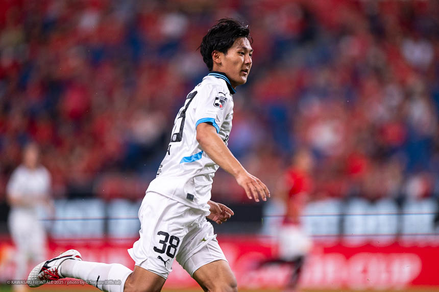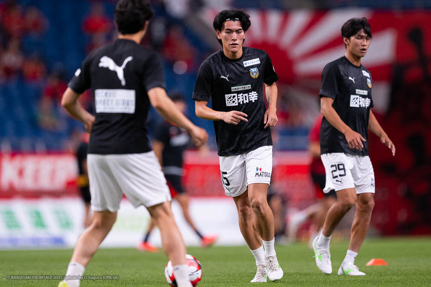 - 前半は根本(健太)選手のところで中途半端に行って簡単に裏を使われることが多かったので、後半からタツヤくん(伊藤達哉)となるべくサイドバックを使わせないような守備をしようと話していた。相手のセンターバックがけっこう距離をとってビルドアップしていて、ヤスくん(脇坂泰斗)とソウマ(神田奏真)の2人だけでは追いきれないので、サイドハーフがヘルプをしながらやらなければいけなかった。そこは自分たちで修正しながら第1戦を終えることができたのかなと思う。ただ自分たちから流れを悪くしてしまい、簡単に失点して嫌な流れになってしまった。ミーティングでもあったが浦和さんは後半に落ちてくると言われていたので、焦れずに戦って追いつくことができた。そういったところは第2戦も続けていきたい。