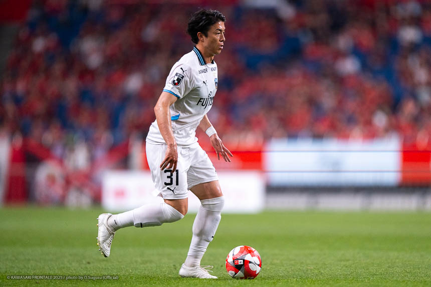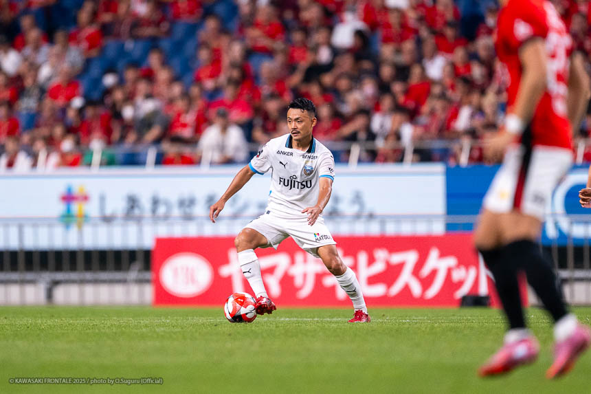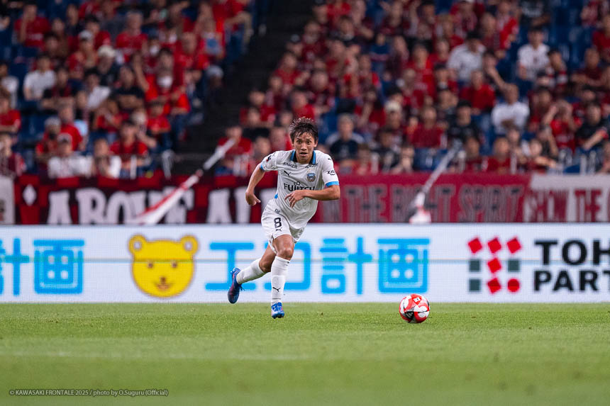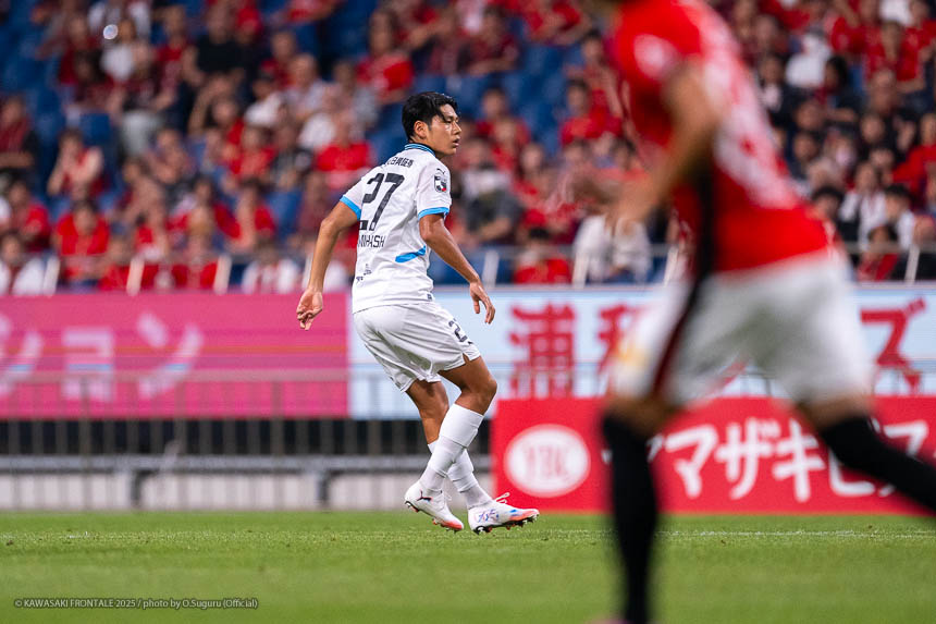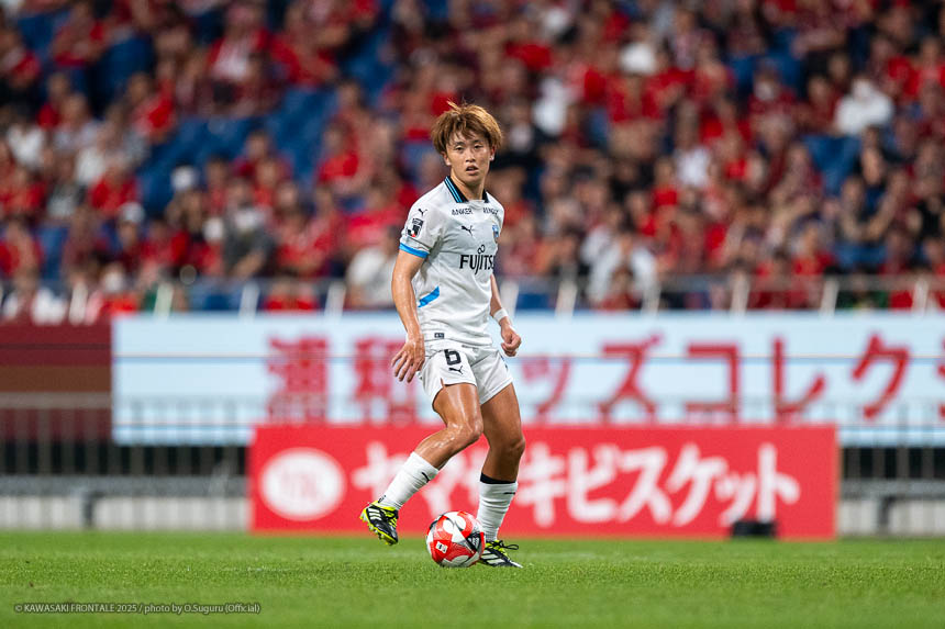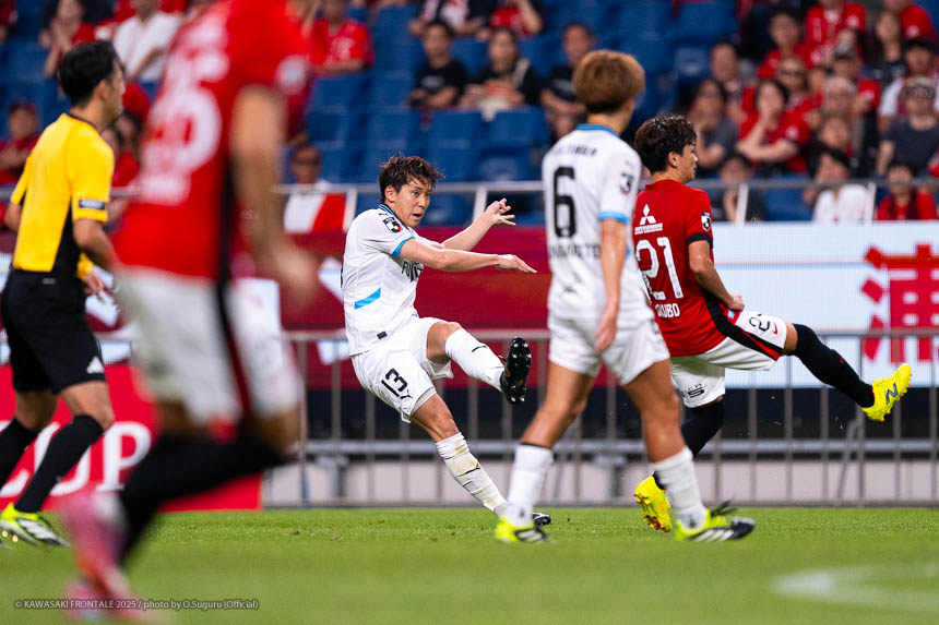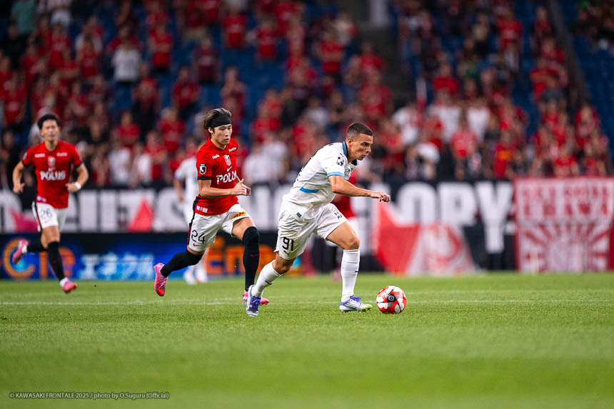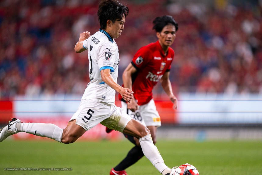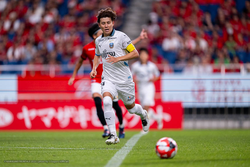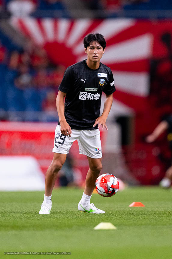 - 前半は根本(健太)選手のところで中途半端に行って簡単に裏を使われることが多かったので、後半からタツヤくん(伊藤達哉)となるべくサイドバックを使わせないような守備をしようと話していた。相手のセンターバックがけっこう距離をとってビルドアップしていて、ヤスくん(脇坂泰斗)とソウマ(神田奏真)の2人だけでは追いきれないので、サイドハーフがヘルプをしながらやらなければいけなかった。そこは自分たちで修正しながら第1戦を終えることができたのかなと思う。ただ自分たちから流れを悪くしてしまい、簡単に失点して嫌な流れになってしまった。ミーティングでもあったが浦和さんは後半に落ちてくると言われていたので、焦れずに戦って追いつくことができた。そういったところは第2戦も続けていきたい。