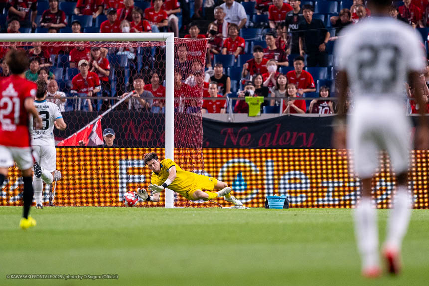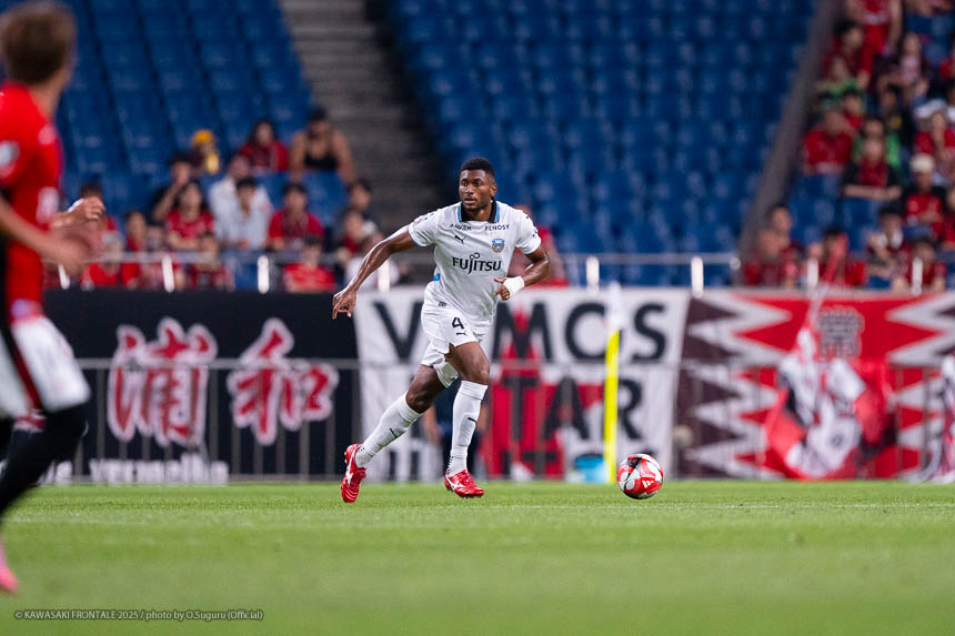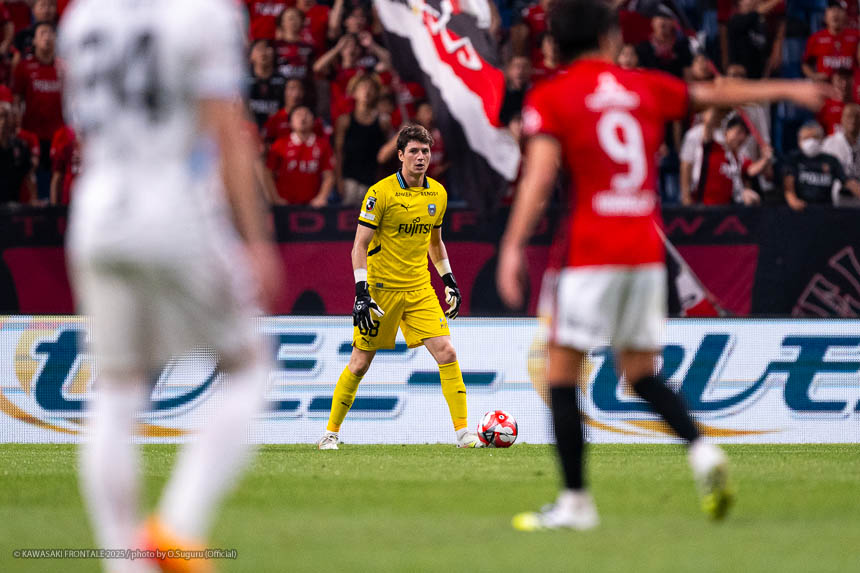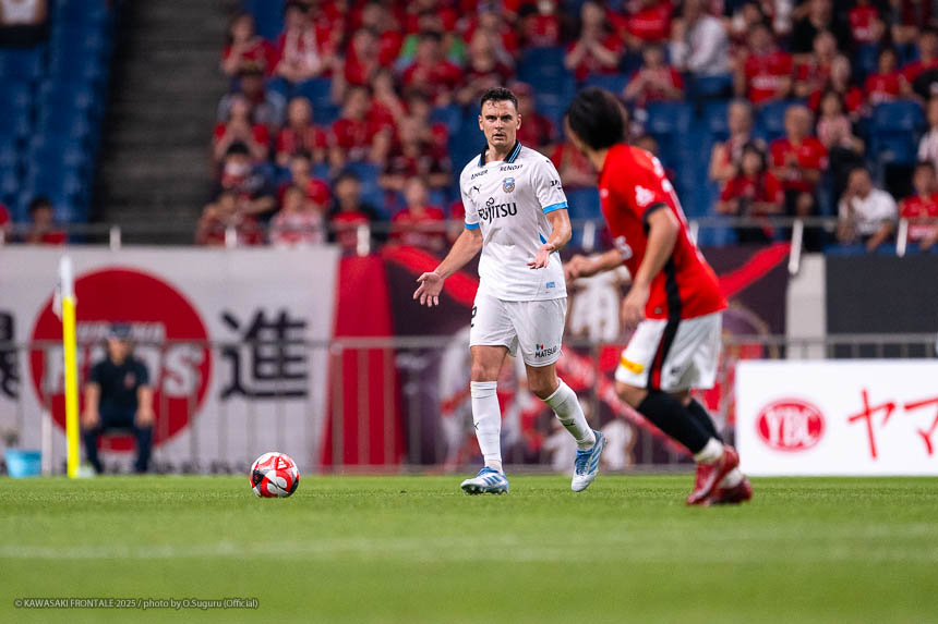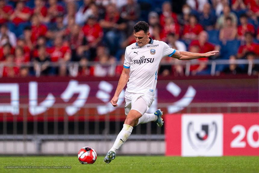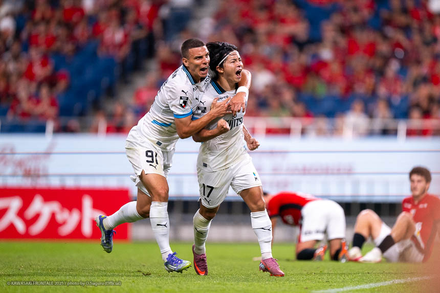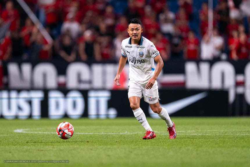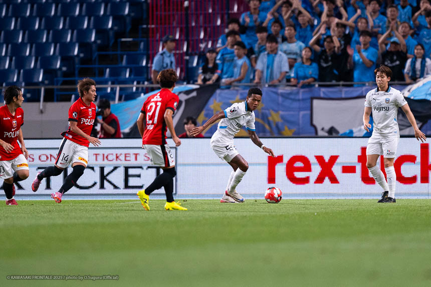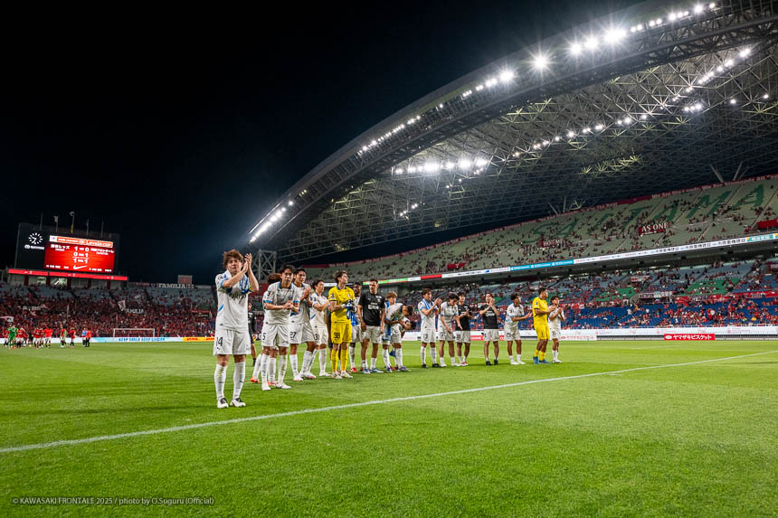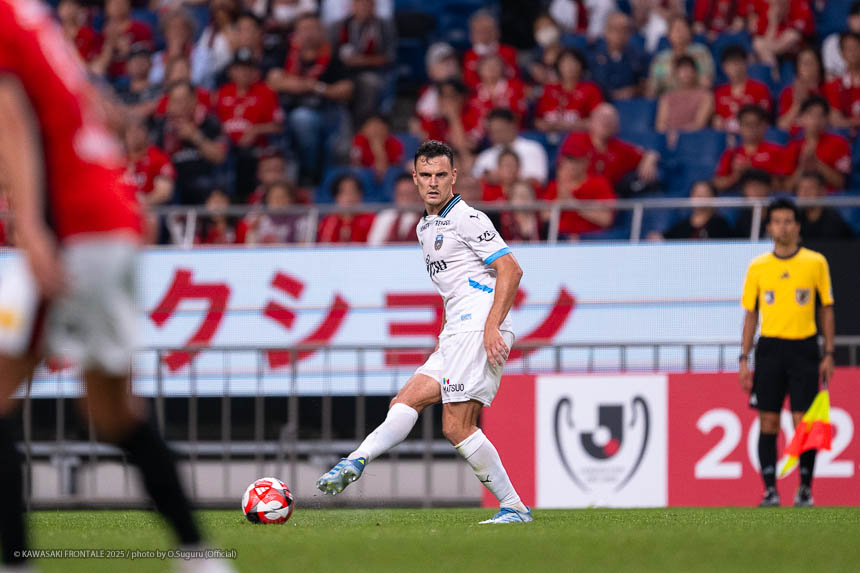 - 前半は根本(健太)選手のところで中途半端に行って簡単に裏を使われることが多かったので、後半からタツヤくん(伊藤達哉)となるべくサイドバックを使わせないような守備をしようと話していた。相手のセンターバックがけっこう距離をとってビルドアップしていて、ヤスくん(脇坂泰斗)とソウマ(神田奏真)の2人だけでは追いきれないので、サイドハーフがヘルプをしながらやらなければいけなかった。そこは自分たちで修正しながら第1戦を終えることができたのかなと思う。ただ自分たちから流れを悪くしてしまい、簡単に失点して嫌な流れになってしまった。ミーティングでもあったが浦和さんは後半に落ちてくると言われていたので、焦れずに戦って追いつくことができた。そういったところは第2戦も続けていきたい。