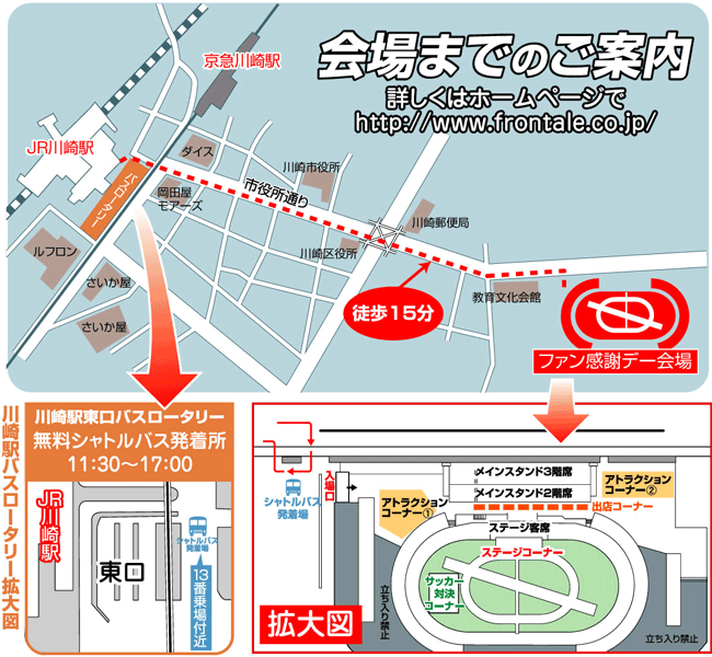 | 川崎競輪場(かわさきけいりんじょう) ≫地図はこちら (川崎市川崎区富士見2-1-6)JR川崎駅より徒歩15分 ※当日、【川崎駅東口バスローターリー13番付近】と【川崎競輪場】間を 専用シャトルバスが運行致します。≫シャトルバス発着所 (定員になり次第随時出発、11:30〜17:00の間で往復致します。乗車料無料。) ○ <駐車場> 川崎競輪場の入口の正面部分に、一般有料駐車場がございます。(180台程度収容) ※ファン感謝デー来場にあたっての割引等はございません。 ※その他、川崎駅周辺にも、多数一般有料駐車場がございます。 ○ <雨天時について> 雨天決行となります。 川崎競輪場の施設には一部屋根がついております。 雨天時は、ステージ・出店・ご来場の皆様の導線ともに屋根の下に移動し、 内容を一部変更して実施致します。 |