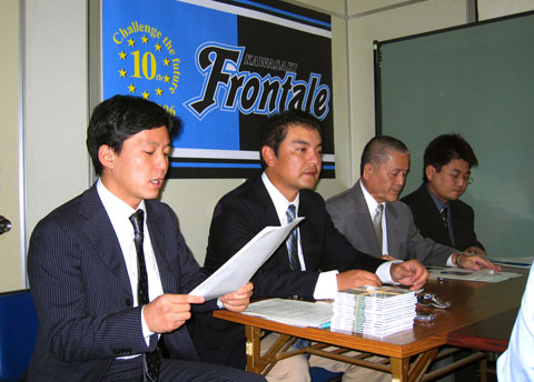 「川崎フロンターレは1996年11月21日に運営会社を設立し、1997年、シーズンをスタートしてから来年10年目のシーズンを迎えることとなります。最近のシーズンではみなさんご存知の通り、昨年のJ2リーグで最速のスピードで優勝をとげるなど、今シーズンJ1、1年目での上位争いと順風満帆できておりますが、その裏には98年の博多の森の悲劇や2000年でのJ1最下位によるJ2降格など幾多の厳しい道のりを乗り越えてきたことで現在の躍進している川崎フロンターレの姿となることができました。また、クラブとしてはサッカーを通してスポーツ文化を高めていきたいという信念の元、FOOTBALL TOGETHERを合言葉に数々のホームタウン活動を行ってきました。その活動を通して多くの川崎市民から支持をいただき、昨年は20万人の人々が等々力のホームゲームに来ていただきました。長くて短いこの10年の道のりを川崎フロンターレの活動を支えてくださった、市民、サポーター、スポンサーへの多大なる感謝とクラブの更なる飛躍を目指すために、2006年シーズンを10周年と位置付け、市民クラブ川崎フロンターレ創立10周年記念事業を実施いたします。記念事業を実施するにあたり、川崎フロンターレ、川崎フロンターレ後援会、川崎フロンターレ連携魅力づくり事業実行委員会、サポーターの4者からなる、川崎フロンターレ創立10周年記念事業合同プロジェクト実行委員会を9月15日に立ち上げました。この委員会は10周年事業の企画、調整、実施に関することを行ってまいります。2006年シーズンはさまざまな魅力あるイベントを実施してまいりますが、まずは代表的な各4つの事業につきまして本日発表させて頂きます。」 |