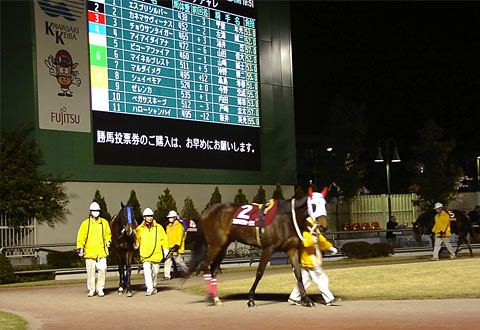 ・下見所において、この競走の出走馬の引き手きゅう務員がフロンターレユニフォームを着用します。
