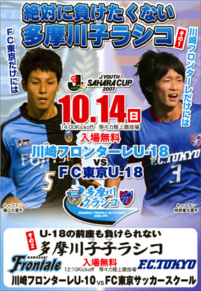10月28日(日)に予定されている多摩川クラシコ「J1リーグ 第30節 vsFC東京(味の素スタジアム)」の前哨戦として、10月14日(日)、等々力陸上競技場にて「Jユース 川崎フロンターレU-18 vs FC東京U-18」と、「川崎フロンターレU-10 vs FC東京サッカースクール」の2試合を入場無料にて開催致します!!