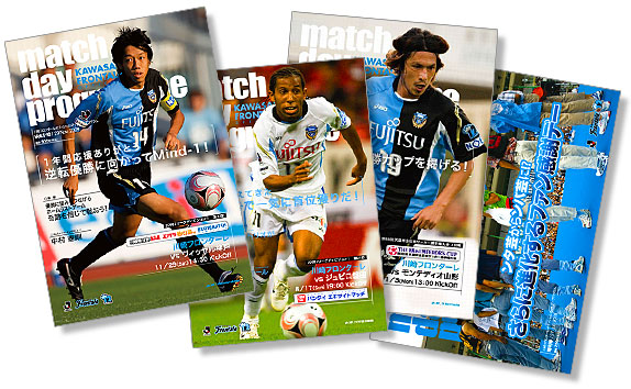 ホームゲーム開催時の等々力陸上競技場内で毎回販売しており、当日の試合の見どころや選手のインタビュー記事などを掲載する「マッチデープログラム」を今シーズンも株式会社イマジンより販売致します。若手有望株の選手にスポットを当てた新コーナーや、オフィシャル携帯サイト『モバイルフロンターレ』との連動企画など、さらに充実した誌面となっております。