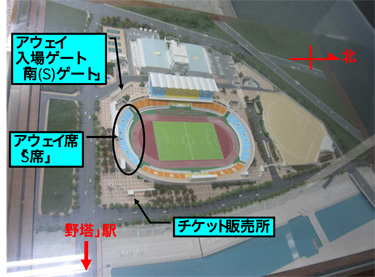 ◇退場ゲート:入場ゲートの「南(S)ゲート」の他、「野塔」駅に近いスタジアム南東「東(E)ゲート」側からも退場可能となる予定。