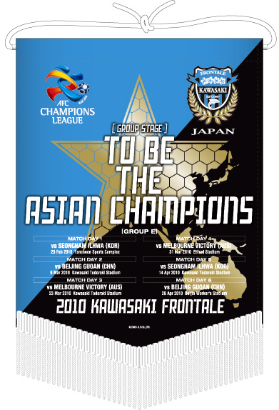 記念にほしいグッズといえば、やっぱりペナント! グループリーグの対戦チーム・試合日程がすべて書かれています。ちなみに「TO BE THE ASIAN CHAMPIONS」と「2010 KAWASAKI FRONTALE」の文字は、今年から新しくなったユニフォームのネーム・ナンバーと同じフォントなんですよ!