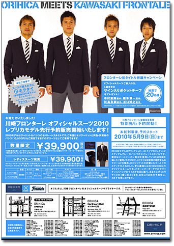 ご購入の際に、後援会会員様は、お手元に届くオフィシャルスーツ販売告知のチラシ(特典告知入り)、または川崎フロンターレ後援会会員カードをORIHICAショップ店員にご提示下さい。