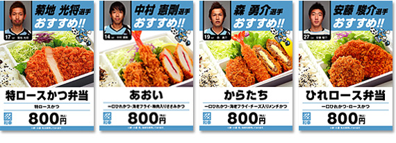 | 等々力市場にて | ◇販売場所 競技場内 バックスタンド10番ゲート付近「等々力市場」 ◇お弁当 ・特ロースかつ弁当(菊地選手) ・ひれロース弁当(安藤選手) ・からたち(森選手) ・あおい(中村選手) |